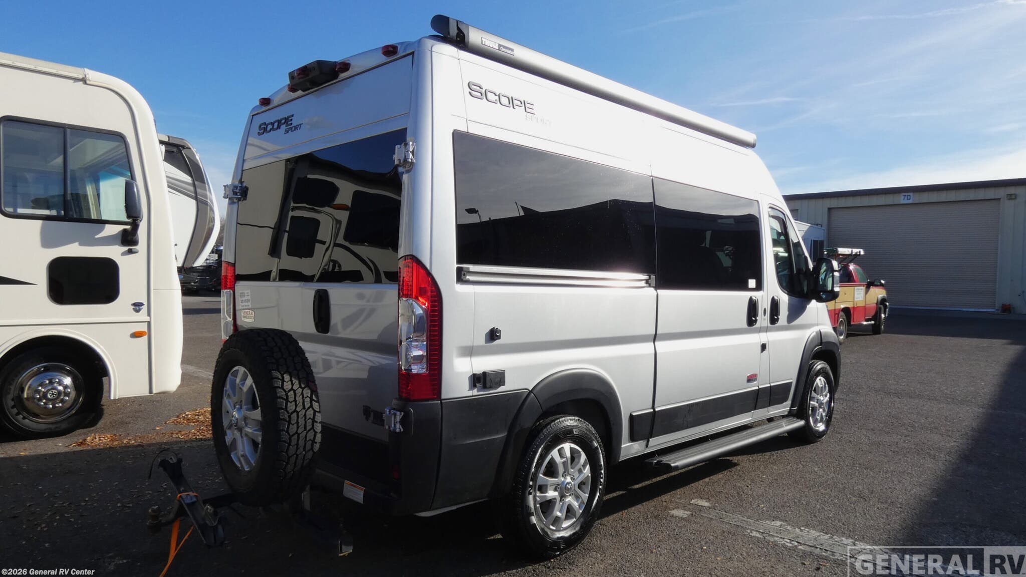 Thor Motor Coach Scope Sport 18M Class B gas motorhome highlights: Wet Bath Pull Out Bed Opening Window Two Burner Gas Cooktop You can go wherever your heart desires with this motorhome! The rear wet bath adds comfort and convenience, plus there is storage to keep your towels close. You can prepare home cooked meals in the two burner gas cooktop or in the microwave oven, and there is a 12V electric refrigerator for food storage. The factory cover, swivel captain's chairs are not only comfortable for driving, but also for socializing with guests. The 72" x 47" pull out bed has a removable table where you can dine or set your laptop up! Each one of these Thor Motor Coach Scope Sport Class B gas motorhomes are built for those who want to explore the great outdoors in comfort! They are front wheel drive and constructed with a RAM Promaster 1500 XT chassis, plus a 5,000 lb. trailer hitch with 4-pin connector so you can haul even more items with you. The side steps make it easier to enter and exit the units, and the entryway screen door is an added bonus. The Sport Edition features patio awning prep, blackout zipper window shades, pressed countertops, slab style cabinet doors, and more convenient amenities. And you're sure to stay powered up by the 1000-watt inverter, 2800 gas generator, and 30-amp detachable shoreline power cord!