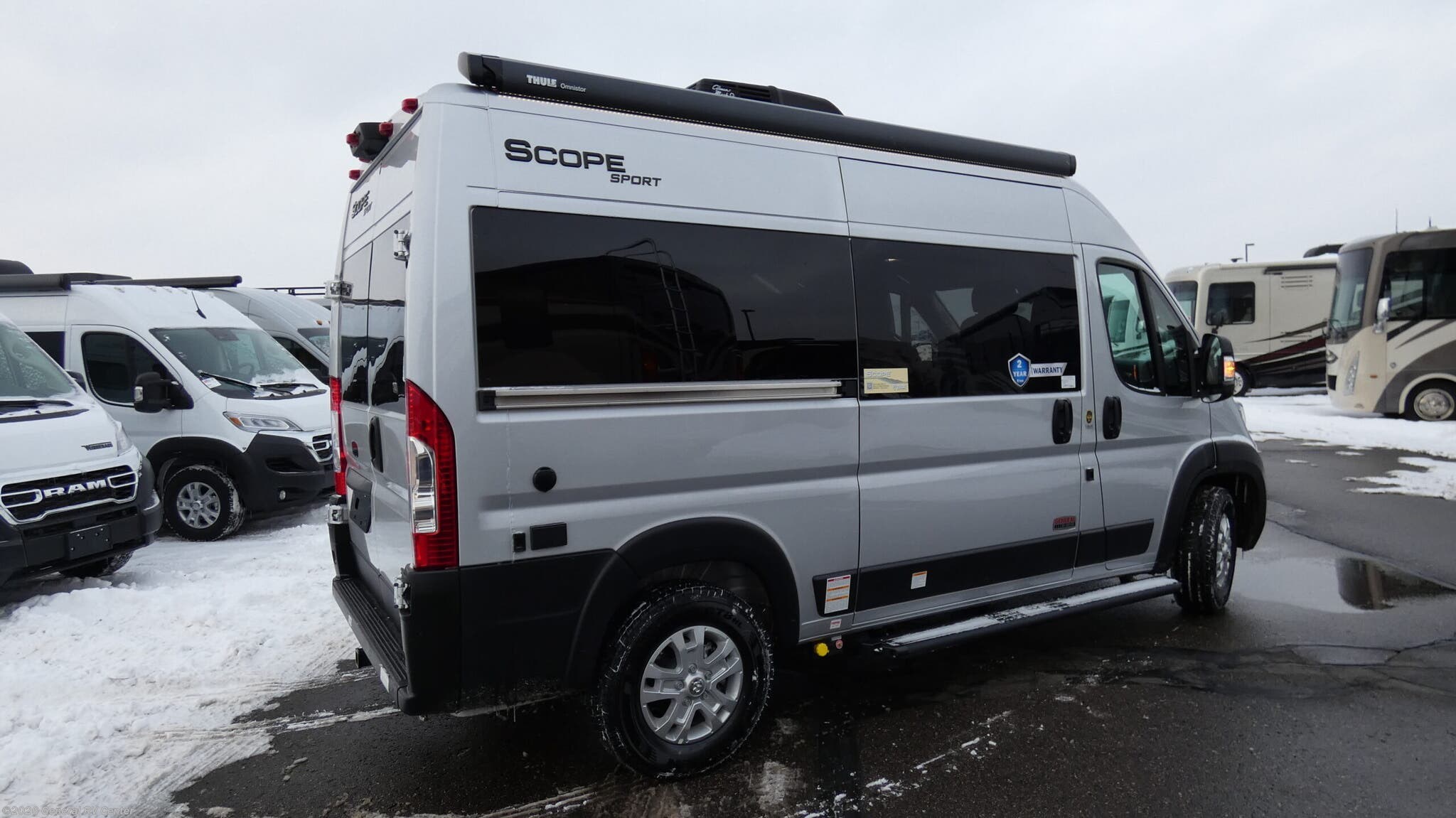 Thor Motor Coach Scope Sport 18M Class B gas motorhome highlights: Wet Bath Pull Out Bed Opening Window Two Burner Gas Cooktop You can go wherever your heart desires with this motorhome! The rear wet bath adds comfort and convenience, plus there is storage to keep your towels close. You can prepare home cooked meals in the two burner gas cooktop or in the microwave oven, and there is a 12V electric refrigerator for food storage. The factory cover, swivel captain's chairs are not only comfortable for driving, but also for socializing with guests. The 72" x 47" pull out bed has a removable table where you can dine or set your laptop up! Each one of these Thor Motor Coach Scope Sport Class B gas motorhomes are built for those who want to explore the great outdoors in comfort! They are front wheel drive and constructed with a RAM Promaster 1500 XT chassis, plus a 5,000 lb. trailer hitch with 4-pin connector so you can haul even more items with you. The side steps make it easier to enter and exit the units, and the entryway screen door is an added bonus. The Sport Edition features patio awning prep, blackout zipper window shades, pressed countertops, slab style cabinet doors, and more convenient amenities. And you're sure to stay powered up by the 1000-watt inverter, 2800 gas generator, and 30-amp detachable shoreline power cord!