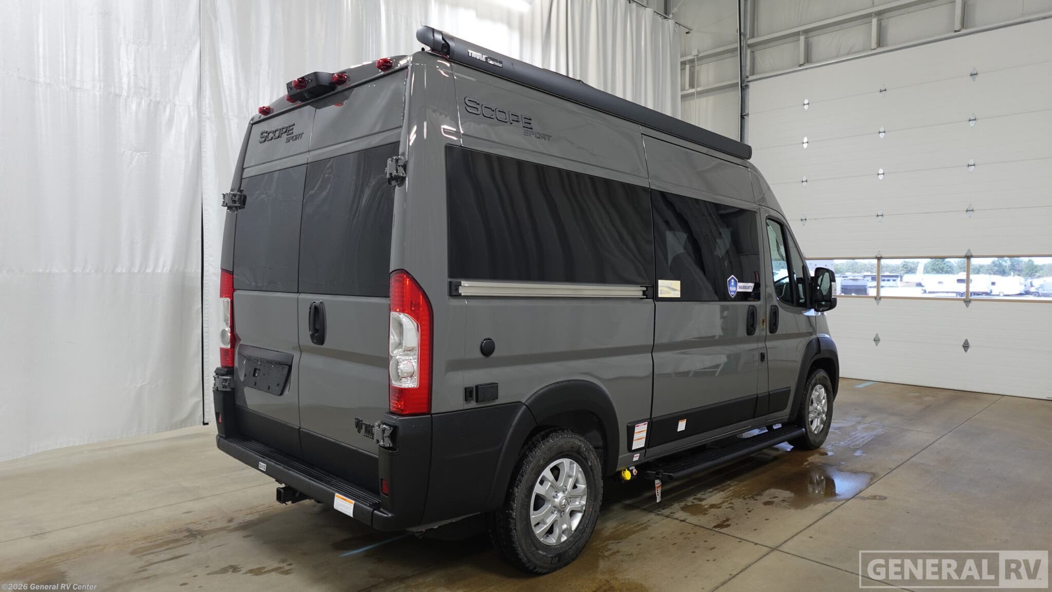 Thor Motor Coach Scope Sport 18M Class B gas motorhome highlights: Wet Bath Pull Out Bed Opening Window Two Burner Gas Cooktop You can go wherever your heart desires with this motorhome! The rear wet bath adds comfort and convenience, plus there is storage to keep your towels close. You can prepare home cooked meals in the two burner gas cooktop or in the microwave oven, and there is a 12V electric refrigerator for food storage. The factory cover, swivel captain's chairs are not only comfortable for driving, but also for socializing with guests. The 72" x 47" pull out bed has a removable table where you can dine or set your laptop up! Each one of these Thor Motor Coach Scope Sport Class B gas motorhomes are built for those who want to explore the great outdoors in comfort! They are front wheel drive and constructed with a RAM Promaster 1500 XT chassis, plus a 5,000 lb. trailer hitch with 4-pin connector so you can haul even more items with you. The side steps make it easier to enter and exit the units, and the entryway screen door is an added bonus. The Sport Edition features patio awning prep, blackout zipper window shades, pressed countertops, slab style cabinet doors, and more convenient amenities. And you're sure to stay powered up by the 1000-watt inverter, 2800 gas generator, and 30-amp detachable shoreline power cord!
