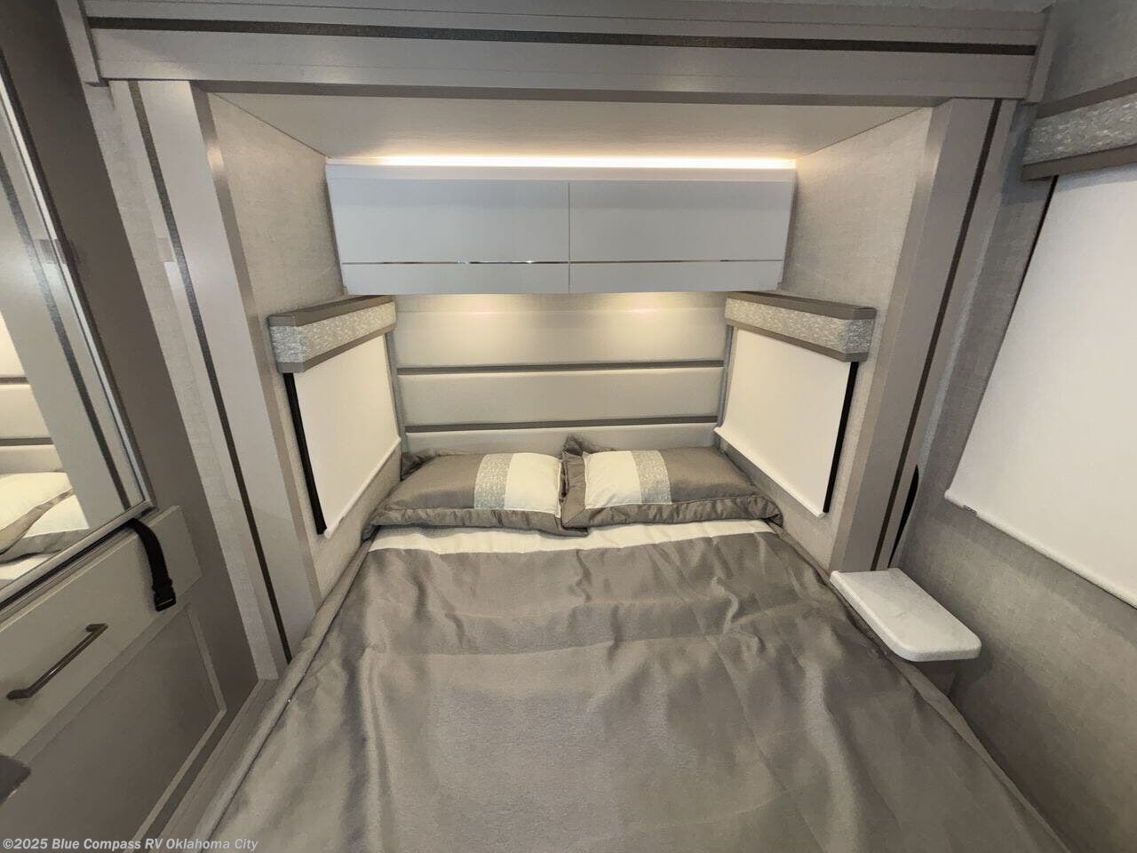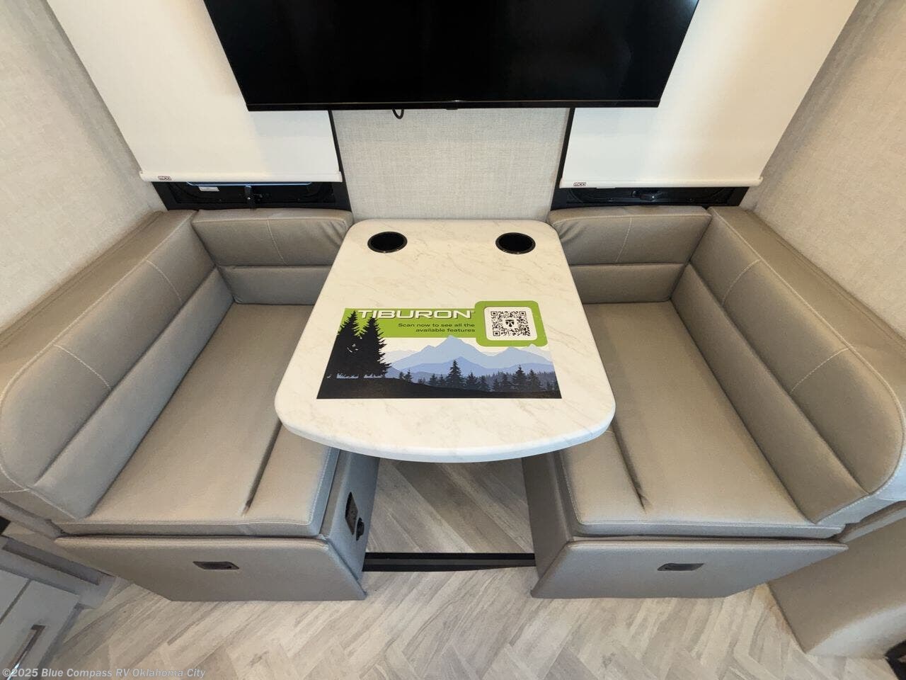 Whatever you want to do and wherever you want to go, take this Tiburon Sprinter Class C diesel motorhome with you! It will offer you a high level of comfort and an exceptional amount of convenience with its many unique additions, like the USB charging port, the window privacy roller shades, telescoping ladder for the bunk above the cab, and the flip-up countertop extension in the kitchen. Sit back and relax on the theater seating and the 68.5" dinette, and enjoy some entertainment from the 39" LED TV. The separated bathroom has the toilet and vanity on one side of the coach and the 24" x 32" shower on the other, and the private bedroom has a flip-up full size bed slide for more interior space, plus a wardrobe for your clothes.