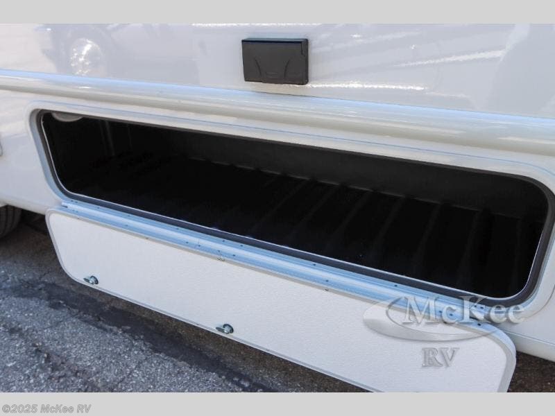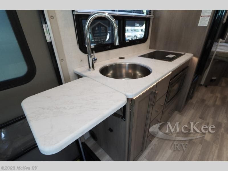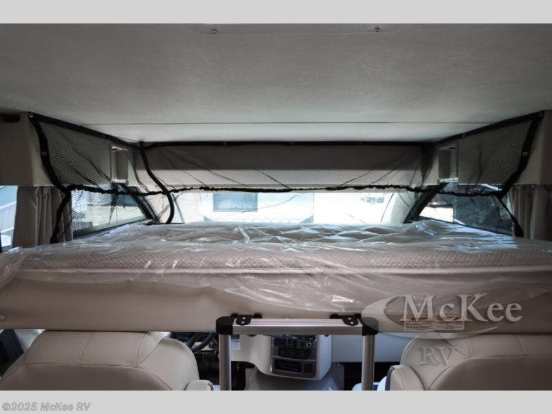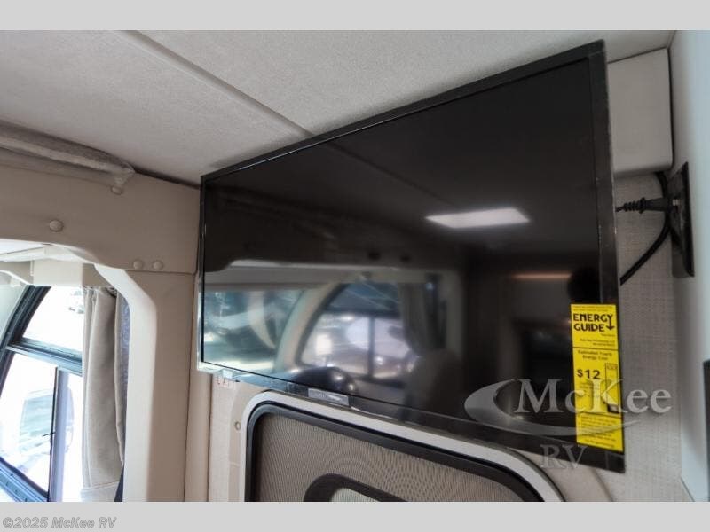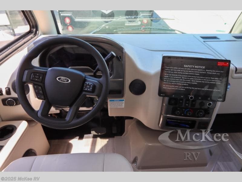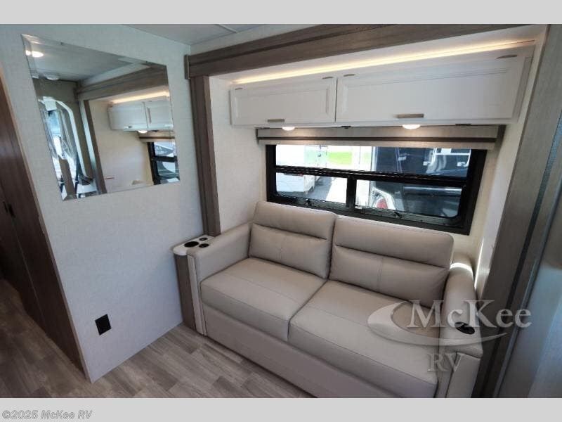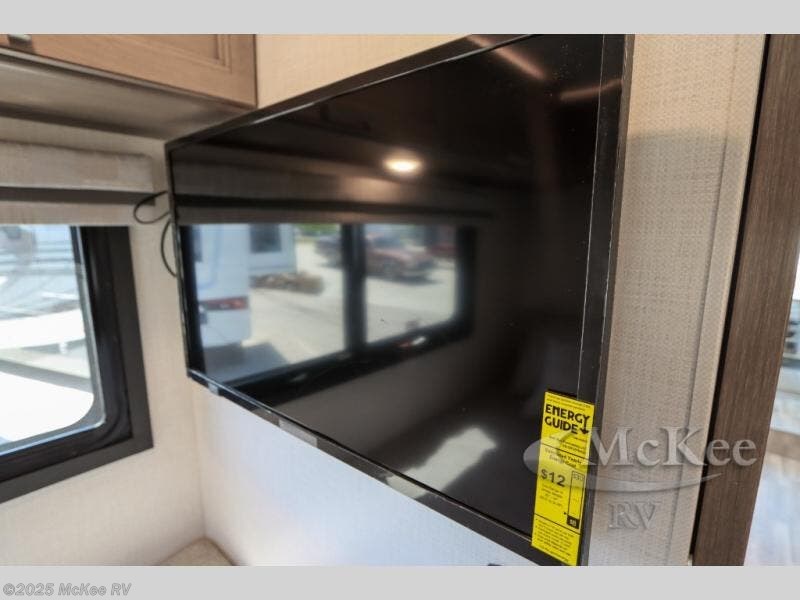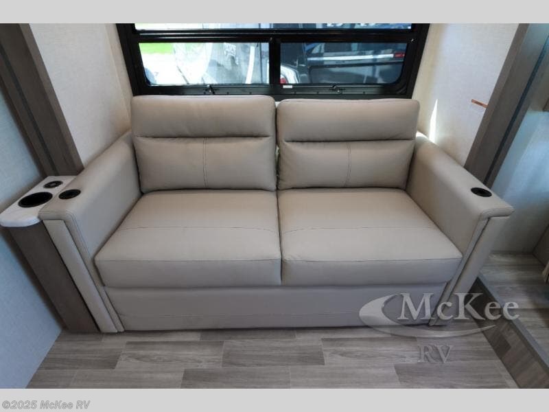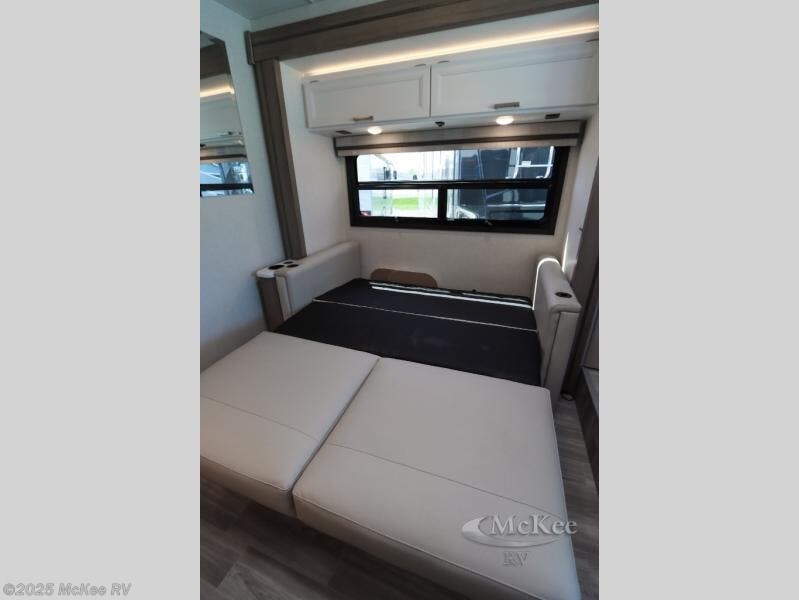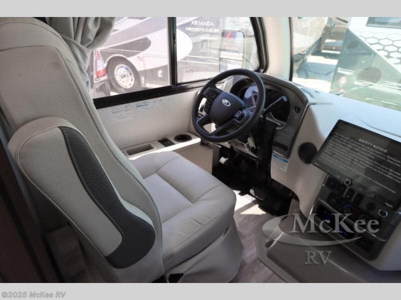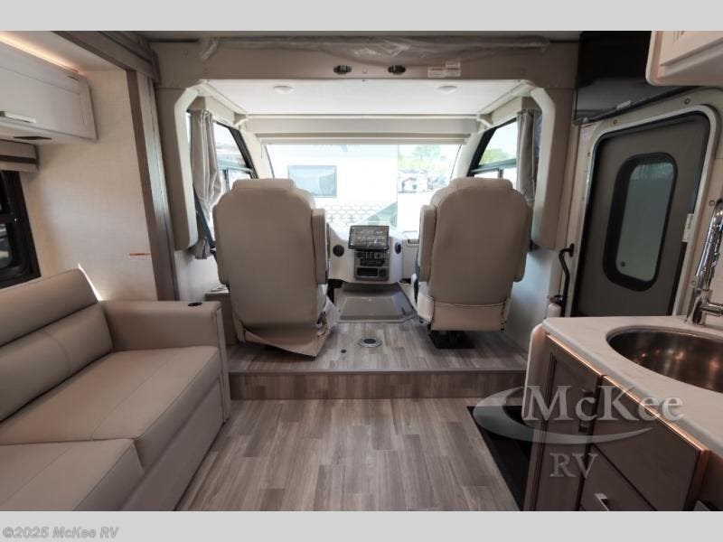 The front cab of this Vegas Class A gas motorhome is excellently appointed with a stow-away coffee table, reclining/swivel leatherette captain's chairs, and a 10" touchscreen dash radio with Bluetooth, Android Auto, and Apple CarPlay! A single slide holds the 68" sofa bed so that it isn't in your way as you walk back to the semi-private bedroom. The kitchen offers you a two burner cooktop to sauté veggies, and there are two Smart TVs to provide you with all the entertainment you could need. Within the full bath you'll find a 27" x 27" radius shower with a skylight, a stainless steel bath sink, and a 12V power bath vent to keep this space fresh.