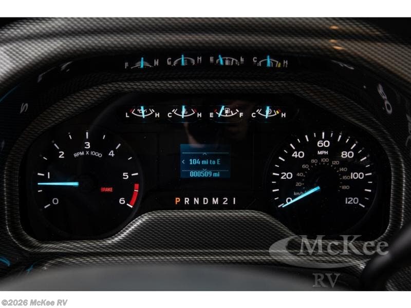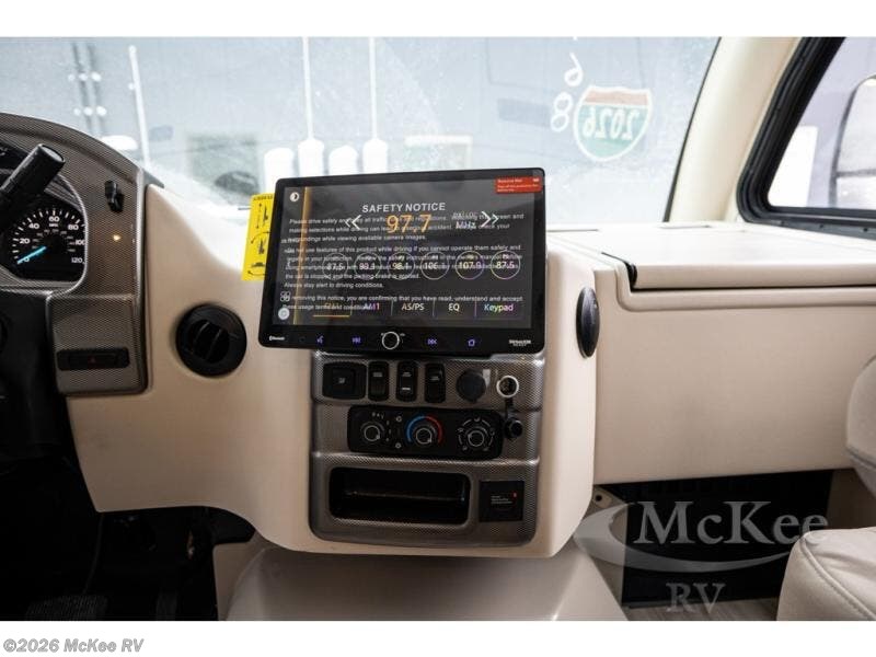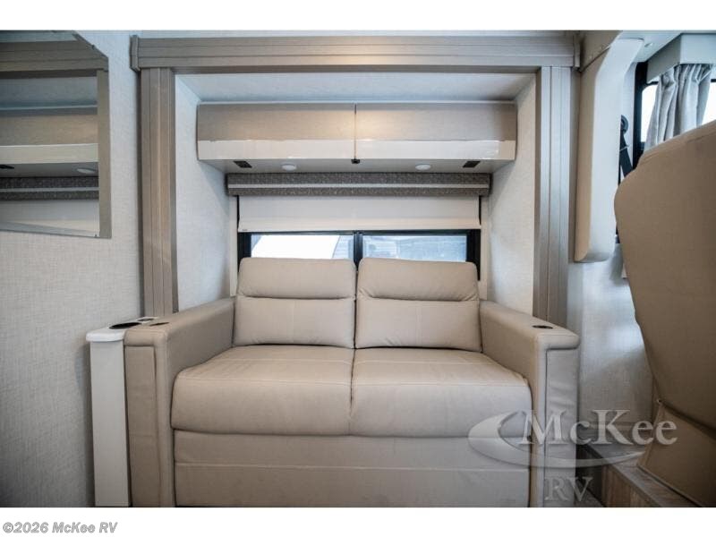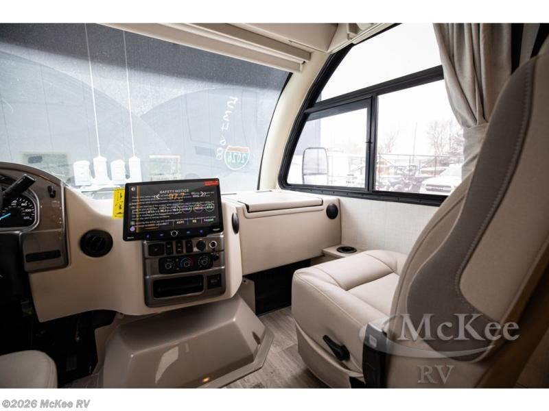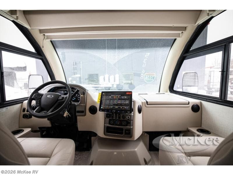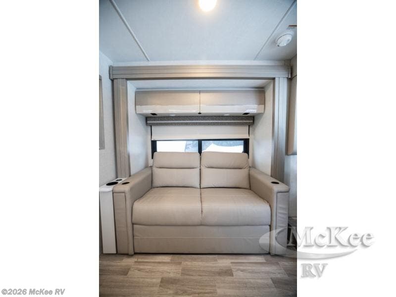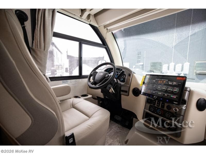 The front cab of this Vegas Class A gas motorhome is excellently appointed with a stow-away coffee table, reclining/swivel leatherette captain's chairs, and a 14" touchscreen dash radio with Bluetooth, Android Auto, and Apple CarPlay! A single slide holds the 68" sofa bed so that it isn't in your way as you walk back to the semi-private bedroom. The kitchen offers you a two burner cooktop to sauté veggies, and there are two Smart TVs to provide you with all the entertainment you could need. Within the full bath you'll find a 27" x 27" radius shower with a skylight, a stainless steel bath sink, and a 12V power bath vent to keep this space fresh.