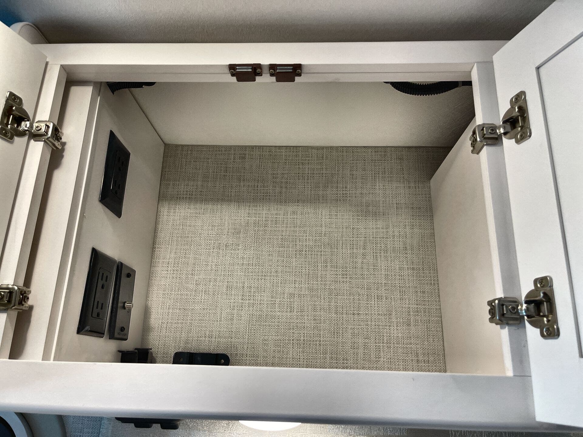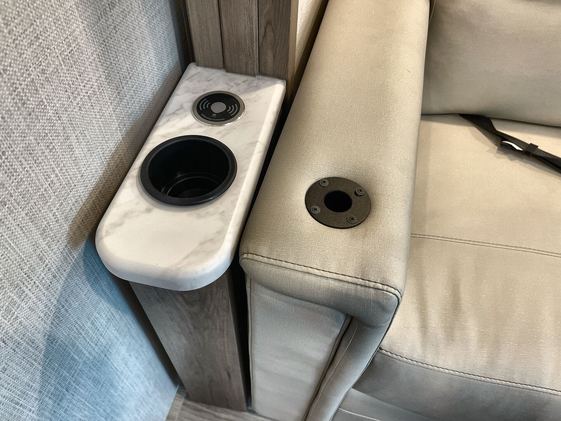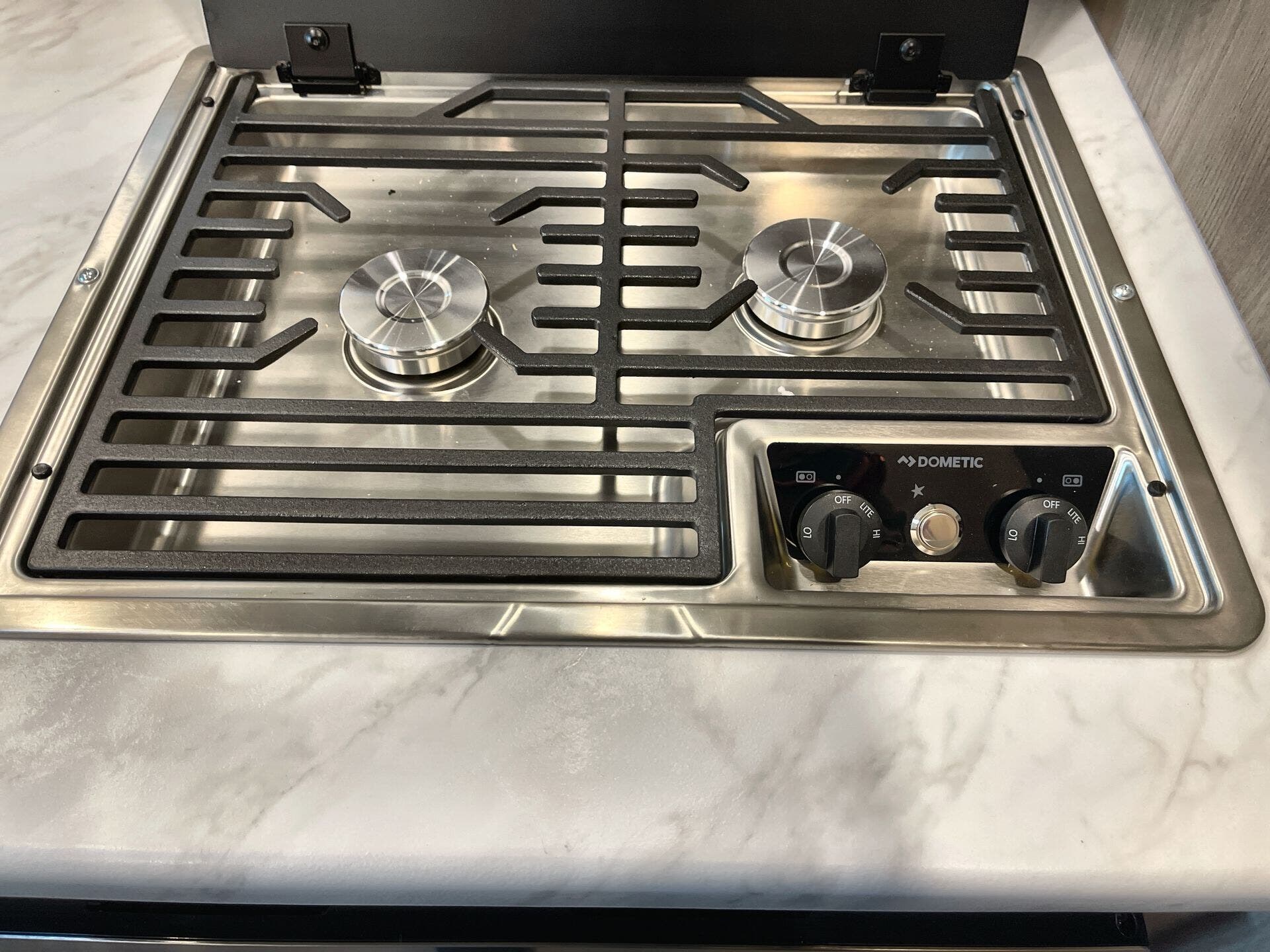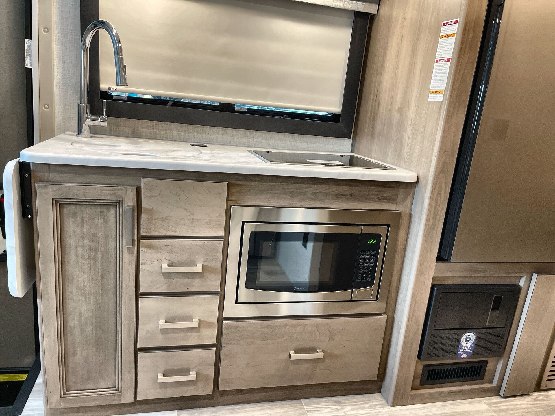 - Convection microwave, refrigerator, stove top burner, and water heater for convenient, home-like cooking