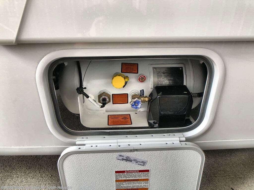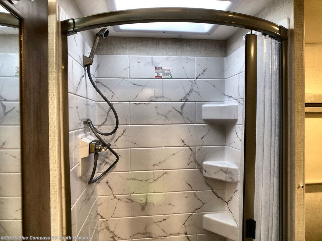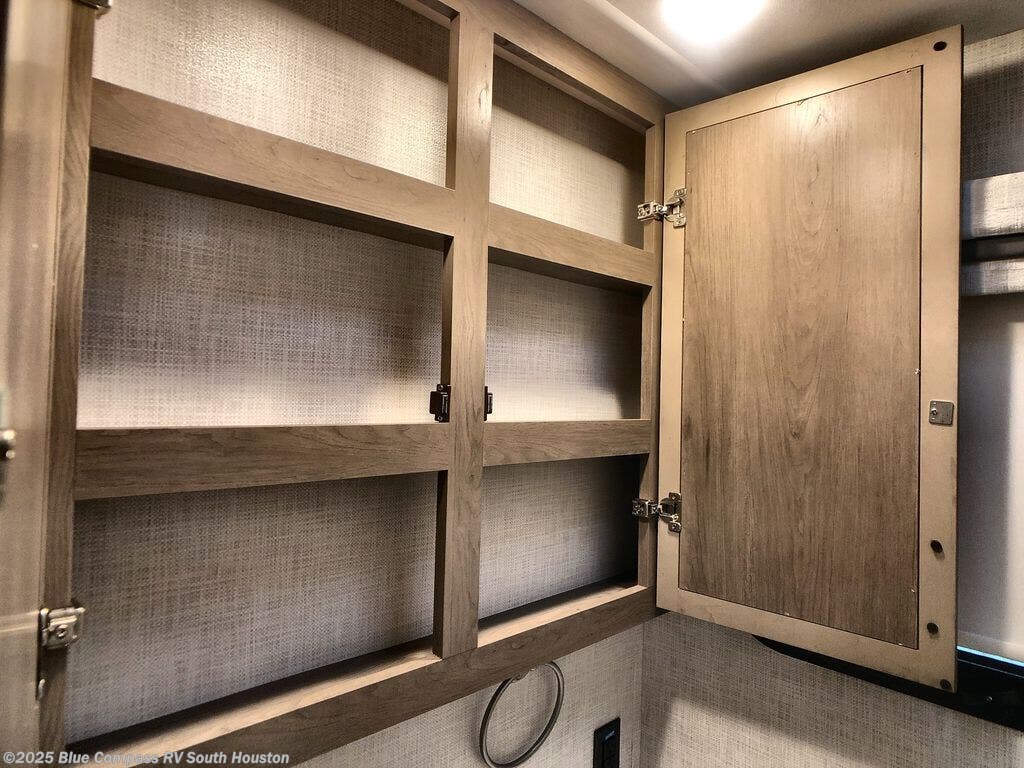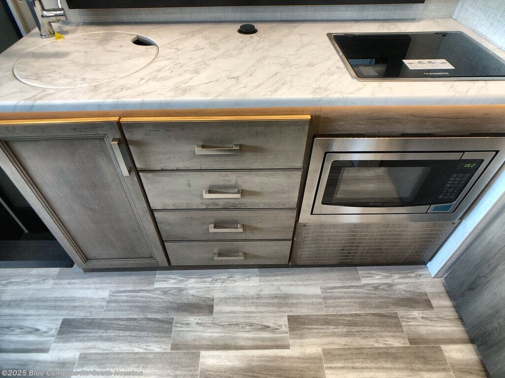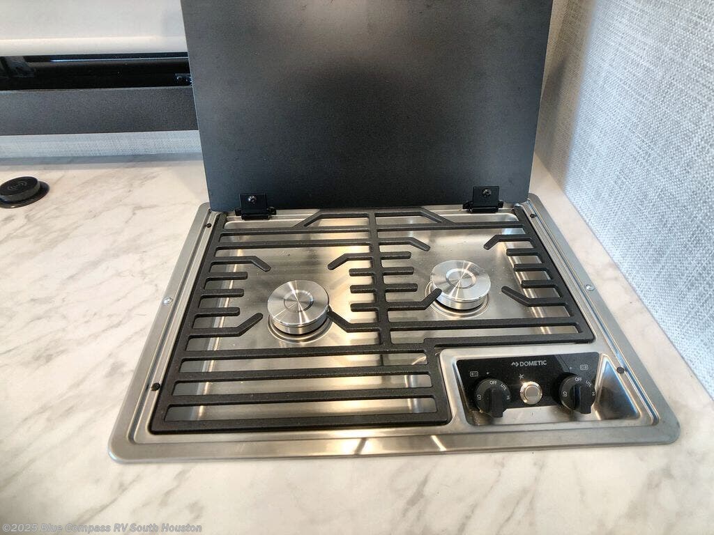 You're going to love the interior and exterior amenities found with this coach! The 73.7 cu. ft. of exterior storage will allow you to bring along hiking and fishing gear, and you can add an optional slide out griddle if you enjoy cooking outdoors. Once you unpack and head inside, you can relax on the theater seating. And a 32" Smart TV is across from the sofa for easy viewing! It will be so easy to prepare meals each day in the kitchen with its two burner gas cooktop and convection microwave with an air fryer, and the 12V double door refrigerator can keep food fresh. You'll appreciate the rear bedroom with a privacy curtain, an RV queen bed, plus dual closets to keep your clothes wrinkle free. This model also includes an independent shower across from the private toilet and sink, allowing two people to freshen up at once!