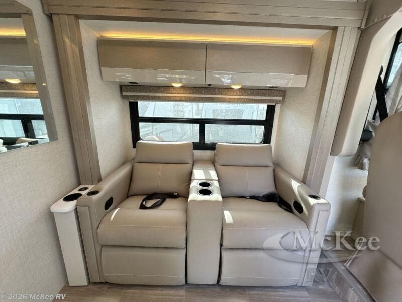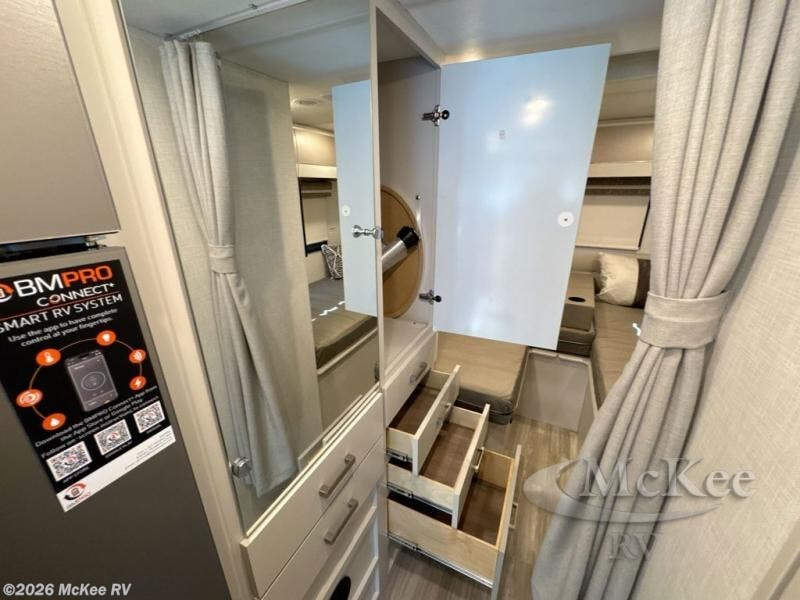 This coach has a similar layout to 24.1, but you'll enjoy theater seating in this model, two closets instead of one, and a larger exterior length for more space! The twin beds with king conversion make it possible to travel as friends or a couple, and there is even a bedroom TV so you can watch movies in bed. In the morning, you can make breakfast on the two burner gas cooktop or in the convection microwave with an air fryer. There is a 12V double door refrigerator to keep your perishables fresh, and you can dine at the theater seating with a removable pedestal table. This coach also includes a drop-down overhead bunk for more sleeping space; how convenient!