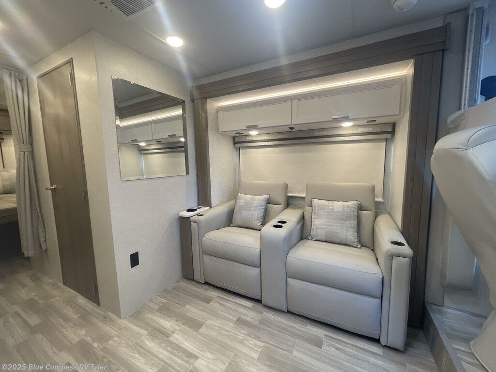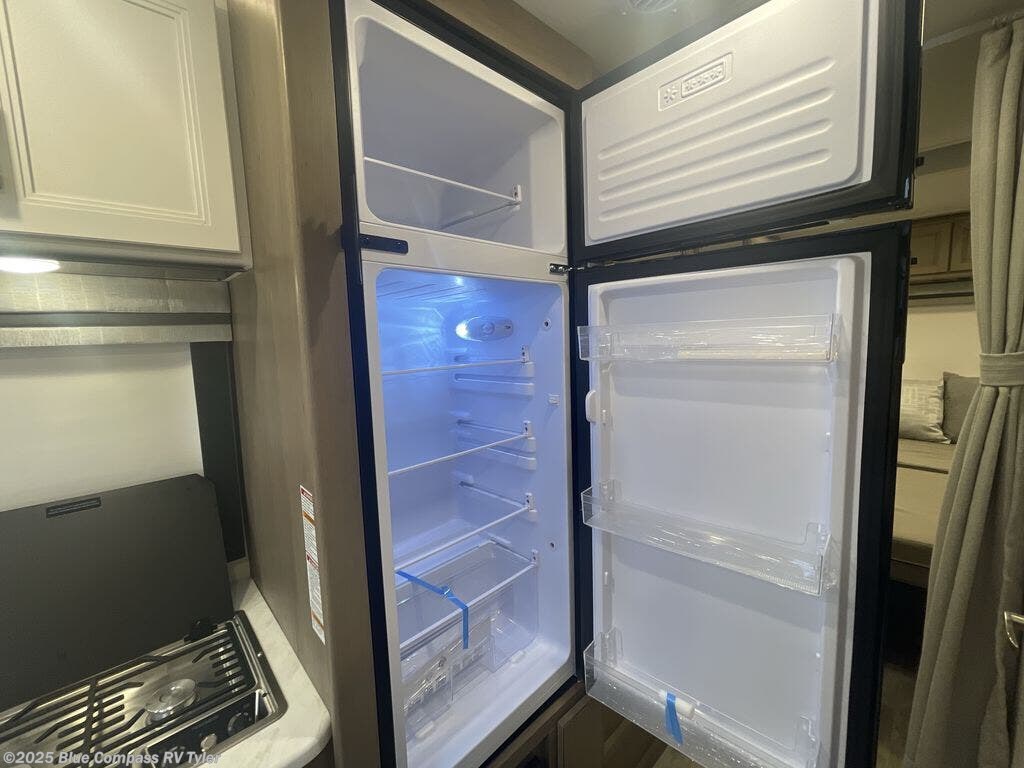 This coach has a similar layout to 24.1, but you'll enjoy theater seating in this model, two closets instead of one, and a larger exterior length for more space! The twin beds with king conversion make it possible to travel as friends or a couple, and there is even a bedroom TV so you can watch movies in bed. In the morning, you can make breakfast on the two burner gas cooktop or in the convection microwave with an air fryer. There is a 12V double door refrigerator to keep your perishables fresh, and you can dine at the theater seating.