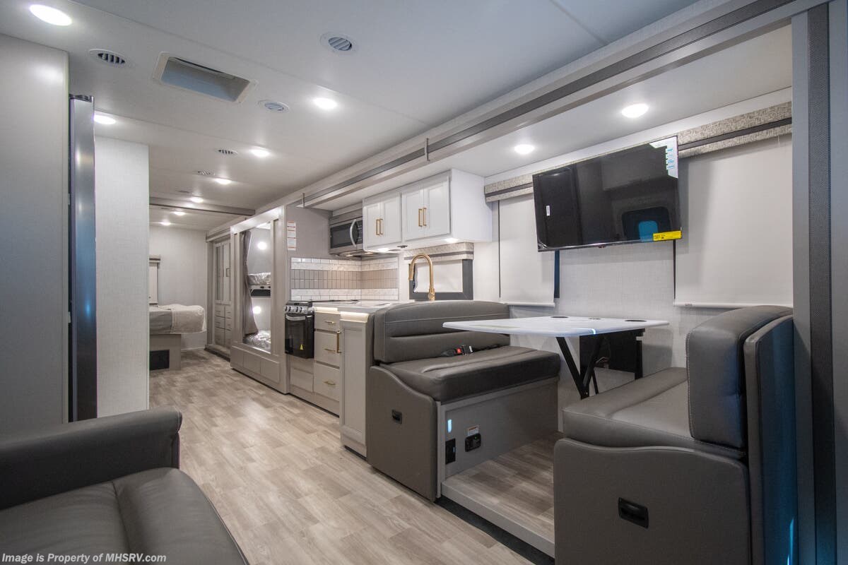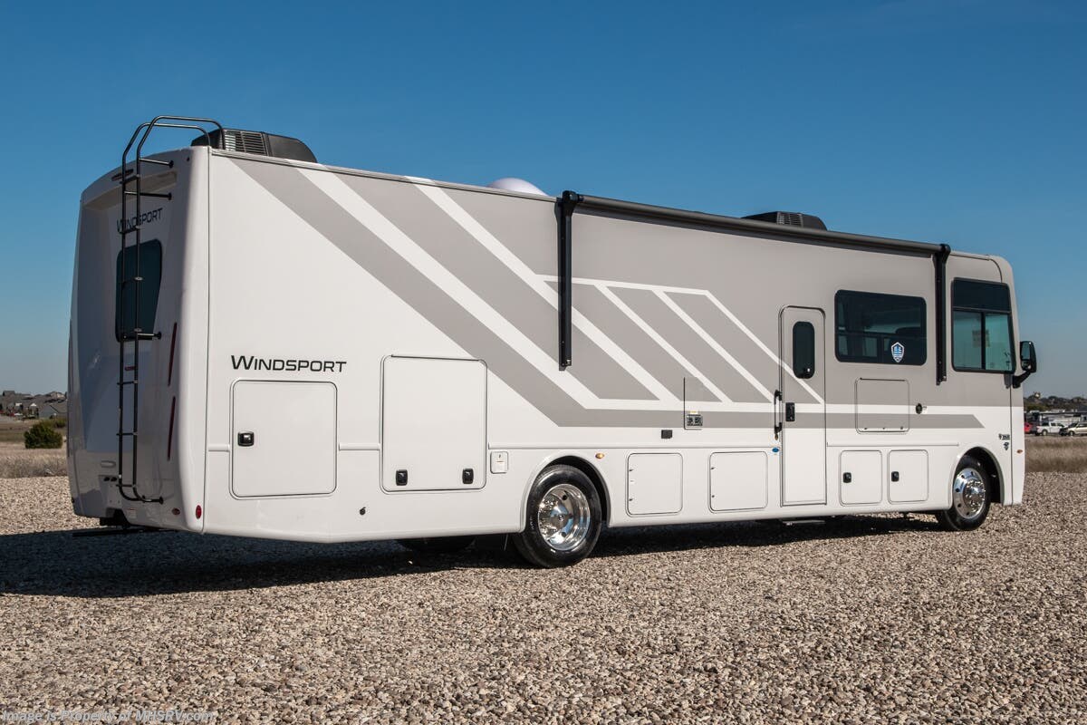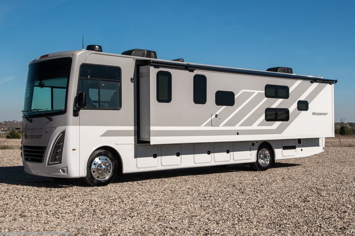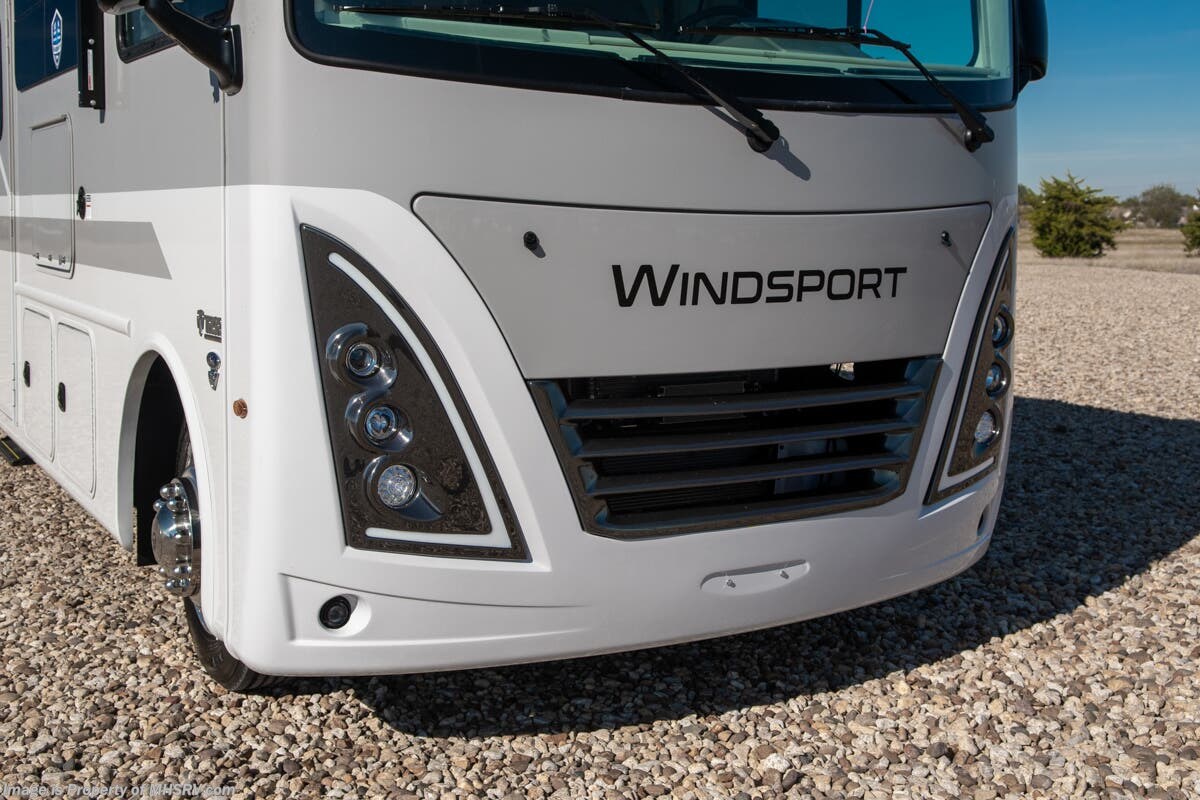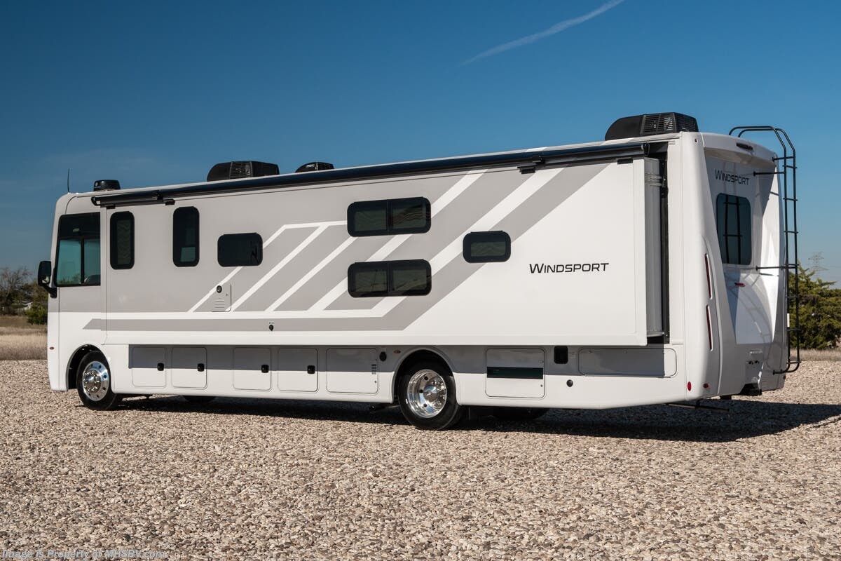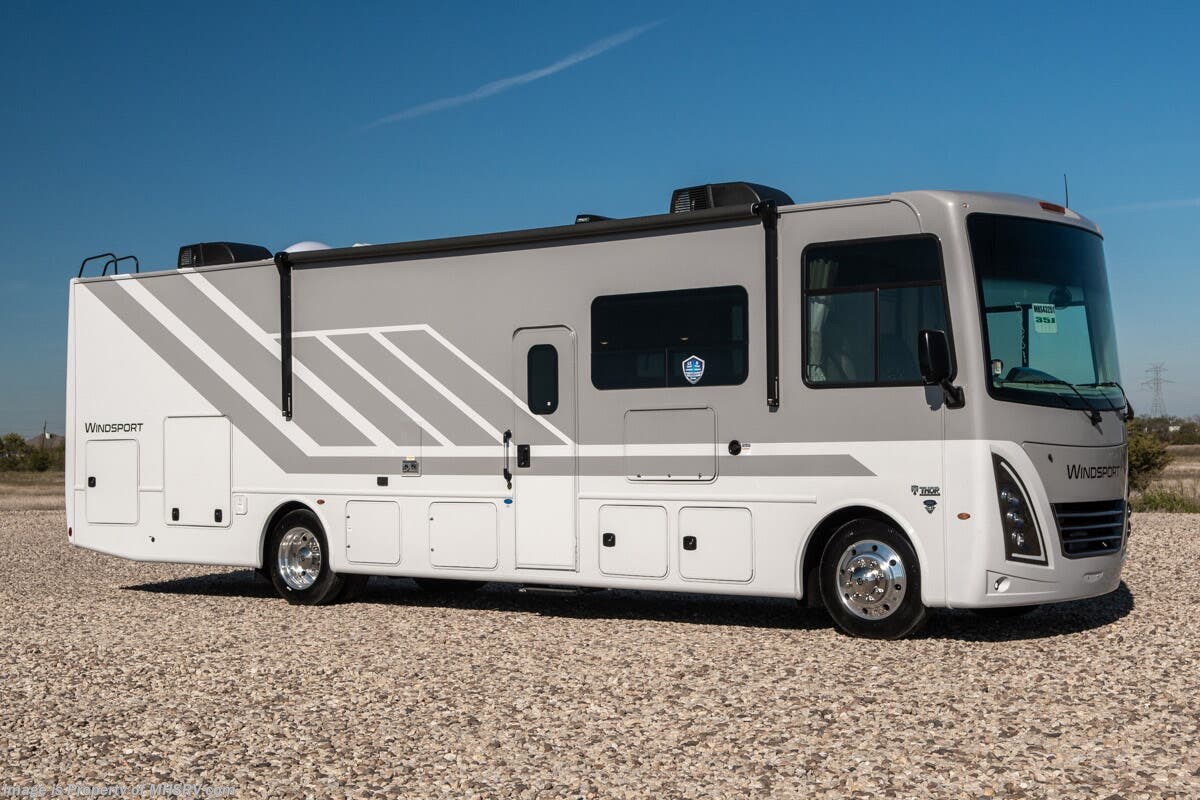 - Frameless Dual Pane Windows Shop hundreds of motorhomes including Class A RVs at MHSRV! Choose from Thor A.C.E. – Resonate – Hurricane – Windsport – Luminate – Indigo – Vegas – Axis – Challenger – Miramar Fleetwood Flair – Fortis – Flex – Bounder - Forest River Georgetown - FR3 – Entegra Coach Vision – Vision XL – Emblem – Holiday Rambler Admiral – Eclipse – Invicta – Vacationer - and much more. We also sell quality pre-owned models such as Jayco Alante SE – Alante – Precept – Precept Prestige – Tiffin Allegro Open Road – Newmar Canyon Star – Bay Star – Winnebago Vista – Sunstar – Adventurer – Coachmen Mirada – Pursuit - Encore and much more. Visit for our complete line-up and the sale prices that have made us the #1 volume selling motor home dealership in the world 12 years in a row! About This RV This RV is approximately 35 feet in length with 9 slides including a king size bed, bunk beds, exterior kitchen, full wall slide and automatic leveling jacks. This beautiful new motorhome also features the new Ford chassis with 7.3L PFI V-8, a 6-speed TorqShift® automatic transmission, an updated instrument cluster, automatic headlights and a tilt/telescoping steering wheel. The Thor Motor Coach Windsport RV also features tinted one-piece windshield, multiple USB charging ports throughout, Winegard ConnecT WiFi extender +4G, heated and enclosed underbelly, black tank flush, LED ceiling lighting, bedroom TV, LED running and marker lights, power driver's seat, power overhead loft, power patio awning with LED lighting, night shades, flush covered glass stovetop, refrigerator, microwave, and much more. About Us For more details on this unit, our full inventory, brochures, window stickers, videos, photos, and customer reviews, visit or call 800-335-6054 for the Texas location or 334-288-0331 for our Alabama location. At Motor Home Specialist, we never charge prep or orientation fees. Every new RV sale includes a multi-point inspection, full interior and exterior detail. At our Texas location we also offer a high-pressure rain booth test—an exclusive service in the industry. You'll also receive a comprehensive coach orientation with an MHSRV technician and a complimentary night in our delivery park with full hook-ups at our Texas Location. --Why Pay More? Why Settle for Less?—