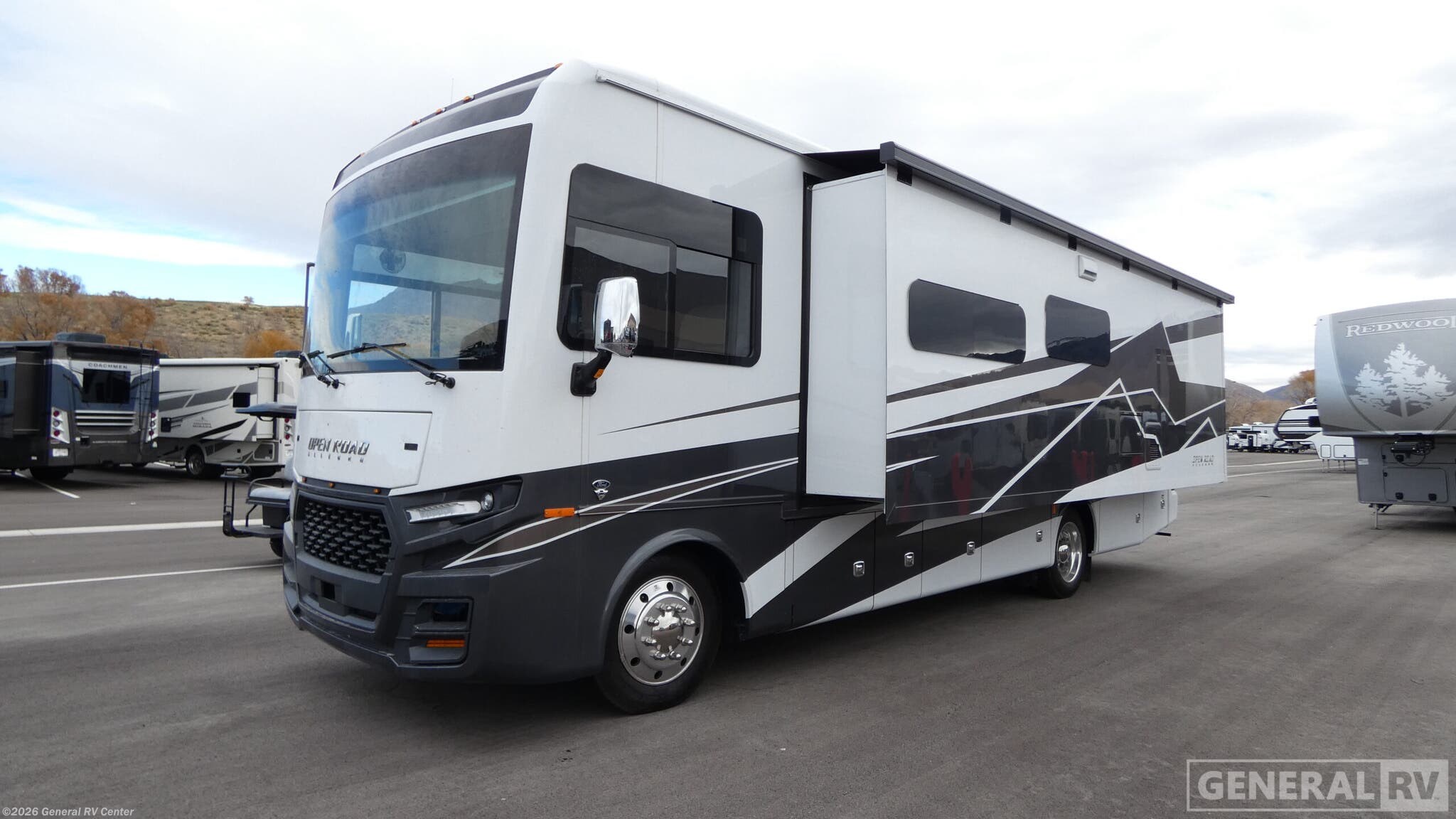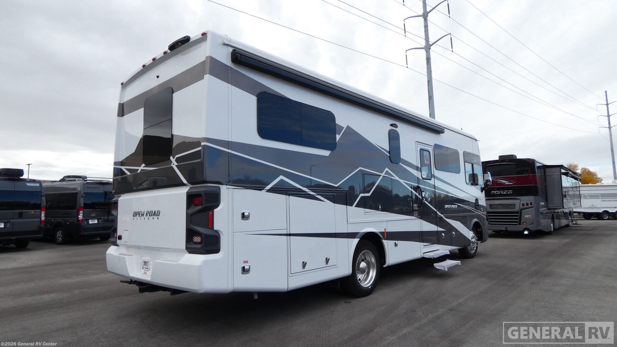 Experience the open road like never before with the 2026 Tiffin Open Road Allegro 29 NA. This luxurious motorhome combines comfort and functionality, ensuring every journey is as enjoyable as the destination. At 32 feet in length, it offers a spacious interior with a smart layout that includes a center kitchen, front living area, and a cozy rear bedroom. The kitchen is equipped with a full-size electric refrigerator and a three-burner cooktop, perfect for preparing meals on the go. The powered retractable awning invites you to relax outside, creating the perfect spot for enjoying the great outdoors. Inside, the Open Road Allegro is designed for relaxation and entertainment. The front living area features theater seating and a booth dinette that converts into an additional sleeping space. With accommodations for up to seven, including a king bed, you'll have plenty of room for family and friends. The center bath offers convenience with its stylish plastic and glass shower. Built on a robust Ford F53 chassis with a 335-horsepower engine, this RV delivers power and reliability, making it a fantastic choice for both weekend getaways and extended adventures. For more information, visit your nearest General RV dealership.