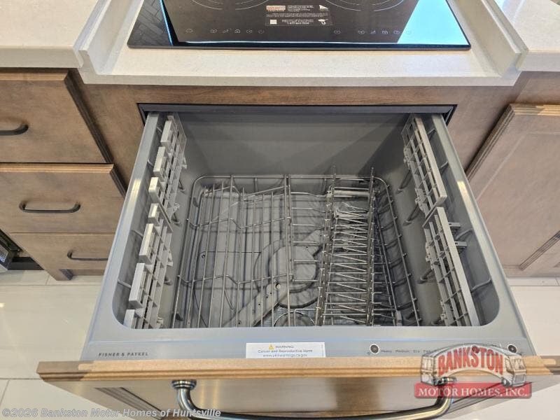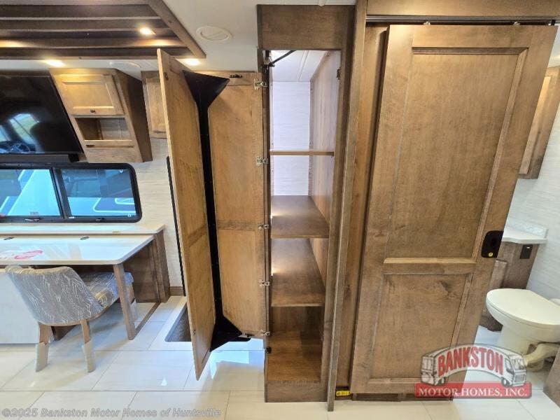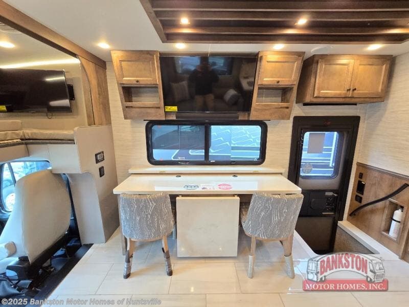 The rear bedroom features a spacious king bed for restful sleep, a wardrobe for storing clothing and essentials, a TV with a bank of drawers below for convenient storage, and an additional closet for extra storage or a washer and dryer prep. The full bathroom provides all the amenities you need for a comfortable trip. The luxurious kitchen is equipped with a residential refrigerator for keeping food and drinks fresh, overhead cabinets for storage, and a two-burner cooktop for culinary creativity. The theater seating with murphy bed provides a comfortable spot to relax or sleep, while the dinette bar is perfect for meals or having a nice drink. The mounted overhead TV is great for entertainment, while you rest in the comfortable overhead bunk perfect for kids or guests.