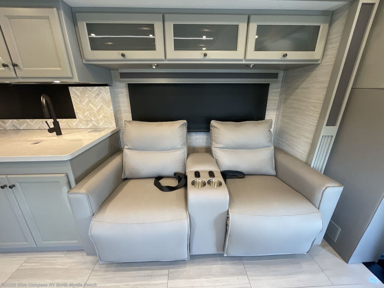 The rear bedroom features a spacious king bed for restful sleep, a wardrobe for storing clothing and essentials, a TV with a bank of drawers below for convenient storage, and an additional closet for extra storage or a washer and dryer prep. The full bathroom provides all the amenities you need for a comfortable trip. The luxurious kitchen is equipped with a residential refrigerator for keeping food and drinks fresh, overhead cabinets for storage, and a two-burner cooktop for culinary creativity. The theater seating with murphy bed provides a comfortable spot to relax or sleep, while the dinette bar is perfect for meals or having a nice drink. The mounted overhead TV is great for entertainment, while you rest in the comfortable overhead bunk perfect for kids or guests.