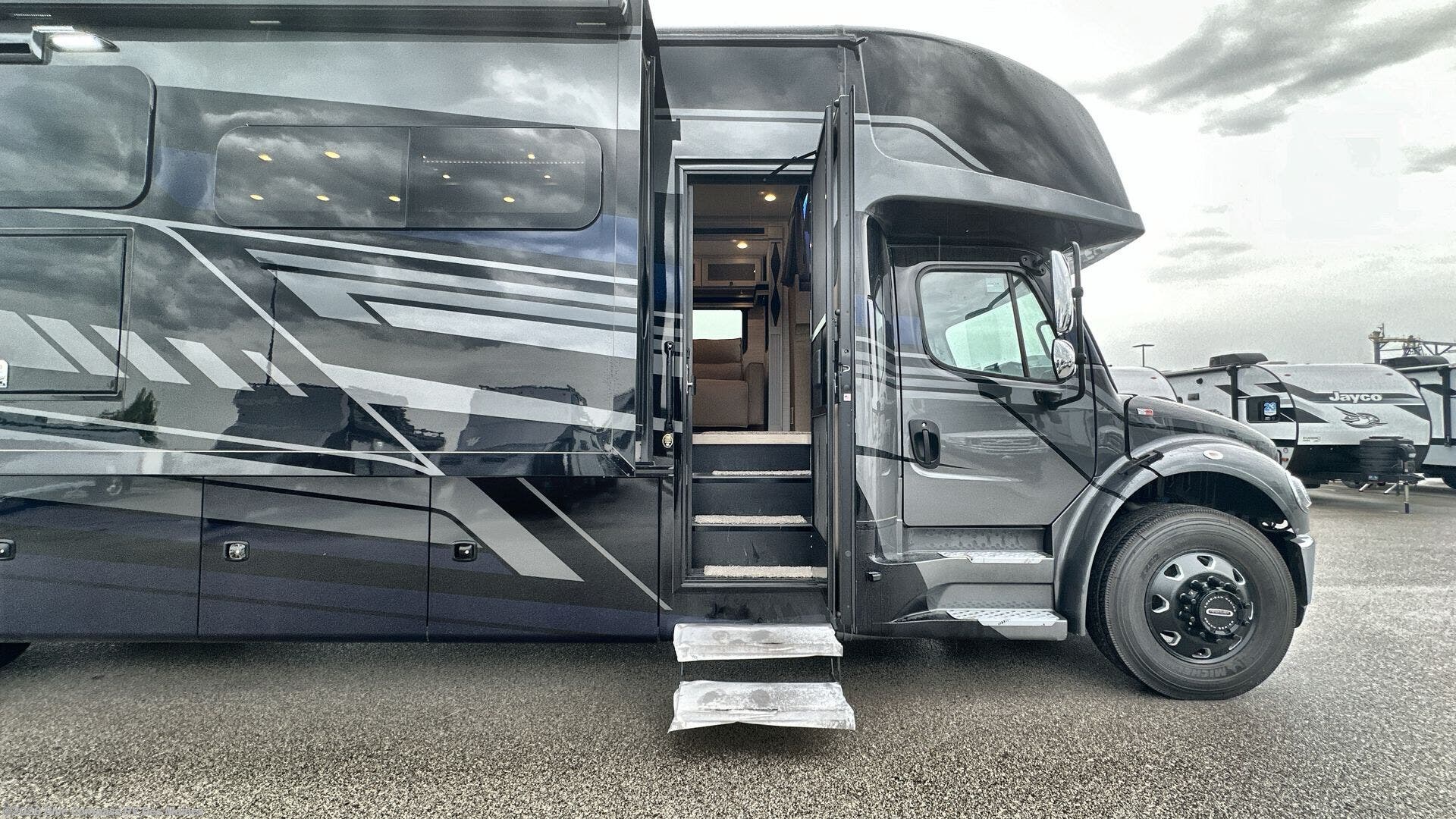 Each Allegro Bay Super C diesel coach by Tiffin Motorhomes sits on a durable Freightliner Custom S2RV chassis with an impressive 360 HP Cummins B6.7 engine for power you can feel. You will appreciate smooth handling thanks to the Trac-Tech full-time NoSPIN differential single rear axle and the automatic traction control. There is a manual release valve for the rear air suspension for added convenience, plus a 12,000 lb. towing capacity that will allow you to bring along the family car or even a horse trailer! This coach includes a Truma AquaGo Comfort instant water heater, AGM extended cycle house batteries, an 8.0 Onan Quiet Diesel generator, plus many more top of the line amenities. You will also love the Generation 3 paint schemes, an exterior ladder, plus optional Starlink prep in the sewer bay that will give you the option to have internet while you're away from home!