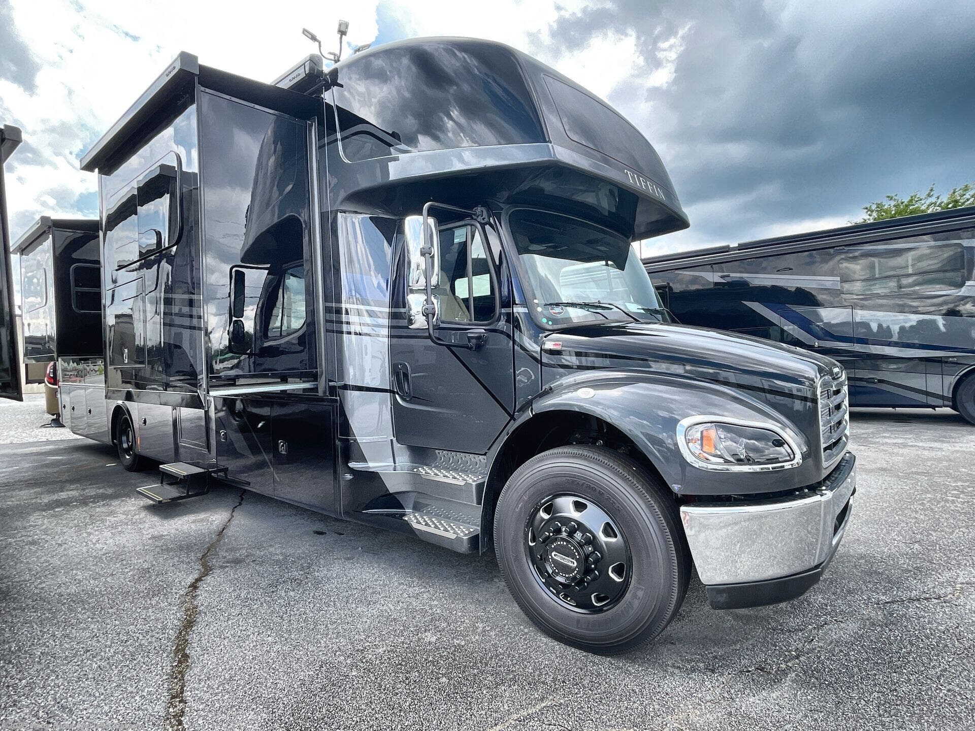 Each Allegro Bay Super C diesel coach by Tiffin Motorhomes sits on a durable Freightliner Custom S2RV chassis with an impressive 360 HP Cummins B6.7 engine for power you can feel. You will appreciate smooth handling thanks to the Trac-Tech full-time NoSPIN differential single rear axle and the automatic traction control. There is a manual release valve for the rear air suspension for added convenience, plus a 12,000 lb. towing capacity that will allow you to bring along the family car or even a horse trailer! This coach includes a Truma AquaGo Comfort instant water heater, AGM extended cycle house batteries, an 8.0 Onan Quiet Diesel generator, plus many more top of the line amenities. You will also love the new Generation 3 paint schemes, an exterior ladder, new matte finish tile flooring option, plus optional Starlink prep in the sewer bay that will give you the option to have internet while you're away from home!