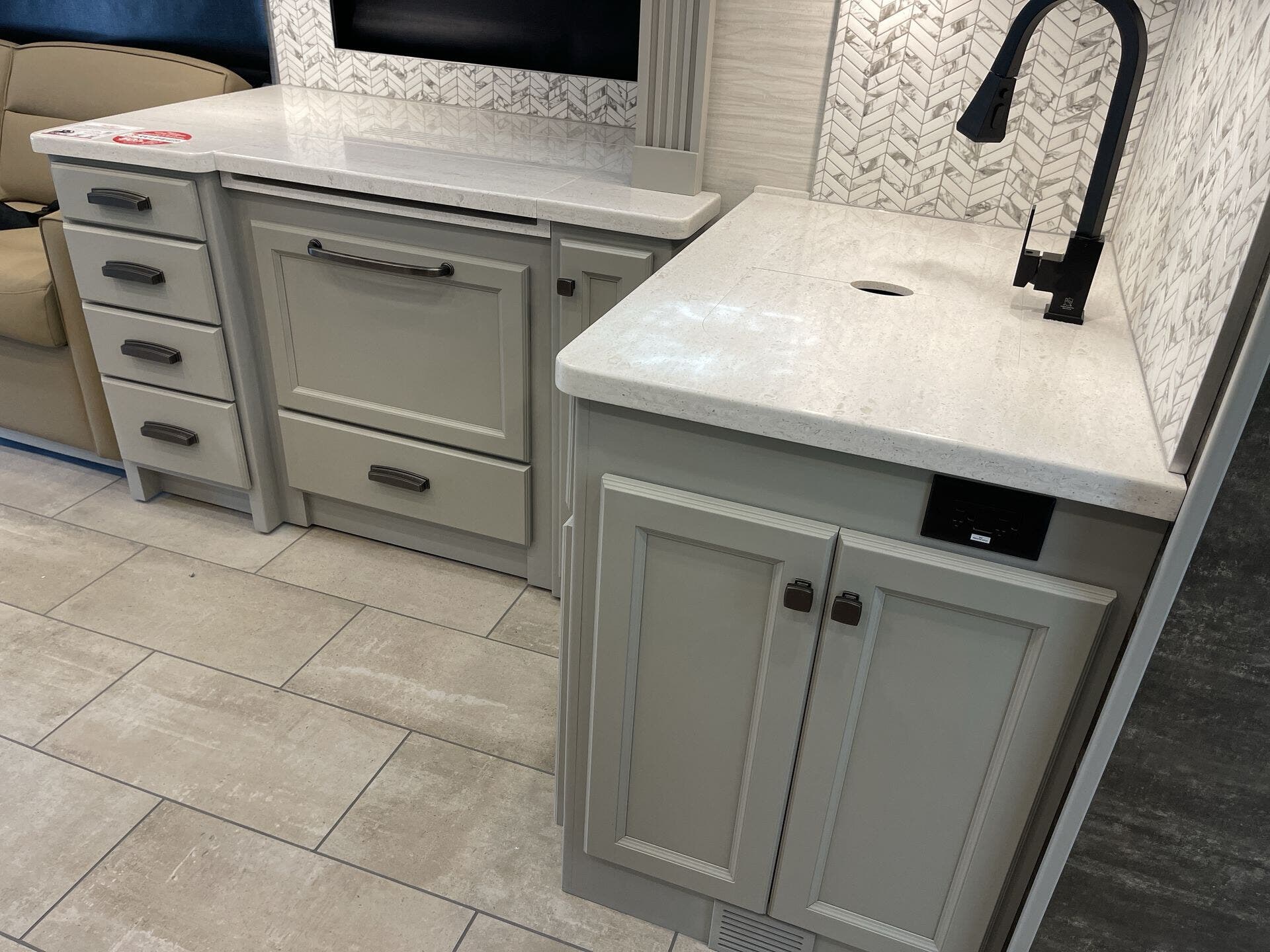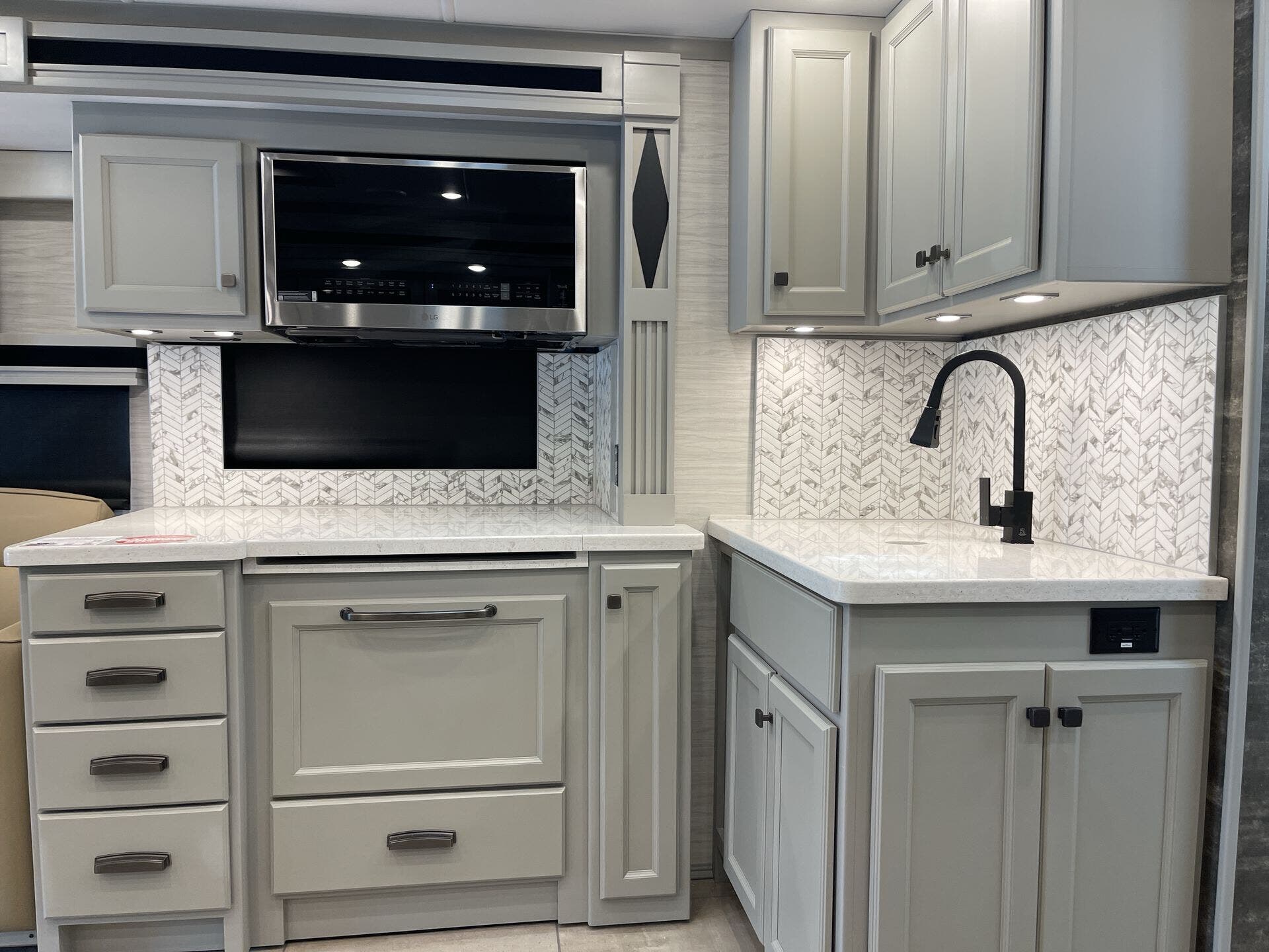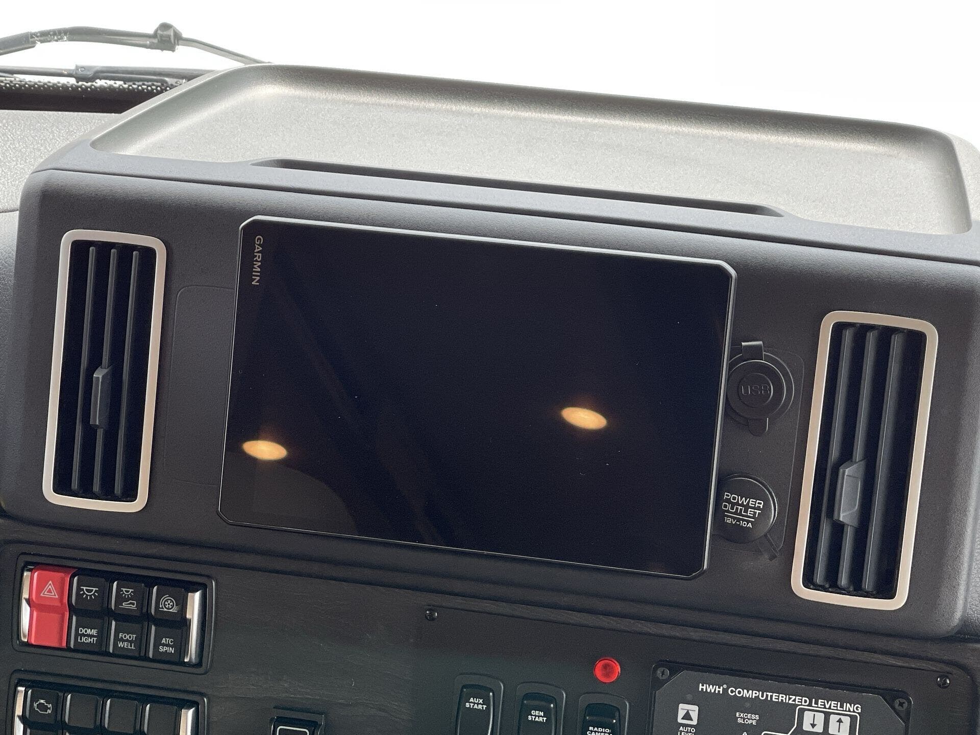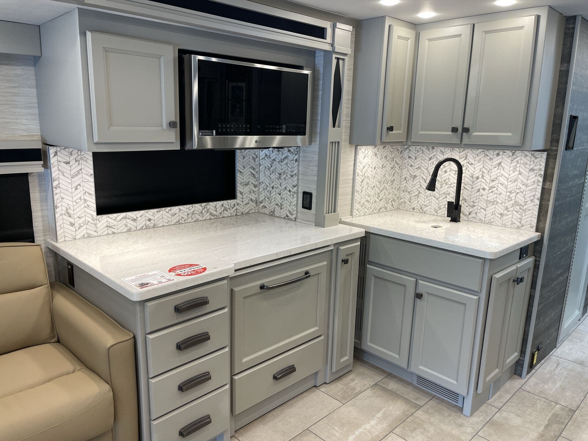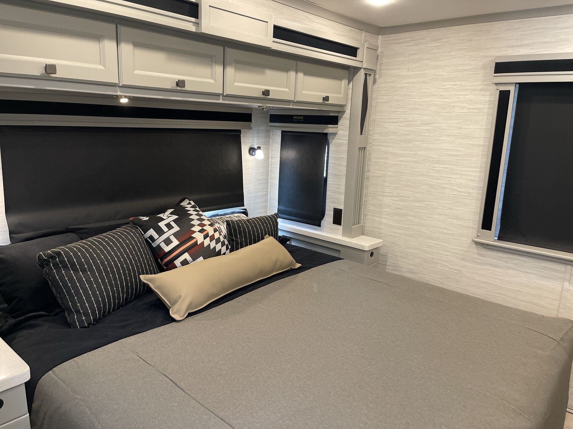 No detail is overlooked in the Allegro Bay’s luxury appointments and utility systems. Tiffin’s tile floor option, handcrafted cabinetry, and tile backsplash add a refined aesthetic. Plumbing and comfort systems include a Truma AquaGo instant water heater, Onan Quiet Diesel 8 kW generator, dual 15,000 BTU A/C units with heat pump, and a 35,000 BTU furnace. Beneath the coach are 136 cu ft of pass-through storage, satellite and Starlink prep, exterior entertainment hookup, and a Girard power awning with LED lighting—all making it an ideal coach for families or couples who seek a premium travel experience .