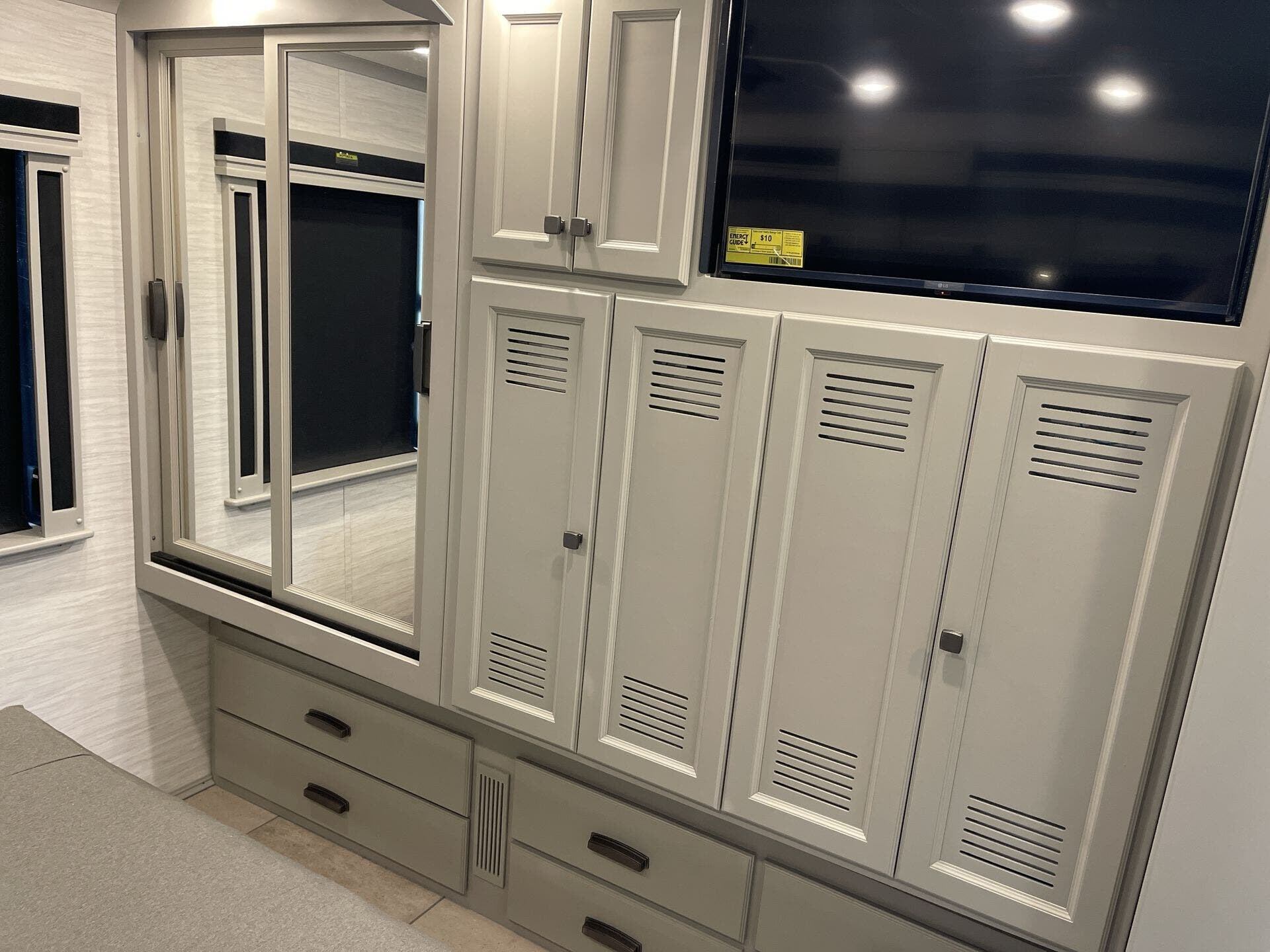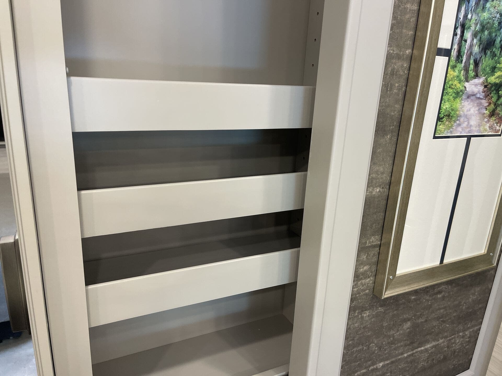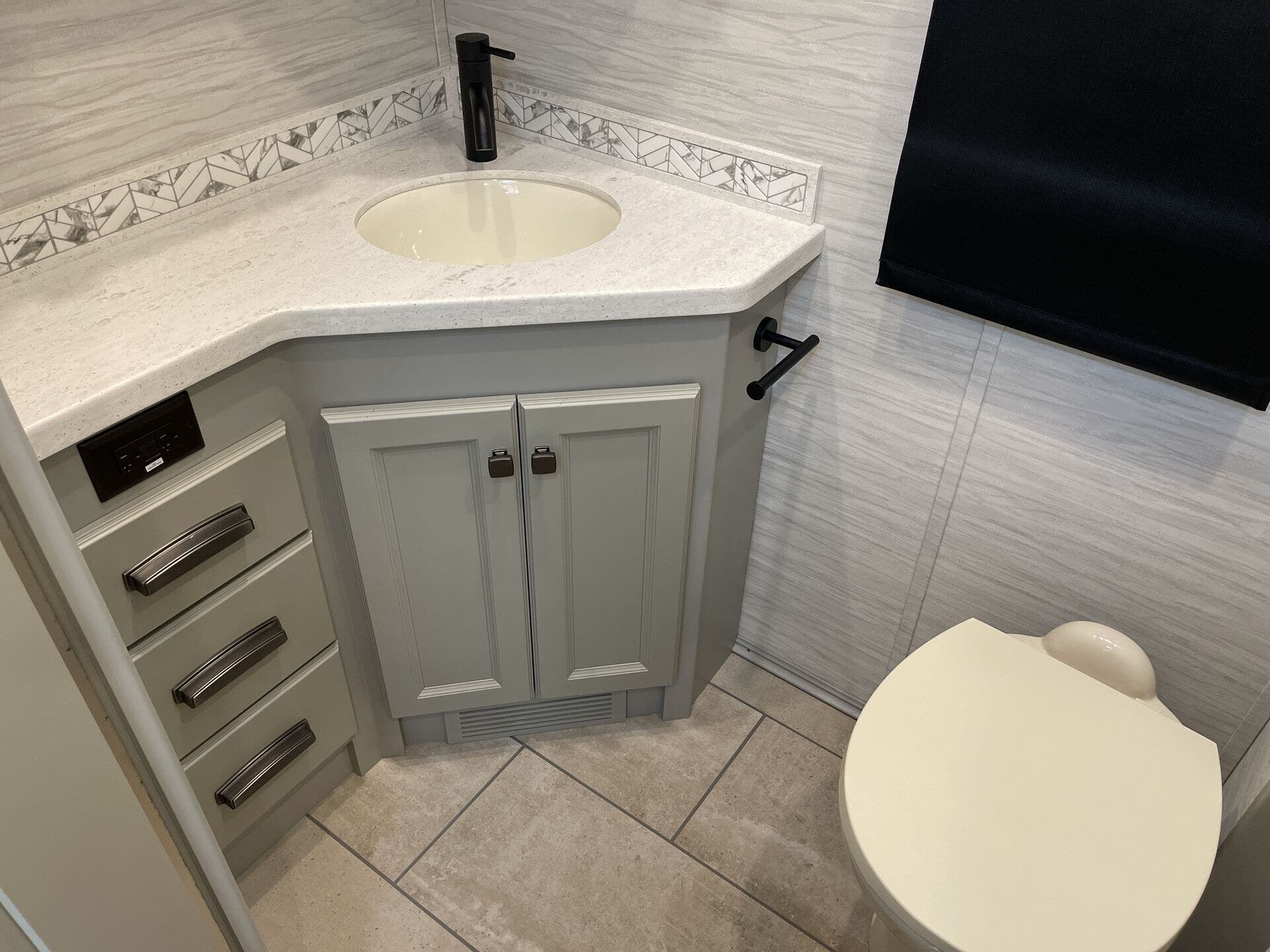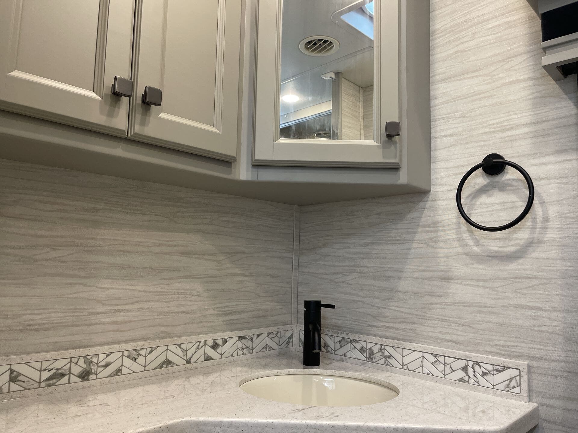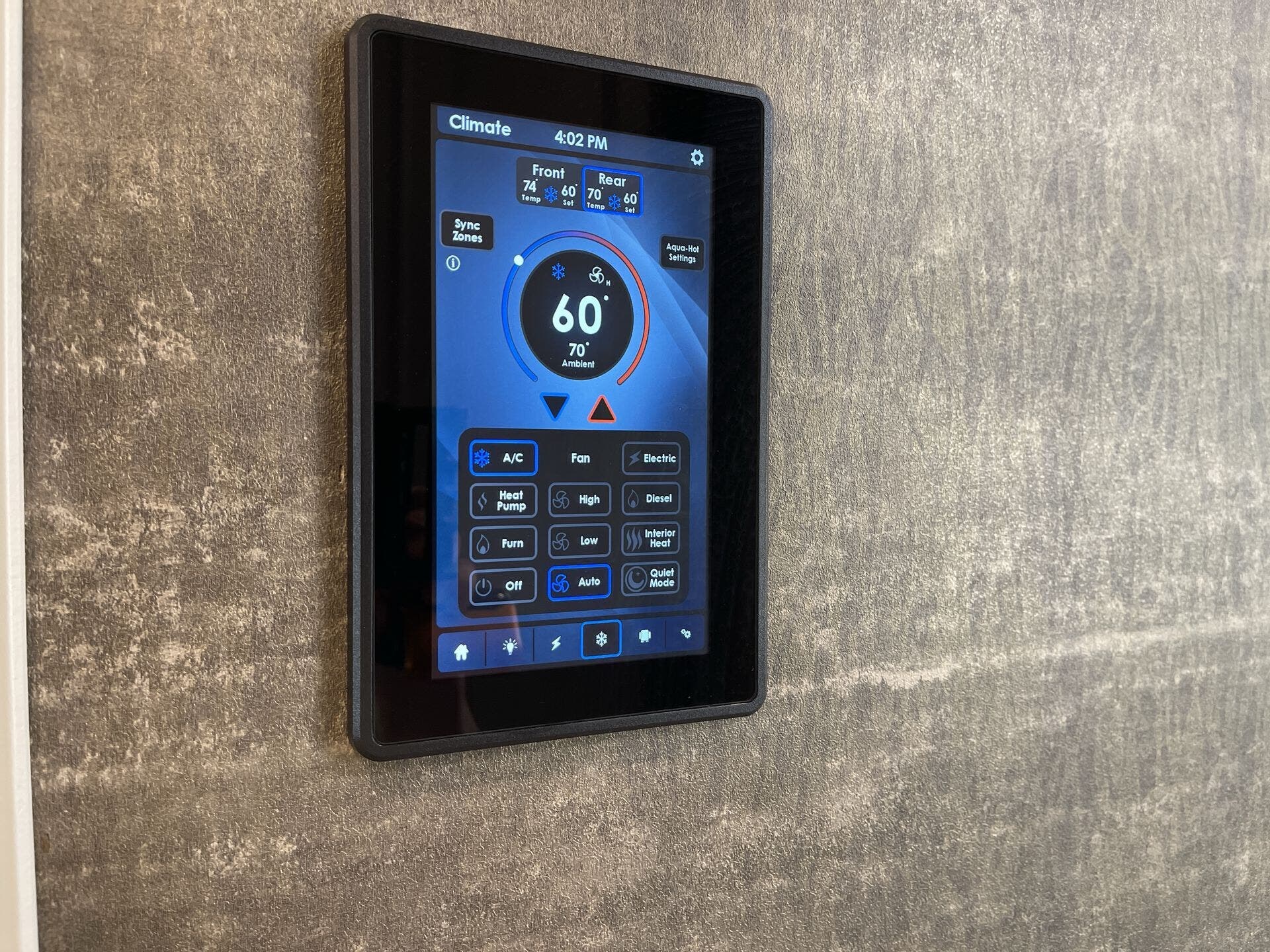 No detail is overlooked in the Allegro Bay’s luxury appointments and utility systems. Tiffin’s tile floor option, handcrafted cabinetry, and tile backsplash add a refined aesthetic. Plumbing and comfort systems include a Truma AquaGo instant water heater, Onan Quiet Diesel 8 kW generator, dual 15,000 BTU A/C units with heat pump, and a 35,000 BTU furnace. Beneath the coach are 136 cu ft of pass-through storage, satellite and Starlink prep, exterior entertainment hookup, and a Girard power awning with LED lighting—all making it an ideal coach for families or couples who seek a premium travel experience .