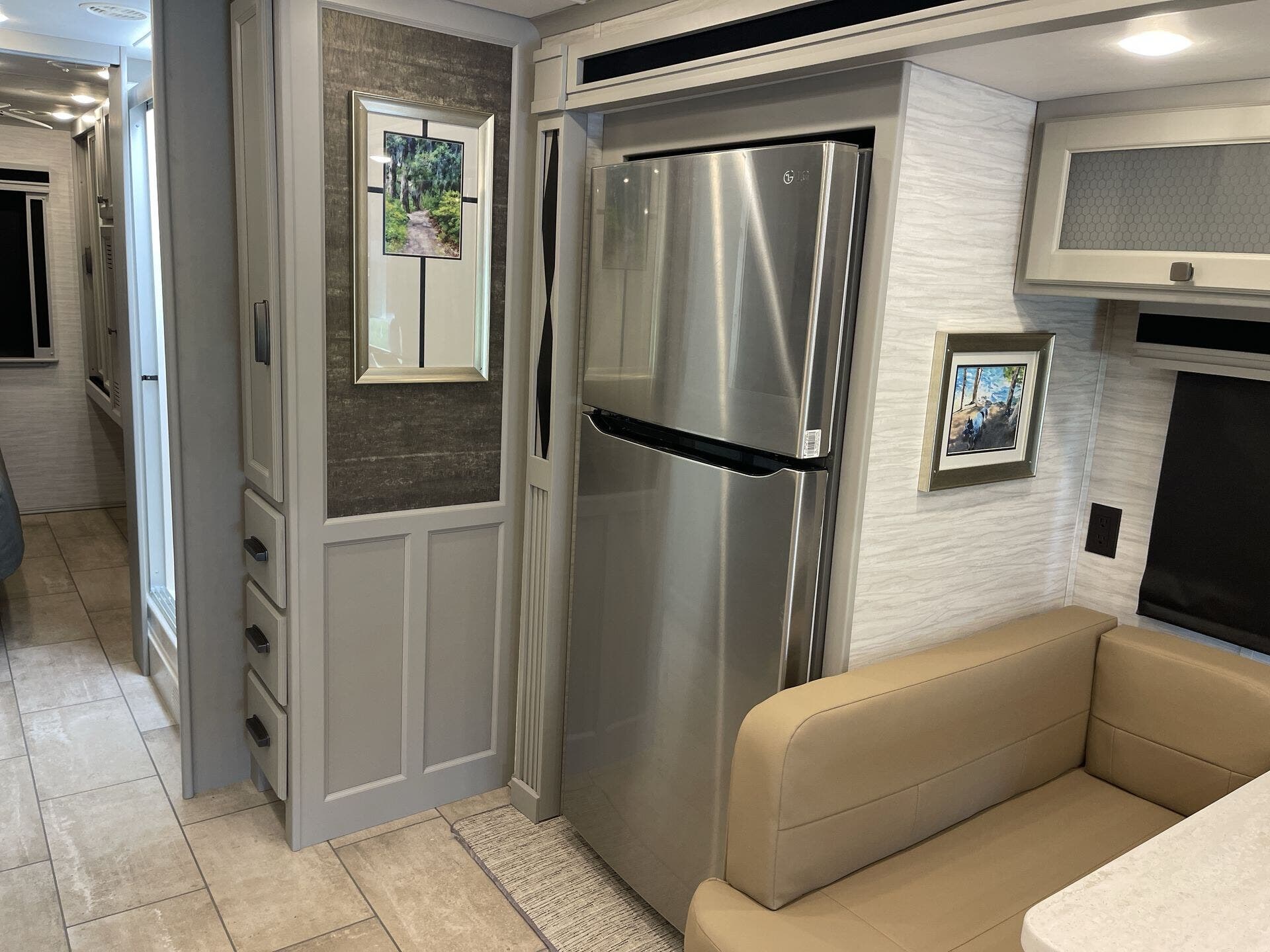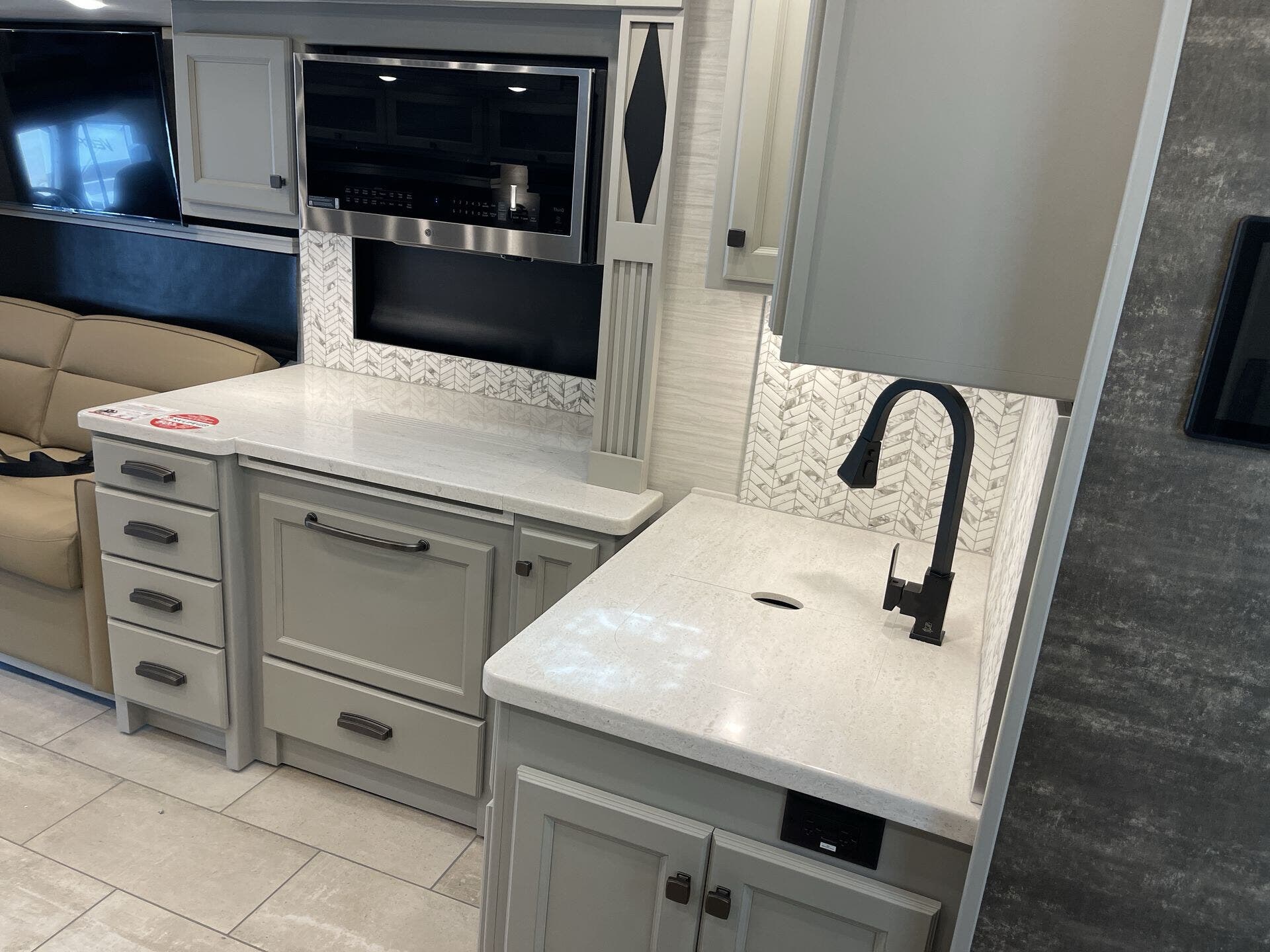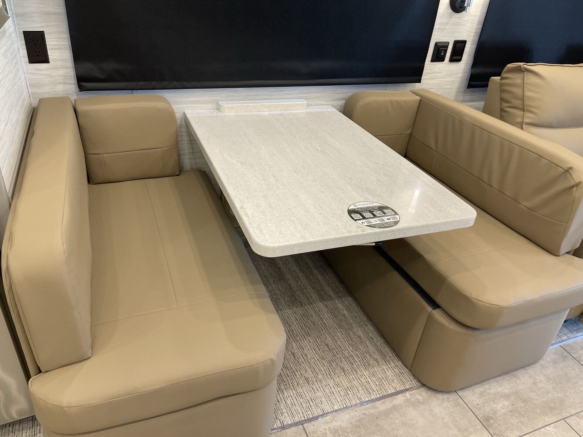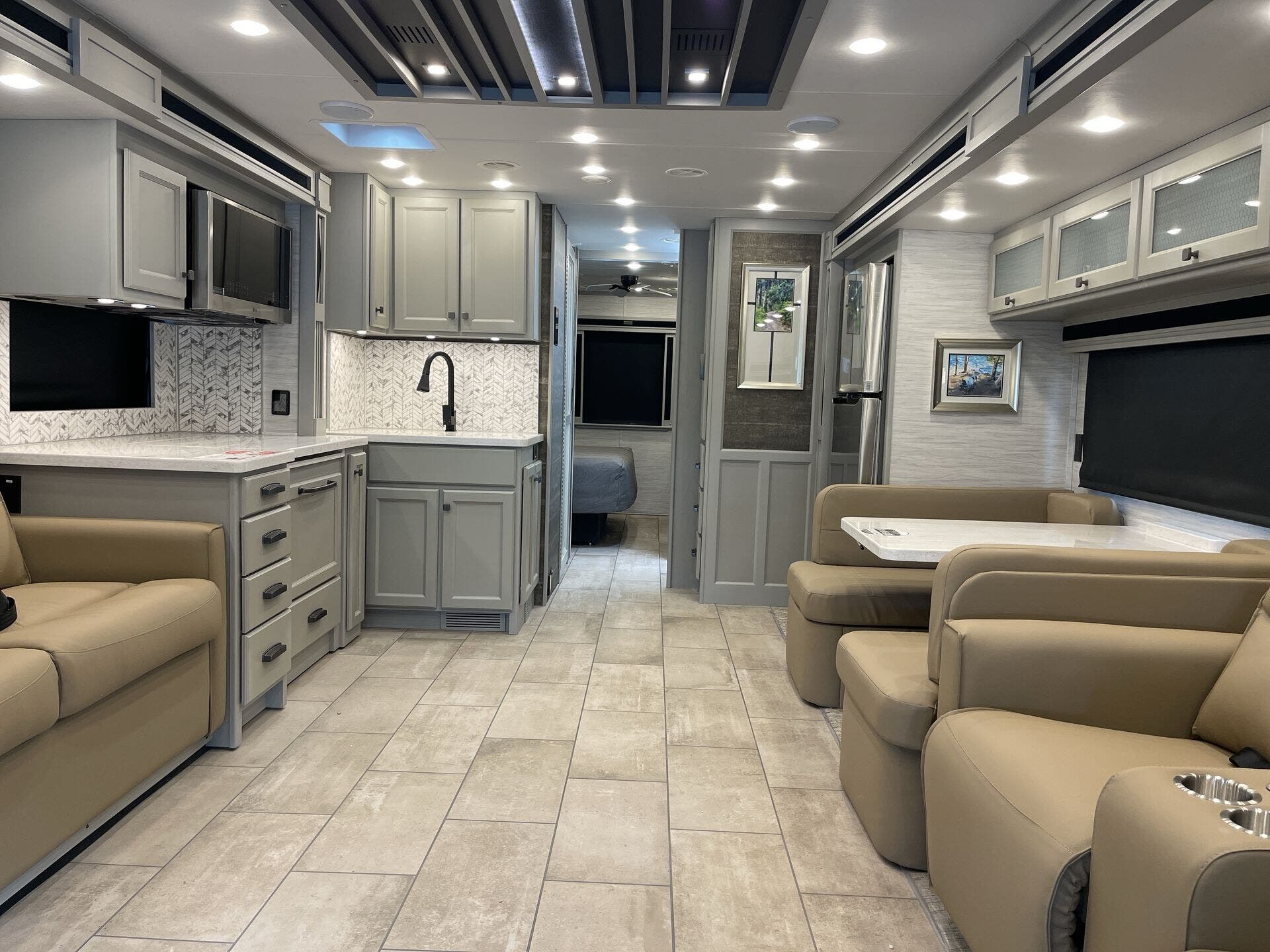 Inside, the 38 AB layout is designed for maximum comfort and flexibility with three opposing slide-outs that open wide to create a spacious living area. The front-rich lounge includes an air-coil sofa bed and booth dinette, with an optional overhead bunk for extra sleeping capacity—accommodating up to six. Practical conveniences abound: a residential-sized 20 cu ft stainless fridge, a convection microwave with air-fry features, a three-burner cooktop, and an "Expand-An-Island" countertop extension. The rear master suite offers a king-size bed slide-out, large wardrobe with drawers, and washer/dryer prep. The central bath features a roomy 28.5″x40.5″ shower and dual access for privacy .