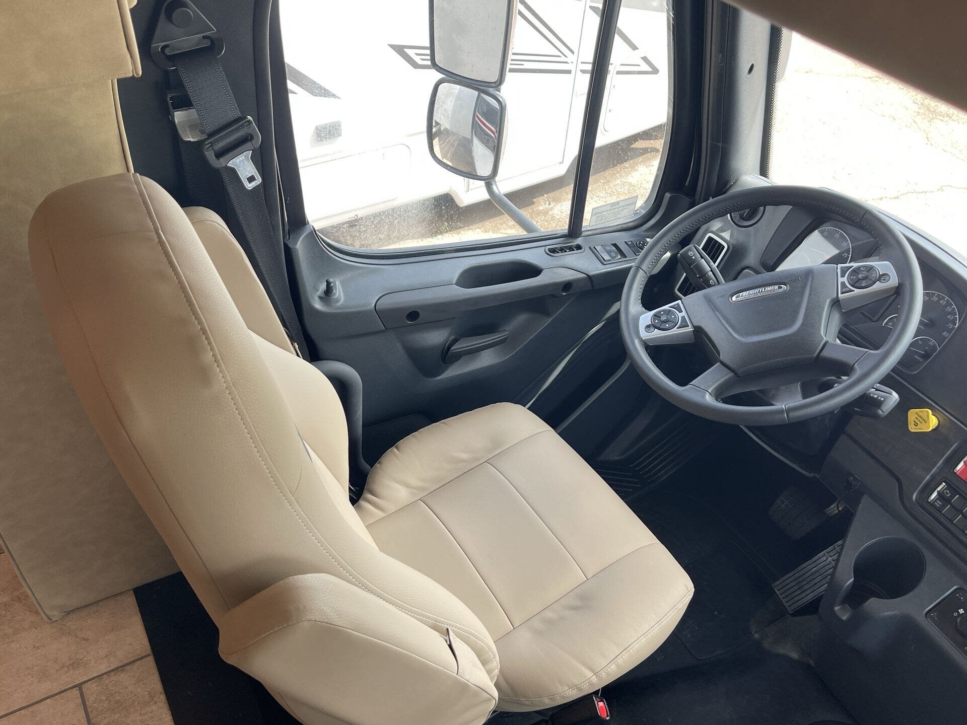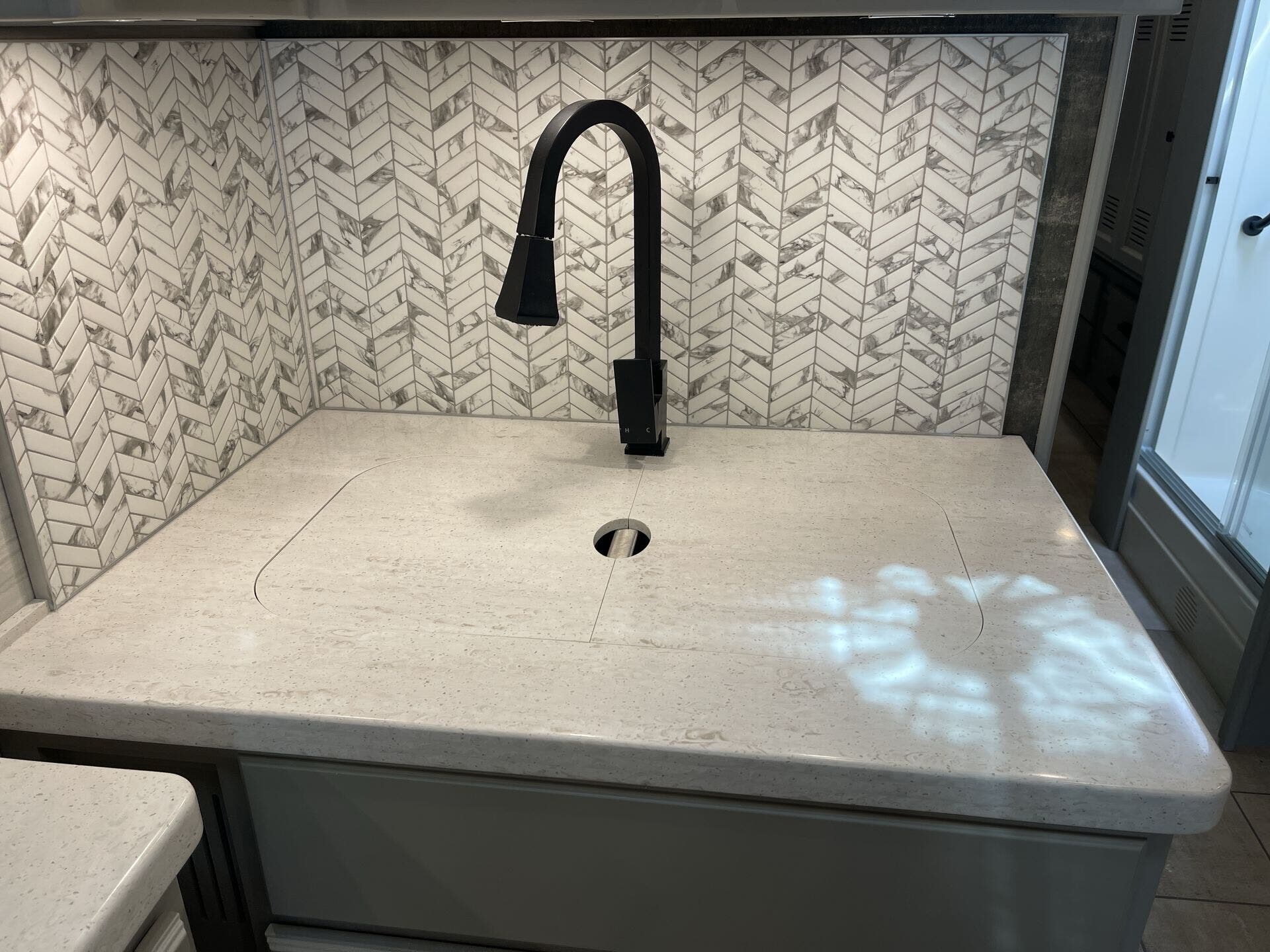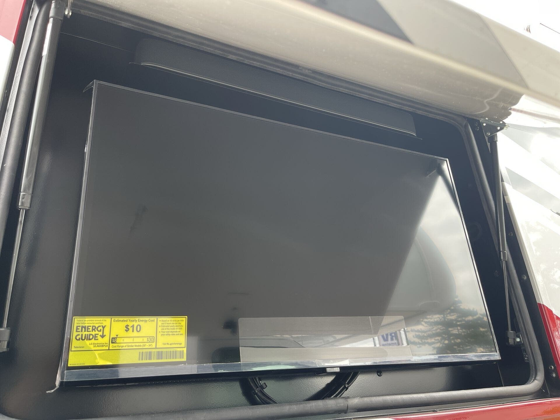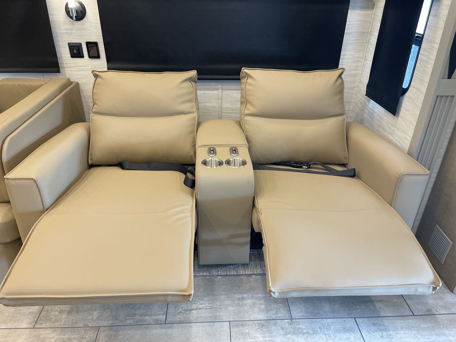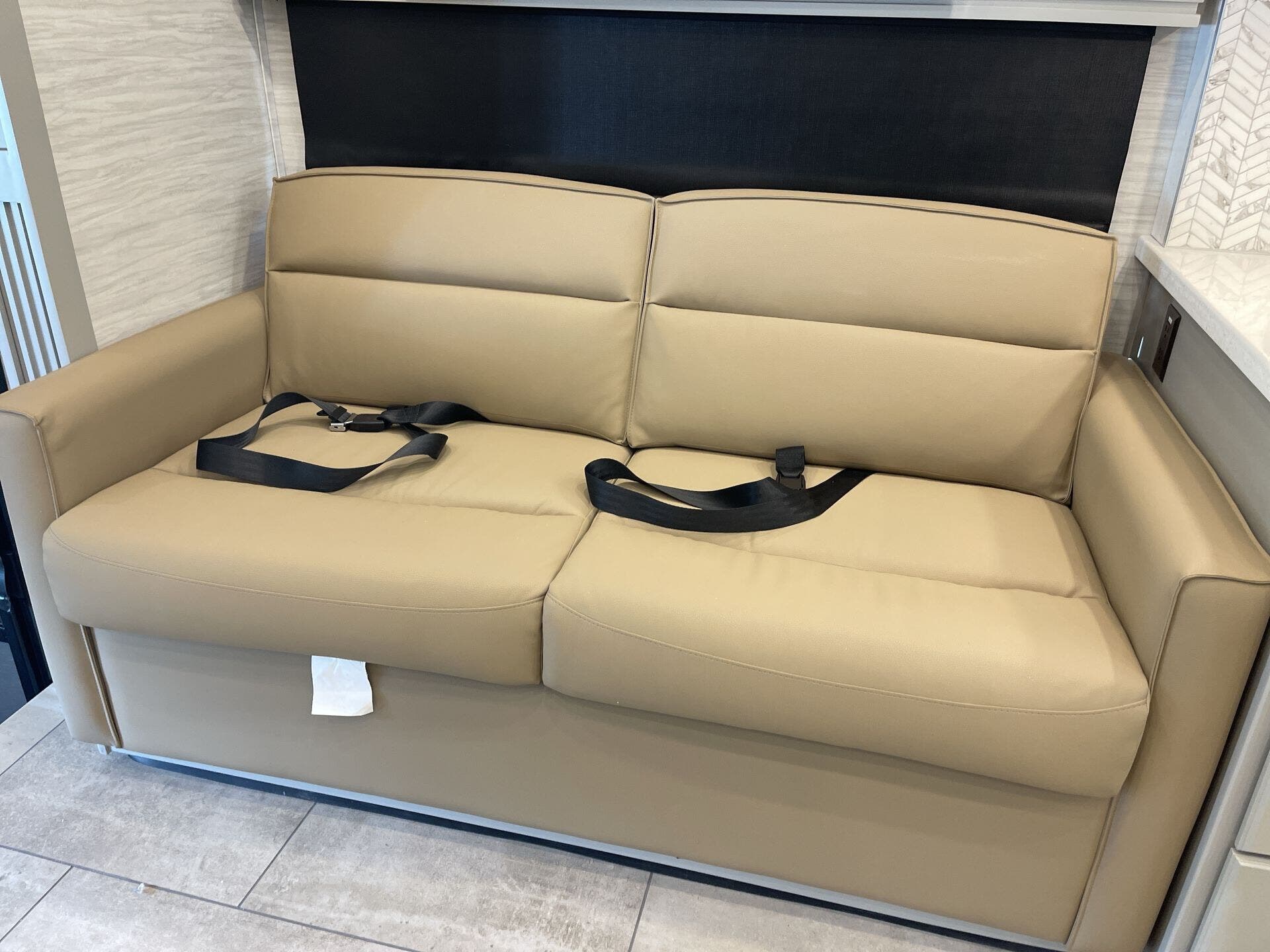 Inside, the 38 AB layout is designed for maximum comfort and flexibility with three opposing slide-outs that open wide to create a spacious living area. The front-rich lounge includes an air-coil sofa bed and booth dinette, with an optional overhead bunk for extra sleeping capacity—accommodating up to six. Practical conveniences abound: a residential-sized 20 cu ft stainless fridge, a convection microwave with air-fry features, a three-burner cooktop, and an "Expand-An-Island" countertop extension. The rear master suite offers a king-size bed slide-out, large wardrobe with drawers, and washer/dryer prep. The central bath features a roomy 28.5″x40.5″ shower and dual access for privacy .