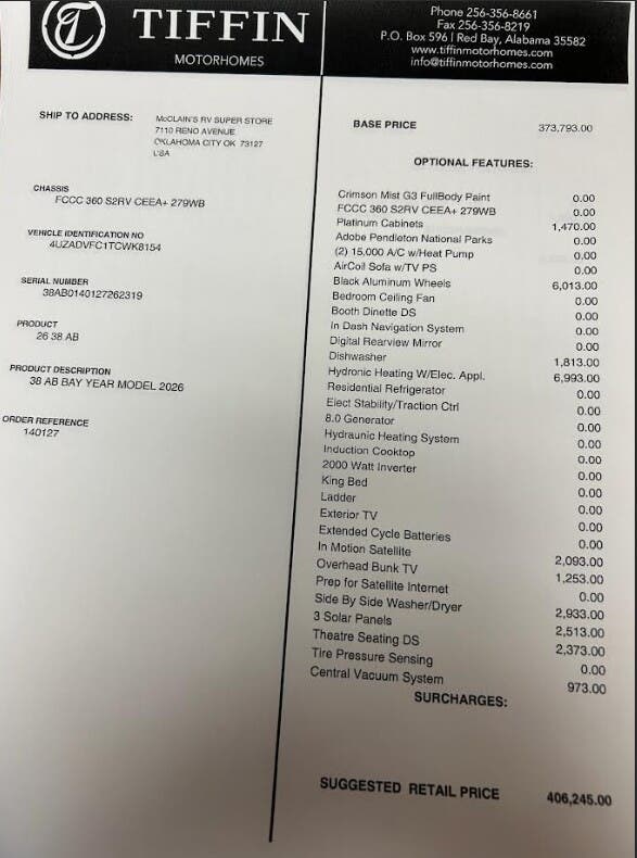 Request More Info on this 2026 Tiffin Allegro Bay 38AB Offered for sale by McClain's RV Oklahoma City