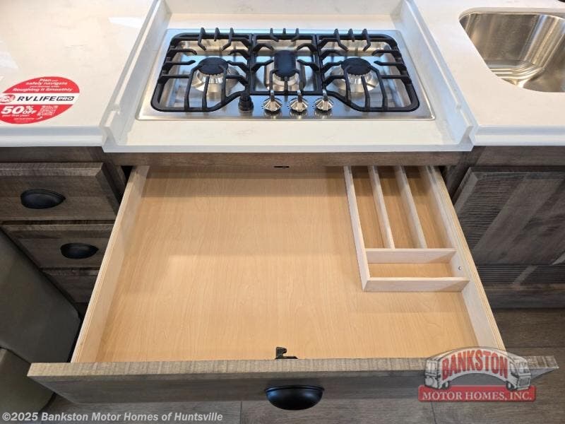Pack your bags and load up into this motorhome for a luxurious adventure! The rear private bedroom has a king bed slide that can be switched for an optional queen bed, a bank of drawers next to a TV, a large closet, and a wardrobe that is prepped to add an optional washer and dryer so you can have clean clothes throughout your entire trip. The full bathroom has a shower skylight, gravity flush toilet, solid surface countertop, and a handheld shower head with a slide bar for added convenience. When you're ready to eat, just whip up a meal on the three burner propane cooktop or use the convection microwave. You can dine at the booth dinette, or maybe switch out the dinette for an optional dinette computer workstation with a lift TV! You can spend your evenings with a movie since there is a living area TV with an optional fireplace, or you can head outdoor to enjoy the exterior TV and Girard power awning with LED lights!