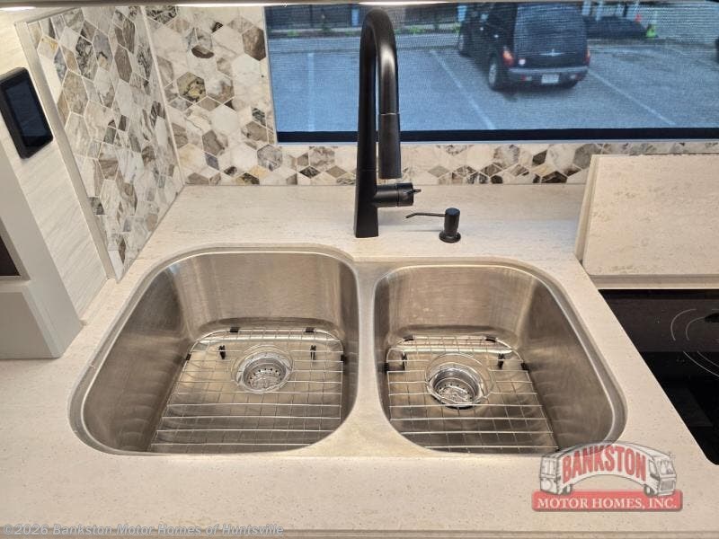 Now you can travel with more friends and family in this coach that includes a bath and a half, and additional sleeping space thanks to the two sofa beds. The master bedroom includes a king bed, 50" TV, plus dual nightstands for your belongings. Dual bath sinks in the full rear bath allow two people to freshen up at once, and a stacked washer and dryer to make wash day a breeze. And check out the kitchen with its residential refrigerator, pantry, stainless steel convection microwave, and drawer-type dishwasher! You will also appreciate the countertop extension for more prep space when it's time for dinner. The dinette with chairs provides a place to dine or get some work done, and one of the sofas includes an ottoman so you can kick your feet up.
