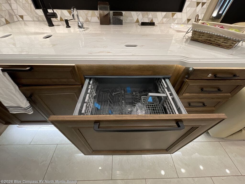 Now you can travel with more friends and family in this coach that includes a bath and a half, and additional sleeping space thanks to the two sofa beds. The master bedroom includes a king bed, 50" TV, plus dual nightstands for your belongings. Dual bath sinks in the full rear bath allow two people to freshen up at once, and a stacked washer and dryer to make wash day a breeze. And check out the kitchen with its residential refrigerator, pantry, stainless steel convection microwave, and drawer-type dishwasher! You will also appreciate the countertop extension for more prep space when it's time for dinner. The dinette with chairs provides a place to dine or get some work done, and one of the sofas includes an ottoman so you can kick your feet up.