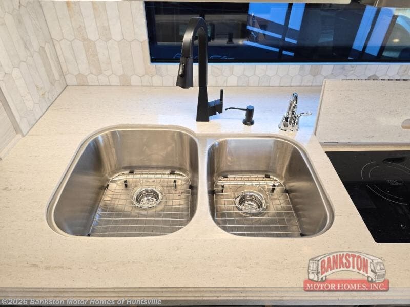 Fours slides, a bath and a half, plus sleeping space for six make this coach family friendly. There are two sofa beds in the main living area, plus a lift TV for your favorite shows. The chef of your group can cook meals on the two burner induction cooktop or in the stainless steel convection microwave with an air fryer, and there is a drawer-type dishwasher that will make clean up easier than ever. This model also includes a residential refrigerator plus pull-out storage and a stack of drawers for snacks galore. Enjoy a great night's rest on the king bed after traveling all day, and the full rear bath will allow you to clean up in luxury. There is even a floor-to-ceiling closet for maximum storage and a stacked washer and dryer; how convenient!