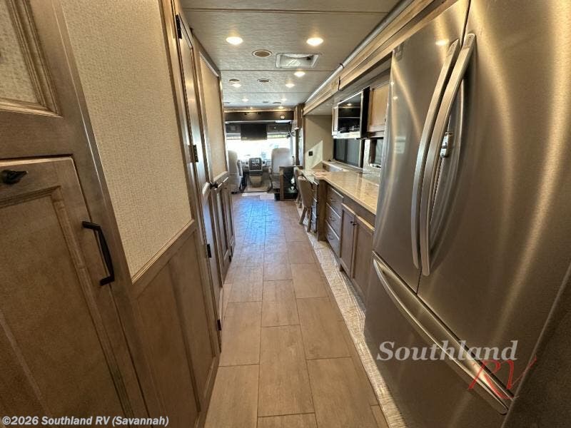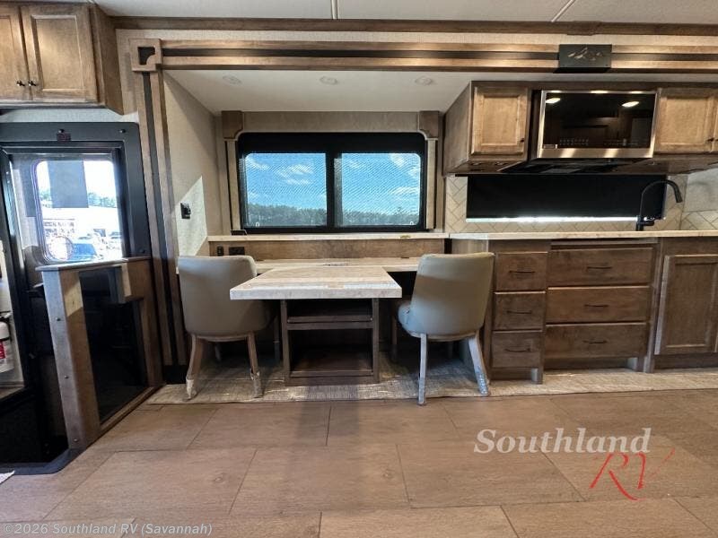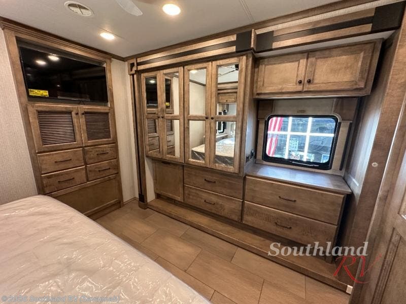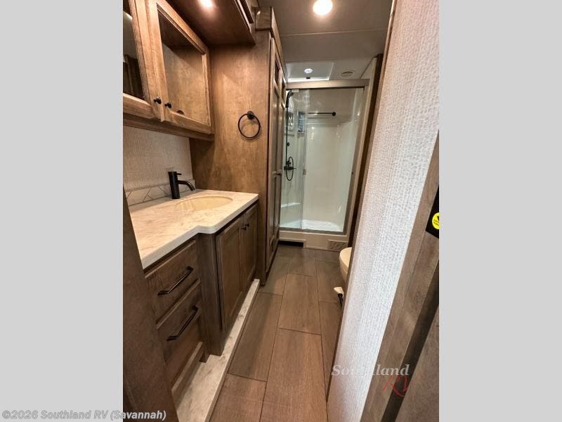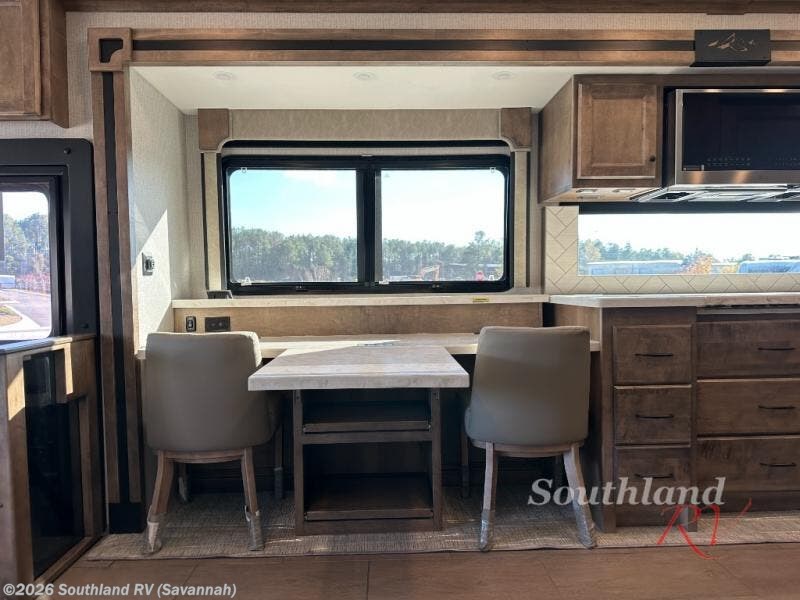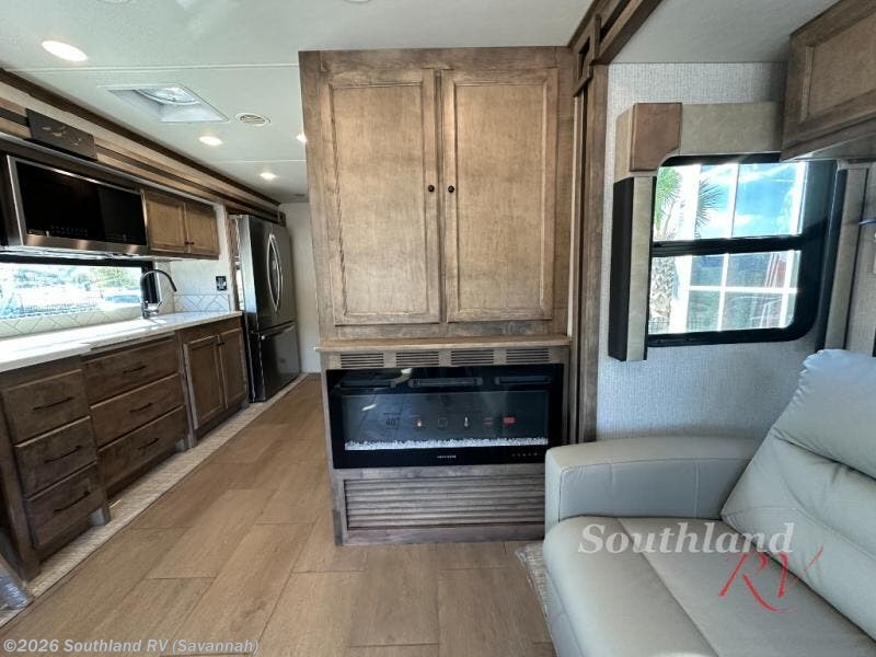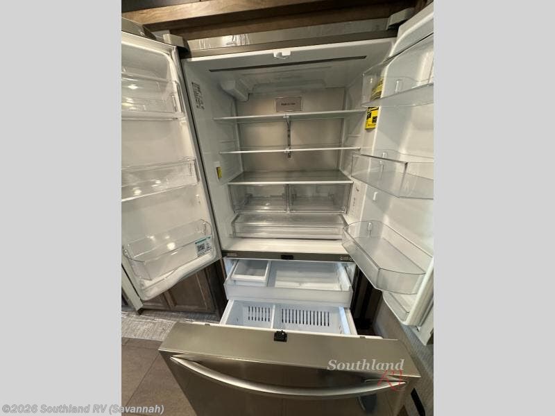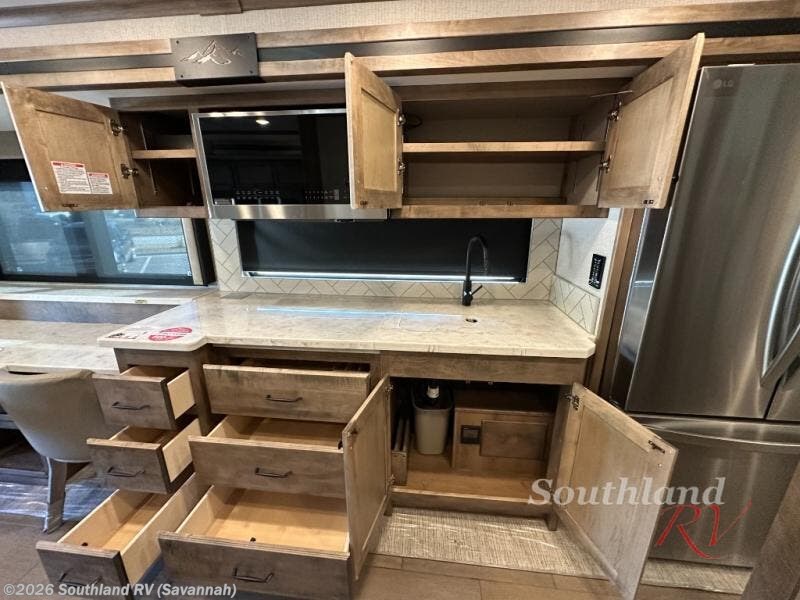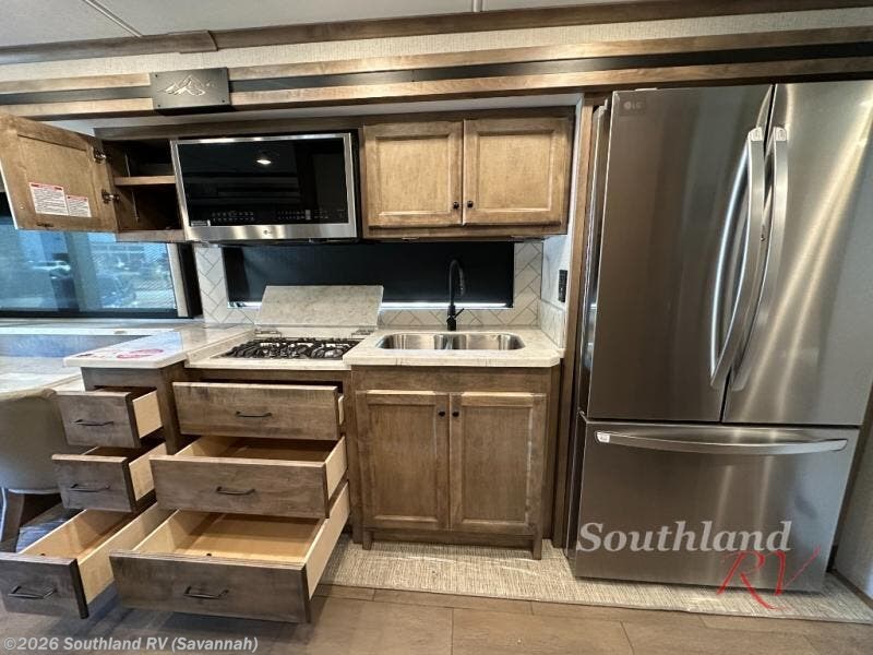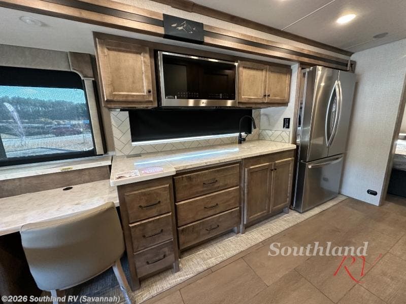 There are many standard luxurious features you will love about this motorhome! It also has many optional features you can add like the optional drop-down front bunk, the optional super sofa and the optional theater seating. The queen bed slide in the rear private bedroom offers a comfortable place to sleep, as well as the flip and fold sofa bed in the living area. You will love the dinette bar with a lift TV, a flip-up countertop, and two chairs that will make this the perfect place to get some work done while you're on the road. The kitchen includes everything you need to prepare meals each day, including a 1.7 cu. ft. smart convection microwave with an air fryer, a three burner liquid propane cooktop, and a 23 cu. ft. stainless steel residential refrigerator with French doors and a bottom freezer. Head to the rear master bedroom with a queen bed slide out, a large wardrobe, a cabinet with a TV and drawers below, plus a private entrance into the dual entry bath!