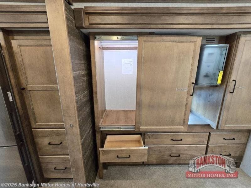 One step inside this spacious coach and you'll be sold! There is a bath and a half to make traveling with friends and family easier than ever. The full-wall slide will make your space feel more open, plus there is a king bed slide out and a third slide out so everyone is comfortable. This model includes theater seats, a lift TV within the entertainment center, along with drawer storage to keep movies organized, and an optional fireplace. You'll be pleasantly surprised by the full kitchen with its three burner cooktop, 1.5 cu. ft. Smart convection microwave, plus a pantry and 18 cu. ft. residential refrigerator with a bottom freezer to keep ice cream stocked up! When you're ready for some shut-eye, the master bedroom will be waiting for you, while your guests sleep on the booth dinette sleeper, or you can choose the optional drop-down front bunk for more sleeping space!