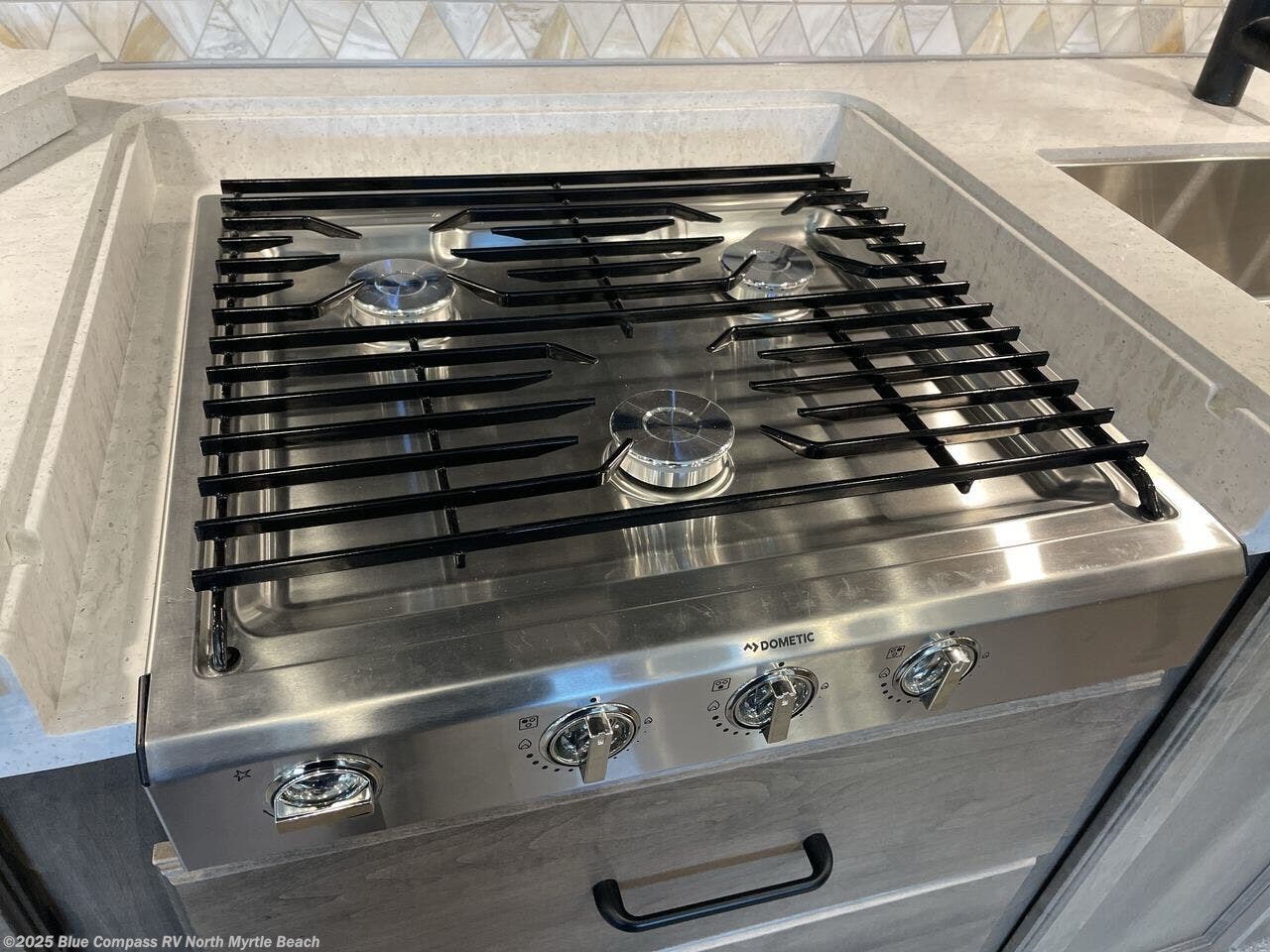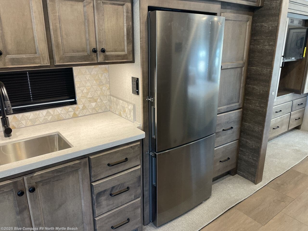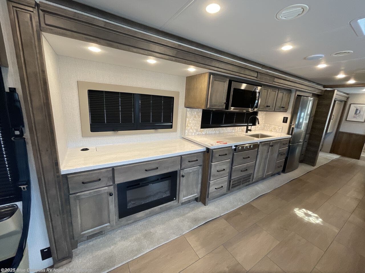 One step inside this spacious coach and you'll be sold! There is a bath and a half to make traveling with friends and family easier than ever. The full-wall slide will make your space feel more open, plus there is a king bed slide out and a third slide out so everyone is comfortable. This model includes theater seats, a lift TV within the entertainment center, along with drawer storage to keep movies organized, and an optional fireplace. You'll be pleasantly surprised by the full kitchen with its three burner cooktop, 1.5 cu. ft. Smart convection microwave, plus a pantry and 18 cu. ft. residential refrigerator with a bottom freezer to keep ice cream stocked up! When you're ready for some shut-eye, the master bedroom will be waiting for you, while your guests sleep on the booth dinette sleeper, or you can choose the optional drop-down front bunk for more sleeping space!