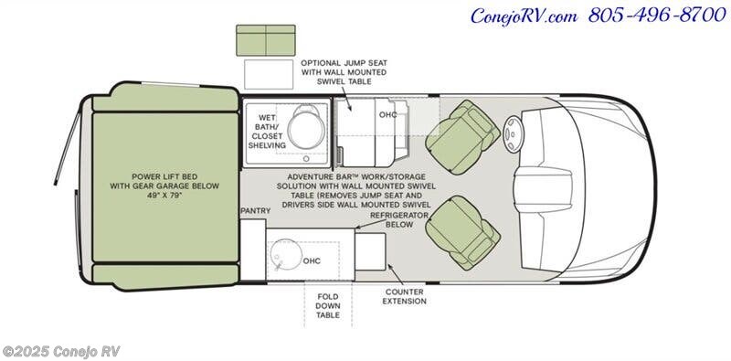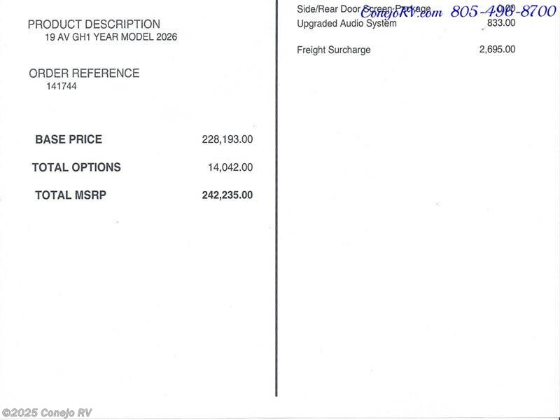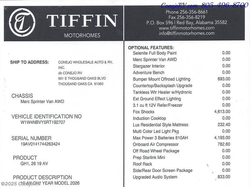 2026 Tiffin GH1 AWD Sprinter Mercedes Turbo Diesel Work Station 810AH Battle Born Lithium Ion Kit ***MSRP is $242,235, Our Price Only $164,990*** Optional Max Power 810AH Lithium System, Optional Upgraded Audio System, Optional On Board Air Compressor, Optional LUX Residential Style Mattress, Optional Fox Shocks Suspension, Optional Bumper Mount Offroad Lighting, ***Built on a Fully Featured Mercedes Benz Sprinter Chassis, 2500 4-Cylinder Diesel High Output AWD, Upgraded 9G-TRONIC Transmission, Hydraulic 4 Wheel Antilock Braking, Adaptive Cruise Control, Active Brake Assist, Active Lane Keeping Assist, Light/Rain Sensor/Blind Spot Monitoring with Indicator Lights in Side Mirror, Collision Prevention Assist/High Beam Assist, Driver and Passenger Airbags, Max Power 810AH Battle Born Lithium-Ion Battery Kit, 3,000W Inverter, Inverter Charger, Hydronic Heating, 15,000-BTU Air Conditioner with Heat Pump, Soft-Start & Bluetooth, Aqua-Hot® 125 Modular Diesel Heat Exchanger, 220-Watt Solar Panel with 30-Amp Controller, Rear Bedroom with 49" x 79" Power Lift Bed with Gear Garage Below, Fully Enclosed Bathroom with Showerhead, Wet Bath Size 36”x24", Removable Shelves Convert to Wet Storage Cabinet, Swiveling Cassette Toilet, Beautiful Kitchen With Solid Surface Counter Tops, Stowable Counter Top Extension, Stowable Single Burner Induction Stove Top, Stainless Steel Sink w/Faucet and Pull-Out Sprayer, Larger 12-Volt, 3.1-Cubic Foot Refrigerator with Freezer, Pantry, Fold-Down Exterior Table, Bench Seating & Work Station, Radio/Rearview Monitor System, MBUX® Touchscreen Multimedia Infotainment Center w/Navigation, Wi-Fi Hotspot, Intelligent Voice Control and Rear Camera, Heated Leather Seats with Electronic Controls Slide/Swivel/Recline, Dual Airbags, 12-volt Powerpoints, Side & Rear Screen Door, Powered Patio Awning with Integrated LED Lighting, Water Heater Bypass System, Water Filter, Water Pump, Low-point Water Drain Lines, Gravity Water Fill, Exterior Water Fill Valve,SeeLeveL™ Tank Monitor, Fresh Water Hookup for City Water and Tank Fill, Galley Sink Drain Macerator Pump, Fresh Water Recirculation System, Privacy Shades for Front and Cab Door Windows, Low-Profile Roof Rack, Single-Row Low-Profile Light Bar, Exterior Patio Light, Fog Lights, LED Lights Under Exterior Running Boards, Electrically Adjustable Side-view Mirrors, Fixed Side-Mounted All-Welded Ladder, Rear Mud Guards, Low-Profile Running Board with 12-Volt Lighting, Fold-Down Table, ARB On-Board Air Compressor w/ Front and Rear Chucks, Custom Offroad Tiffin Adventure Wheels, Front and Rear LT 245/70R 17 BFGoodrich® All-Terrain T/A® Tires, Parking Package with 360° View Camera, Trailer Hitch 5,000-lb. Drawbar/500-lb. Maximum Vertical Tongue Weight , Brand New & Just Arrived! ***MSRP is $242,235, Our Price Only $164,990*** We have some fantastic financing and take trades also! It is our #1 goal that your experience with our company is an enjoyable one with our staff of industry professionals, Conejo Wholesale Auto & RV, Exclusive Ventura County Dealer For Winnebago Navion, Revel, Solis, Ekko, and Travato, All Storyteller Products, Outside Van Syncline and Approach, Tiffin GH1, All Roadtrek Products, We Also Carry Some Quality Pre-Owned Motorhomes which come with Our 45 Day/1000 Mile In-House Warranty at No Charge, Conejo RV, 661 E. Thousand Oaks Blvd, Thousand Oaks, CA 91360, 805-496-8700, Open 7 Days, 9am to 6pm, All Coaches Fully Inspected, Serviced and Detailed, Come Experience the No Pressure No Haggle Sales Approach at Conejo RV, We Also Buy Clean Late Model Coaches, 1 Year Free Camping Membership Included Ask For Details! (***plus tax & license fees***)