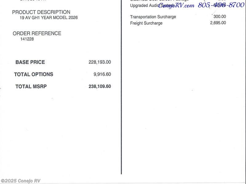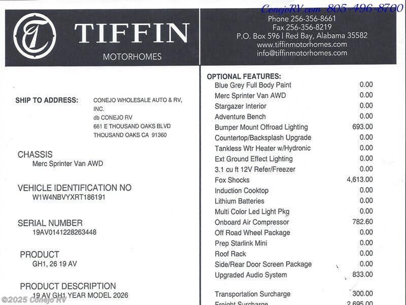 2026 Tiffin GH1 AWD Sprinter Mercedes Turbo Diesel 540AH Battle Born Lithium Ion Kit ***MSRP is $238,190, Our Price Only $159,990*** Optional Upgraded Audio System, Optional On Board Air Compressor, Optional Fox Shocks Suspension, Optional Bumper Mount Offroad Lighting, ***Built on a Fully Featured Mercedes Benz Sprinter Chassis, 2500 4-Cylinder Diesel High Output AWD, Upgraded 9G-TRONIC Transmission, Hydraulic 4 Wheel Antilock Braking, Adaptive Cruise Control, Active Brake Assist, Active Lane Keeping Assist, Light/Rain Sensor/Blind Spot Monitoring with Indicator Lights in Side Mirror, Collision Prevention Assist/High Beam Assist, Driver and Passenger Airbags, 540AH Battle Born Lithium-Ion Battery Kit, 3,000W Inverter, Inverter Charger, Hydronic Heating, 15,000-BTU Air Conditioner with Heat Pump, Soft-Start & Bluetooth, Aqua-Hot® 125 Modular Diesel Heat Exchanger, 220-Watt Solar Panel with 30-Amp Controller, Rear Bedroom with 49" x 79" Power Lift Bed with Gear Garage Below, Fully Enclosed Bathroom with Showerhead, Wet Bath Size 36”x24", Removable Shelves Convert to Wet Storage Cabinet, Swiveling Cassette Toilet, Beautiful Kitchen With Solid Surface Counter Tops, Stowable Counter Top Extension, Stowable Single Burner Induction Stove Top, Stainless Steel Sink w/Faucet and Pull-Out Sprayer, Larger 12-Volt, 3.1-Cubic Foot Refrigerator with Freezer, Pantry, Fold-Down Exterior Table, Bench Seat With Lagun Style Dinette, Radio/Rearview Monitor System, MBUX® Touchscreen Multimedia Infotainment Center w/Navigation, Wi-Fi Hotspot, Intelligent Voice Control and Rear Camera, Heated Leather Seats with Electronic Controls Slide/Swivel/Recline, Dual Airbags, 12-volt Powerpoints, Side & Rear Screen Door, Powered Patio Awning with Integrated LED Lighting, Water Heater Bypass System, Water Filter, Water Pump, Low-point Water Drain Lines, Gravity Water Fill, Exterior Water Fill Valve,SeeLeveL™ Tank Monitor, Fresh Water Hookup for City Water and Tank Fill, Galley Sink Drain Macerator Pump, Fresh Water Recirculation System, Privacy Shades for Front and Cab Door Windows, Low-Profile Roof Rack, Single-Row Low-Profile Light Bar, Exterior Patio Light, Fog Lights, LED Lights Under Exterior Running Boards, Electrically Adjustable Side-view Mirrors, Fixed Side-Mounted All-Welded Ladder, Rear Mud Guards, Low-Profile Running Board with 12-Volt Lighting, Fold-Down Table, ARB On-Board Air Compressor w/ Front and Rear Chucks, Custom Offroad Tiffin Adventure Wheels, Front and Rear LT 245/70R 17 BFGoodrich® All-Terrain T/A® Tires, Parking Package with 360° View Camera, Trailer Hitch 5,000-lb. Drawbar/500-lb. Maximum Vertical Tongue Weight , Brand New & Just Arrived! ***MSRP is $238,190, Our Price Only $159,990*** We have some fantastic financing and take trades also! It is our #1 goal that your experience with our company is an enjoyable one with our staff of industry professionals, Conejo Wholesale Auto & RV, Exclusive Ventura County Dealer For Winnebago Navion, Revel, Solis, Ekko, and Travato, All Storyteller Products, Outside Van Syncline and Approach, Tiffin GH1, All Roadtrek Products, We Also Carry Some Quality Pre-Owned Motorhomes which come with Our 45 Day/1000 Mile In-House Warranty at No Charge, Conejo RV, 661 E. Thousand Oaks Blvd, Thousand Oaks, CA 91360, 805-496-8700, Open 7 Days, 9am to 6pm, All Coaches Fully Inspected, Serviced and Detailed, Come Experience the No Pressure No Haggle Sales Approach at Conejo RV, We Also Buy Clean Late Model Coaches, 1 Year Free Camping Membership Included Ask For Details! (***plus tax & license fees***)