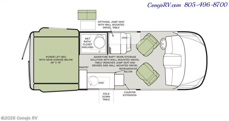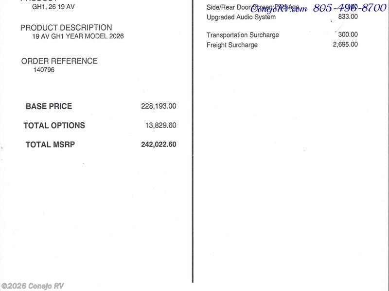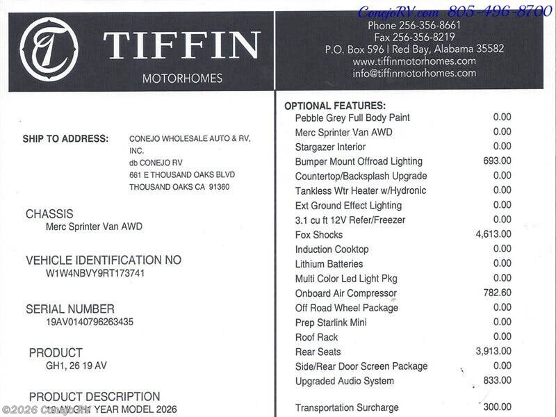 2026 Tiffin GH1 AWD Sprinter Mercedes Turbo Diesel 540AH Battle Born Lithium Ion Kit ***MSRP is $242,022.60, Our Only $159,990*** Optional Upgraded Audio System, Optional On Board Air Compressor, Optional Rear Seats, Optional Fox Shocks Suspension, Optional Bumper Mount Offroad Lighting, ***Built on a Fully Featured Mercedes Benz Sprinter Chassis, 2500 4-Cylinder Diesel High Output AWD, Upgraded 9G-TRONIC Transmission, Hydraulic 4 Wheel Antilock Braking, Adaptive Cruise Control, Active Brake Assist, Active Lane Keeping Assist, Light/Rain Sensor/Blind Spot Monitoring with Indicator Lights in Side Mirror, Collision Prevention Assist/High Beam Assist, Driver and Passenger Airbags, 540AH Battle Born Lithium-Ion Battery Kit, 3,000W Inverter, Inverter Charger, Hydronic Heating, 15,000-BTU Air Conditioner with Heat Pump, Soft-Start & Bluetooth, Aqua-Hot® 125 Modular Diesel Heat Exchanger, 220-Watt Solar Panel with 30-Amp Controller, Rear Bedroom with 49" x 79" Power Lift Bed with Gear Garage Below, Fully Enclosed Bathroom with Showerhead, Wet Bath Size 36”x24", Removable Shelves Convert to Wet Storage Cabinet, Swiveling Cassette Toilet, Nice Kitchen With Solid Surface Counter Tops, Stowable Counter Top Extension, Stowable Single Burner Induction Stove Top, Stainless Steel Sink w/Faucet and Pull-Out Sprayer, Larger 12-Volt, 3.1-Cubic Foot Refrigerator with Freezer, Pantry, Fold-Down Exterior Table, 2 Rear Seats with 3 Point Seat Belts, Radio/Rearview Monitor System, MBUX® Touchscreen Multimedia Infotainment Center w/Navigation, Wi-Fi Hotspot, Intelligent Voice Control and Rear Camera, Heated Leather Seats with Electronic Controls Slide/Swivel/Recline, Side & Rear Screen Door, Powered Patio Awning with Integrated LED Lighting, Water Heater Bypass System, Water Filter, Water Pump, Gravity Water Fill, Galley Sink Drain Macerator Pump, Fresh Water Recirculation System, Low-Profile Roof Rack, Single-Row Low-Profile Light Bar, Electrically Adjustable Side-view Mirrors, Fixed Side-Mounted All-Welded Ladder, Rear Mud Guards, Low-Profile Running Board with 12-Volt Lighting, Fold-Down Table, ARB On-Board Air Compressor w/ Front and Rear Chucks, Custom Offroad Tiffin Adventure Wheels, Front and Rear LT 245/70R 17 BFGoodrich® All-Terrain T/A® Tires, Parking Package with 360° View Camera, Trailer Hitch 5,000-lb. Drawbar/500-lb. Maximum Vertical Tongue Weight , Brand New & Just Arrived! ***MSRP is $242,022.60, Our Only $159,990*** We have some fantastic financing and take trades also! It is our #1 goal that your experience with our company is an enjoyable one with our staff of industry professionals, Conejo Wholesale Auto & RV, Exclusive Ventura County Dealer For Winnebago Navion, Revel, Solis, Ekko, and Travato, All Storyteller Products, Outside Van Syncline and Approach, Tiffin GH1, All Roadtrek Products, We Also Carry Some Quality Pre-Owned Motorhomes which come with Our 45 Day/1000 Mile In-House Warranty at No Charge, Conejo RV, 661 E. Thousand Oaks Blvd, Thousand Oaks, CA 91360, 805-496-8700, Open 7 Days, 9am to 6pm, All Coaches Fully Inspected, Serviced and Detailed, Come Experience the No Pressure No Haggle Sales Approach at Conejo RV, We Also Buy Clean Late Model Coaches, 1 Year Free Camping Membership Included Ask For Details! (***plus tax & license fees***)