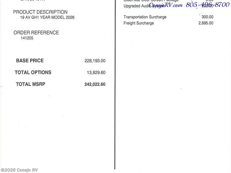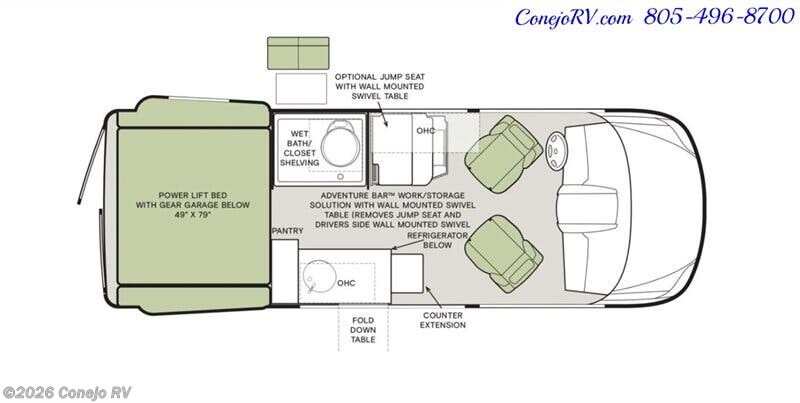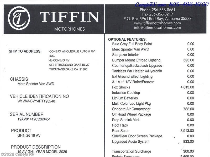 2026 Tiffin GH1 AWD Sprinter Mercedes Turbo Diesel 540AH Battle Born Lithium Ion Kit ***MSRP is $242,022.60, Our Only $159,990*** Optional Upgraded Audio System, Optional On Board Air Compressor, Optional Rear Seats, Optional Fox Shocks Suspension, Optional Bumper Mount Offroad Lighting, ***Built on a Fully Featured Mercedes Benz Sprinter Chassis, 2500 4-Cylinder Diesel High Output AWD, Upgraded 9G-TRONIC Transmission, Hydraulic 4 Wheel Antilock Braking, Adaptive Cruise Control, Active Brake Assist, Active Lane Keeping Assist, Light/Rain Sensor/Blind Spot Monitoring with Indicator Lights in Side Mirror, Collision Prevention Assist/High Beam Assist, Driver and Passenger Airbags, 540AH Battle Born Lithium-Ion Battery Kit, 3,000W Inverter, Inverter Charger, Hydronic Heating, 15,000-BTU Air Conditioner with Heat Pump, Soft-Start & Bluetooth, Aqua-Hot® 125 Modular Diesel Heat Exchanger, 220-Watt Solar Panel with 30-Amp Controller, Rear Bedroom with 49" x 79" Power Lift Bed with Gear Garage Below, Fully Enclosed Bathroom with Showerhead, Wet Bath Size 36”x24", Removable Shelves Convert to Wet Storage Cabinet, Swiveling Cassette Toilet, Nice Kitchen With Solid Surface Counter Tops, Stowable Counter Top Extension, Stowable Single Burner Induction Stove Top, Stainless Steel Sink w/Faucet and Pull-Out Sprayer, Larger 12-Volt, 3.1-Cubic Foot Refrigerator with Freezer, Pantry, Fold-Down Exterior Table, 2 Rear Seats with 3 Point Seat Belts, Radio/Rearview Monitor System, MBUX® Touchscreen Multimedia Infotainment Center w/Navigation, Wi-Fi Hotspot, Intelligent Voice Control and Rear Camera, Heated Leather Seats with Electronic Controls Slide/Swivel/Recline, Side & Rear Screen Door, Powered Patio Awning with Integrated LED Lighting, Water Heater Bypass System, Water Filter, Water Pump, Gravity Water Fill, Galley Sink Drain Macerator Pump, Fresh Water Recirculation System, Low-Profile Roof Rack, Single-Row Low-Profile Light Bar, Electrically Adjustable Side-view Mirrors, Fixed Side-Mounted All-Welded Ladder, Rear Mud Guards, Low-Profile Running Board with 12-Volt Lighting, Fold-Down Table, ARB On-Board Air Compressor w/ Front and Rear Chucks, Custom Offroad Tiffin Adventure Wheels, Front and Rear LT 245/70R 17 BFGoodrich® All-Terrain T/A® Tires, Parking Package with 360° View Camera, Trailer Hitch 5,000-lb. Drawbar/500-lb. Maximum Vertical Tongue Weight , Brand New & Just Arrived! ***MSRP is $242,022.60, Our Only $159,990*** We have some fantastic financing and take trades also! It is our #1 goal that your experience with our company is an enjoyable one with our staff of industry professionals, Conejo Wholesale Auto & RV, Exclusive Ventura County Dealer For Winnebago Navion, Revel, Solis, Ekko, and Travato, All Storyteller Products, Outside Van Syncline and Approach, Tiffin GH1, All Roadtrek Products, We Also Carry Some Quality Pre-Owned Motorhomes which come with Our 45 Day/1000 Mile In-House Warranty at No Charge, Conejo RV, 661 E. Thousand Oaks Blvd, Thousand Oaks, CA 91360, 805-496-8700, Open 7 Days, 9am to 6pm, All Coaches Fully Inspected, Serviced and Detailed, Come Experience the No Pressure No Haggle Sales Approach at Conejo RV, We Also Buy Clean Late Model Coaches, 1 Year Free Camping Membership Included Ask For Details! (***plus tax & license fees***)