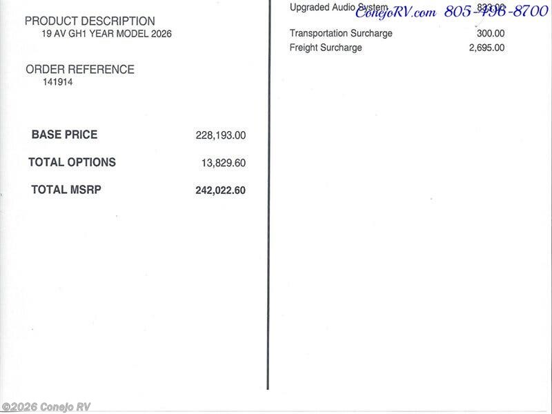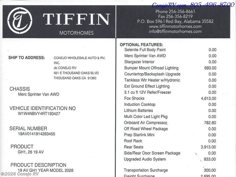 2026 Tiffin GH1 AWD Sprinter Mercedes Turbo Diesel 540AH Battle Born Lithium Ion ***MSRP is $242,022.60, Our Only $159,990*** Optional Upgraded Audio System, Optional On Board Air Compressor, Optional Rear Seats, Optional Fox Shocks Suspension, Optional Bumper Mount Offroad Lighting, ***Built on a Fully Featured Mercedes Benz Sprinter Chassis, 2500 4-Cylinder Diesel High Output AWD, Upgraded 9G-TRONIC Transmission, Hydraulic 4 Wheel Antilock Braking, Adaptive Cruise Control, Active Brake Assist, Active Lane Keeping Assist, Light/Rain Sensor/Blind Spot Monitoring with Indicator Lights in Side Mirror, Collision Prevention Assist/High Beam Assist, Driver and Passenger Airbags, 540AH Battle Born Lithium-Ion Battery Kit, 3,000W Inverter, Inverter Charger, Hydronic Heating, 15,000-BTU Air Conditioner with Heat Pump, Soft-Start & Bluetooth, Aqua-Hot® 125 Modular Diesel Heat Exchanger, 220-Watt Solar Panel with 30-Amp Controller, Rear Bedroom with 49" x 79" Power Lift Bed with Gear Garage Below, Fully Enclosed Bathroom with Showerhead, Wet Bath Size 36”x24", Removable Shelves Convert to Wet Storage Cabinet, Swiveling Cassette Toilet, Nice Kitchen With Solid Surface Counter Tops, Stowable Counter Top Extension, Stowable Single Burner Induction Stove Top, Stainless Steel Sink w/Faucet and Pull-Out Sprayer, Larger 12-Volt, 3.1-Cubic Foot Refrigerator with Freezer, Pantry, Fold-Down Exterior Table, 2 Rear Seats with 3 Point Seat Belts, Radio/Rearview Monitor System, MBUX® Touchscreen Multimedia Infotainment Center w/Navigation, Wi-Fi Hotspot, Intelligent Voice Control and Rear Camera, Heated Leather Seats with Electronic Controls Slide/Swivel/Recline, Side & Rear Screen Door, Powered Patio Awning with Integrated LED Lighting, Water Heater Bypass System, Water Filter, Water Pump, Gravity Water Fill, Galley Sink Drain Macerator Pump, Fresh Water Recirculation System, Low-Profile Roof Rack, Single-Row Low-Profile Light Bar, Electrically Adjustable Side-view Mirrors, Fixed Side-Mounted All-Welded Ladder, Rear Mud Guards, Low-Profile Running Board with 12-Volt Lighting, Fold-Down Table, ARB On-Board Air Compressor w/ Front and Rear Chucks, Custom Offroad Tiffin Adventure Wheels, Front and Rear LT 245/70R 17 BFGoodrich® All-Terrain T/A® Tires, Parking Package with 360° View Camera, Trailer Hitch 5,000-lb. Drawbar/500-lb. Maximum Vertical Tongue Weight , Brand New & Just Arrived! ***MSRP is $242,022.60, Our Only $159,990*** We have some fantastic financing and take trades also! It is our #1 goal that your experience with our company is an enjoyable one with our staff of industry professionals, Conejo Wholesale Auto & RV, Exclusive Ventura County Dealer For Winnebago Navion, Revel, Solis, Ekko, and Travato, All Storyteller Products, Outside Van Syncline and Approach, Tiffin GH1, All Roadtrek Products, We Also Carry Some Quality Pre-Owned Motorhomes which come with Our 45 Day/1000 Mile In-House Warranty at No Charge, Conejo RV, 661 E. Thousand Oaks Blvd, Thousand Oaks, CA 91360, 805-496-8700, Open 7 Days, 9am to 6pm, All Coaches Fully Inspected, Serviced and Detailed, Come Experience the No Pressure No Haggle Sales Approach at Conejo RV, We Also Buy Clean Late Model Coaches, 1 Year Free Camping Membership Included Ask For Details! (***plus tax & license fees***)