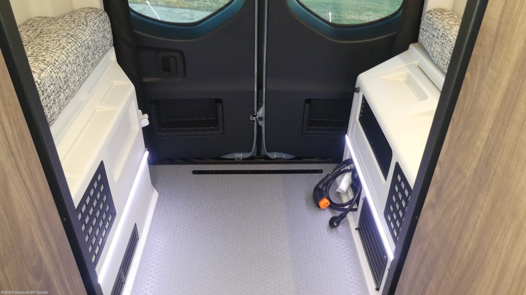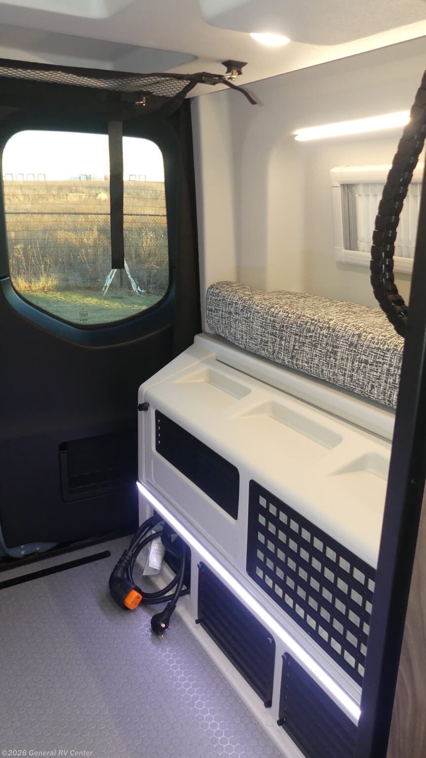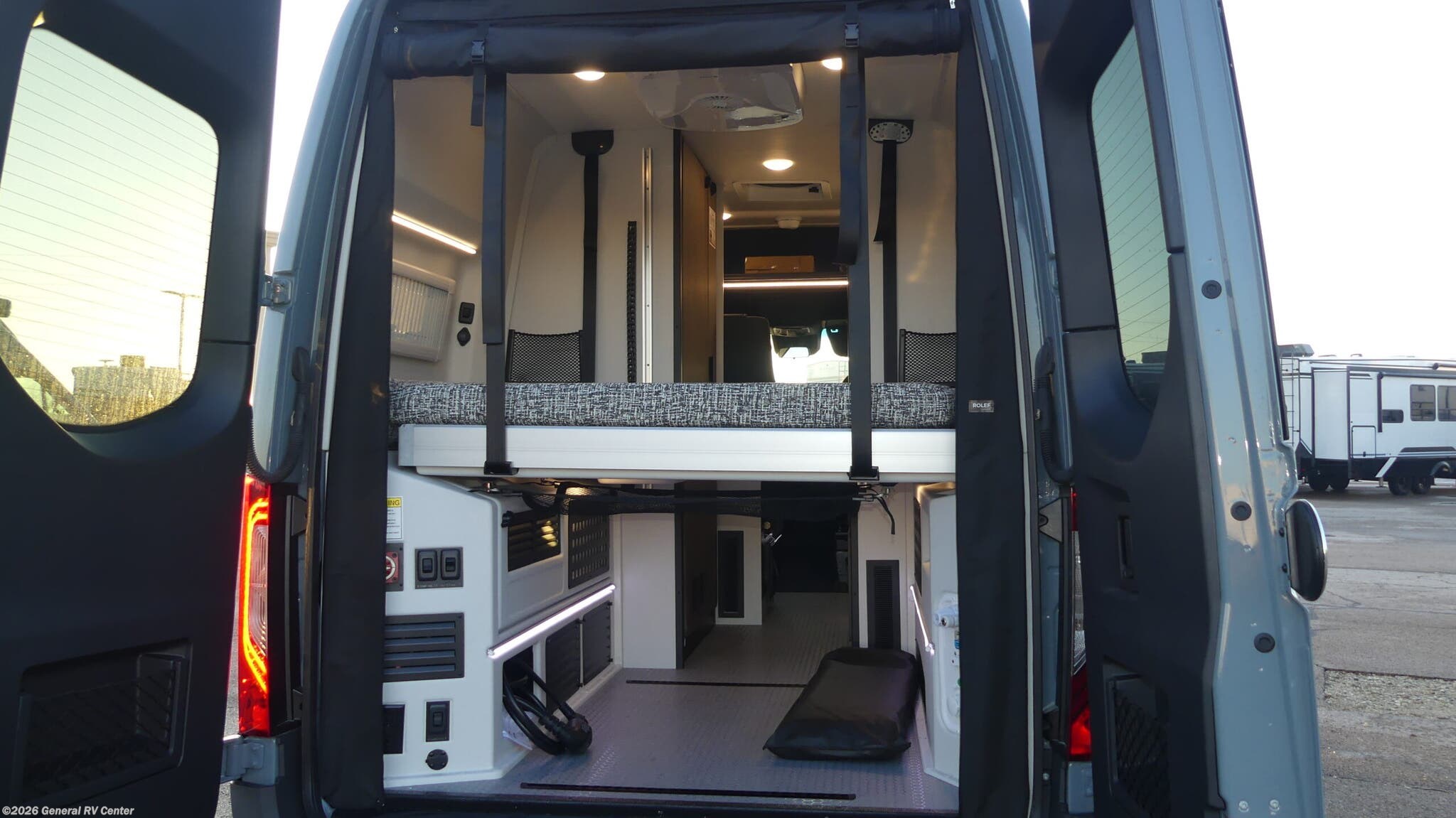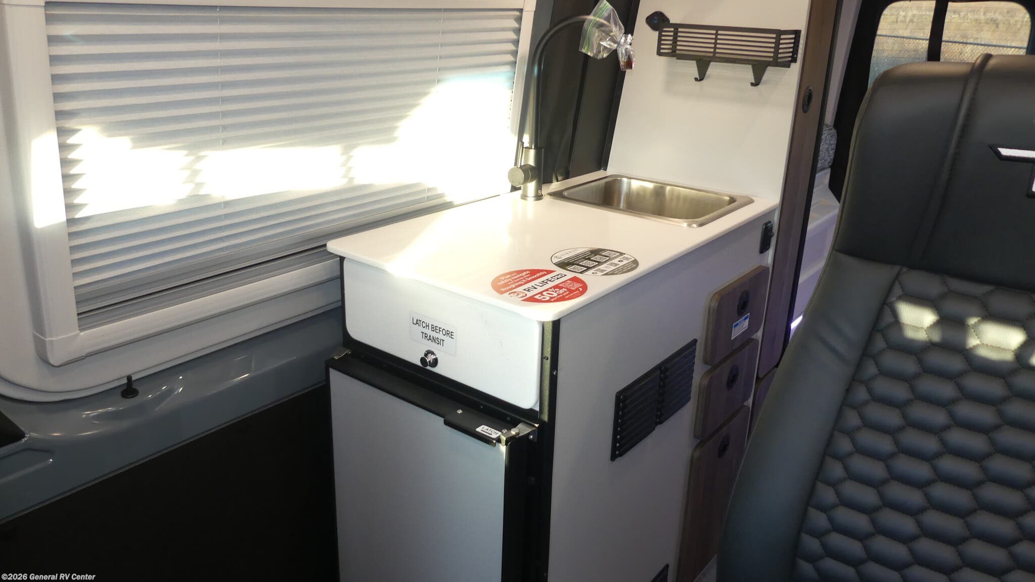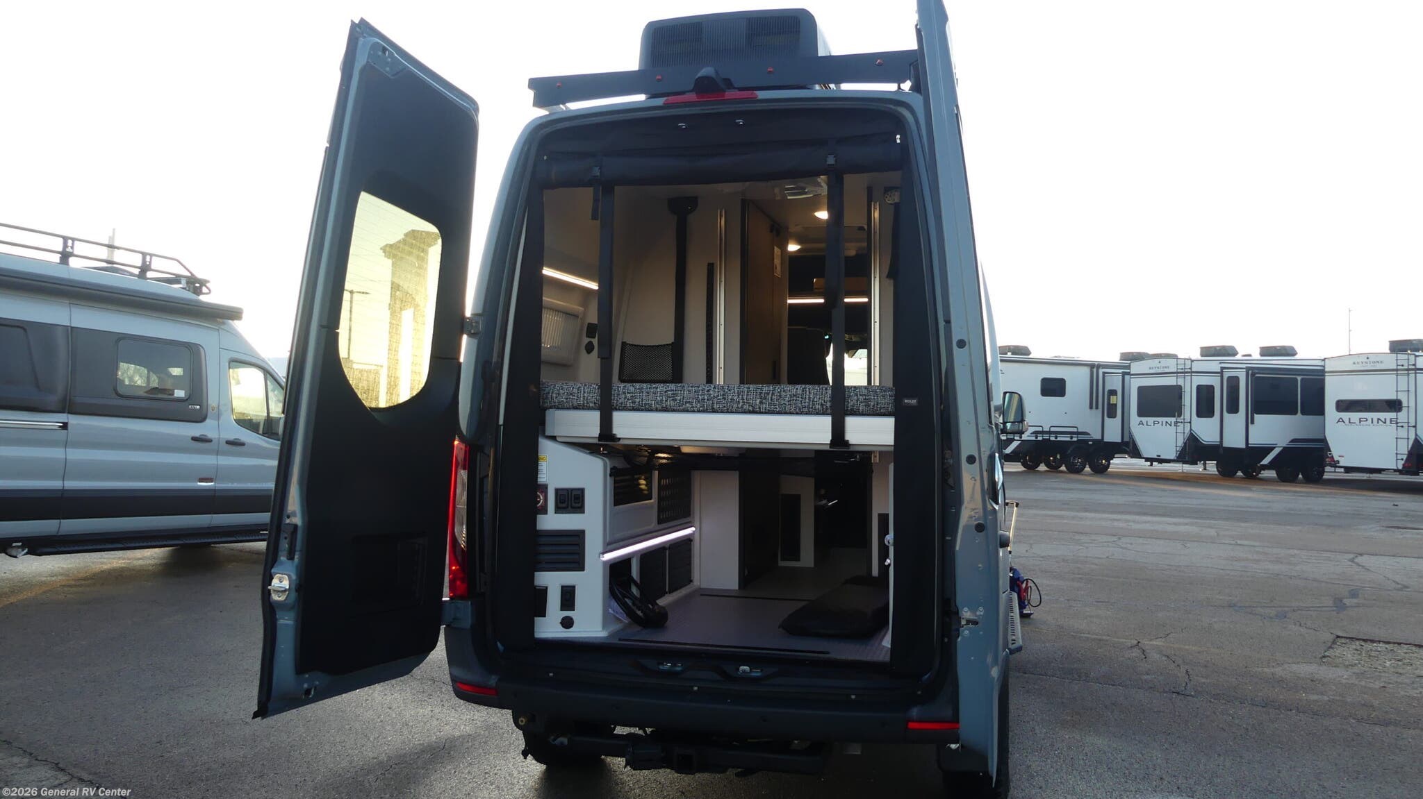 Tiffin Motorhomes GH1 Class B diesel motorhome highlights: 49" x 79" Gear Garage Below Power Bed Wet Bath Pantry All-Wheel Drive Pick a place, any place, and start packing. This off-road capable diesel van features a 49" x 79" gear garage beneath the power lift bed where you can store camp chairs, paddle boards for the lake, outdoor games and plenty of hiking gear. The on-board wet bath will keep you fresh and clean, and you can easily whip up meals and snacks in the kitchen with a single-burner induction cooktop and refrigerator beneath the counter for your perishables. There is also a sink for cleaning up and a removable counter extension. Both front driver and passenger seats swivel to the back so you'll have plenty of seating even with company. At night, the power lift bed will allow you to get a great night's rest so you can enjoy it all again the next day! The GH1 by Tiffin is the perfect couples coach that can take you just about anywhere you dream to go. The all-wheel drive chassis is equipped with a Fox Shock suspension package so that you can handle any type of terrain. You will enjoy on-board solar, climate controls with wall-mounted thermostat that features a built-in temperature sensor to keep you comfortable so you can go off the beaten path and stay awhile. Solid surface countertops are easy to clean and the Premium hardwood Plywood with high-pressure laminate lower cabinets pairs nicely with the grey nickel plate thermoplastic polyolefin flooring. Enjoy cooking meals using the portable single-burner induction cooktop and 12-volt 3.1 cu. ft. refrigerator freezer with an integrated whiteboard for your perishables. You are going to love traveling in this class B diesel adventure van that will take you anywhere, even a little off-road!