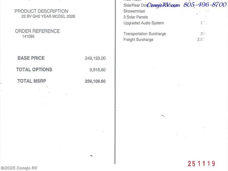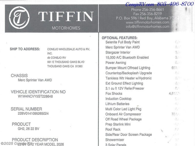 2026 Tiffin GH2 AWD Sprinter Mercedes 2500 EXT AWD Turbo Diesel 540AH Battle Born Lithium Ion Kit ***MSRP is $259,109.60, Our Price Only $189,990*** Ask About The $10,000 Dollar Factory Rebate Good Through 12-31-25 *** Optional Upgraded Audio System, Optional On Board Air Compressor, Optional Fox Shocks Suspension, Optional Bumper Mount Offroad Lighting, ***Built on a Fully Featured Mercedes Benz 2500 EXT AWD Sprinter Chassis, 4-Cylinder Diesel High Output, Upgraded 9G-TRONIC Transmission, Hydraulic 4 Wheel Antilock Braking, Adaptive Cruise Control, Active Brake Assist, Active Lane Keeping Assist, Light/Rain Sensor/Blind Spot Monitoring with Indicator Lights in Side Mirror, Collision Prevention Assist/High Beam Assist, Driver and Passenger Airbags, 540AH Battle Born Lithium-Ion Battery Kit, 3,000W Inverter, Inverter Charger, Hydronic Heating, 15,000-BTU Air Conditioner with Heat Pump & Bluetooth, Diesel Heat Exchanger, 330-Watt Solar Panel with 30-Amp Controller, Rear Bedroom with 49" x 79" Power Lift Bed with Gear Garage Below, Fully Enclosed Bathroom with Showerhead, Wet Bath Size 36”x24", Removable Shelves Convert to Wet Storage Cabinet, Swiveling Cassette Toilet, Beautiful Kitchen With Solid Surface Counter Tops, Stowable Counter Top Extension, Stowable Single Burner Induction Stove Top, Stainless Steel Sink w/Faucet and Pull-Out Sprayer, Larger 12-Volt, 3.1-Cubic Foot Refrigerator with Freezer, Fold-Down Exterior Table, Bench Seat With Lagun Style Table, Radio/Rearview Monitor System, MBUX® Touchscreen Multimedia Infotainment Center w/Navigation, Wi-Fi Hotspot, Intelligent Voice Control, Parking Package With 360 Degree View Camera, Heated Leather Seats with Electronic Controls Slide/Swivel/Recline, 12-volt Powerpoints, Side & Rear Screen Door, Powered Patio Awning with Integrated LED Lighting, Water Heater Bypass System, Water Filter, Water Pump, Gravity Water Fill, Exterior Water Fill Valve, SeeLeveL™ Tank Monitor, Fresh Water Hookup for City Water and Tank Fill, Galley Sink Drain Macerator Pump, Fresh Water Recirculation System, Privacy Shades for Front and Cab Door Windows, Low-Profile Roof Rack, Single-Row Low-Profile Light Bar, Exterior Patio Light, Fog Lights, LED Lights Under Exterior Running Boards, Electrically Adjustable Side-view Mirrors, Fixed Side-Mounted All-Welded Ladder, Rear Mud Guards, Low-Profile Running Board with 12-Volt Lighting, Fold-Down Table, ARB On-Board Air Compressor w/ Front and Rear Chucks, Custom Offroad Tiffin Adventure Wheels, Front and Rear LT 245/70R 17 BFGoodrich® All-Terrain T/A® Tires, Trailer Hitch 5,000-lb. Drawbar/500-lb. Maximum Vertical Tongue Weight , Brand New & Just Arrived! ***MSRP is $259,109.60 Our Price Only $189,990*** We have some fantastic financing and take trades also! It is our #1 goal that your experience with our company is an enjoyable one with our staff of industry professionals, Conejo Wholesale Auto & RV, Exclusive Ventura County Dealer For Winnebago Navion, Revel, Solis, Ekko, and Travato, All Storyteller Products, Outside Van Syncline and Approach, Tiffin GH1, All Roadtrek Products, We Also Carry Some Quality Pre-Owned Motorhomes which come with Our 45 Day/1000 Mile In-House Warranty at No Charge, Conejo RV, 661 E. Thousand Oaks Blvd, Thousand Oaks, CA 91360, 805-496-8700, Open 7 Days, 9am to 6pm, All Coaches Fully Inspected, Serviced and Detailed, Come Experience the No Pressure No Haggle Sales Approach at Conejo RV, We Also Buy Clean Late Model Coaches, 1 Year Free Camping Membership Included Ask For Details! (***plus tax & license fees***)