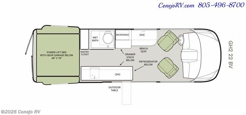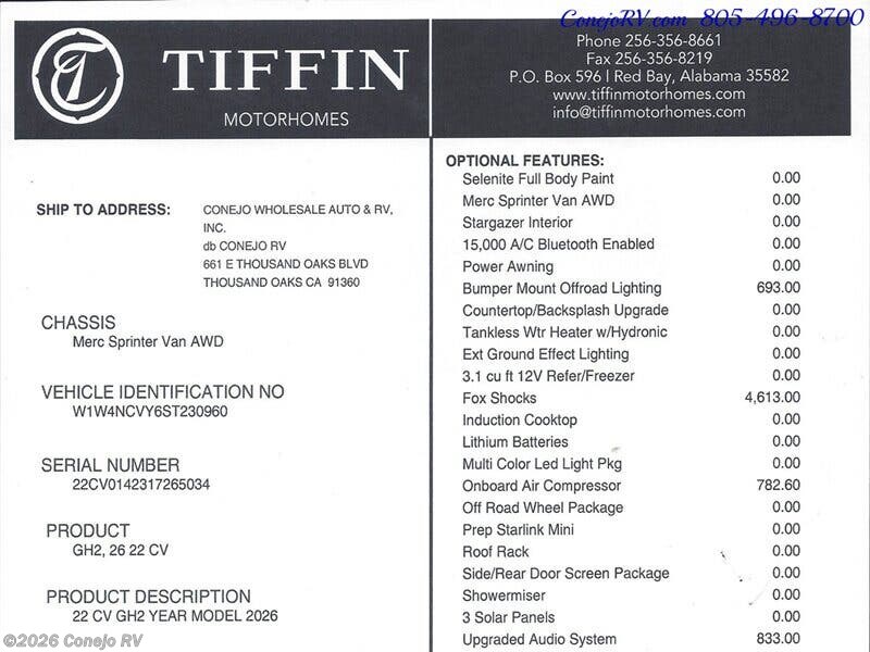 2026 Tiffin GH2 AWD Sprinter Mercedes 2500 EXT AWD Turbo Diesel 540AH Battle Born Lithium Ion Kit ***MSRP is $259,109.60, Our Price Only $189,990*** Optional Upgraded Audio System, Optional On Board Air Compressor, Optional Fox Shocks Suspension, Optional Bumper Mount Offroad Lighting, ***Built on a Fully Featured Mercedes Benz 2500 EXT AWD Sprinter Chassis, 4-Cylinder Diesel High Output, Upgraded 9G-TRONIC Transmission, Hydraulic 4 Wheel Antilock Braking, Adaptive Cruise Control, Active Brake Assist, Active Lane Keeping Assist, Light/Rain Sensor/Blind Spot Monitoring with Indicator Lights in Side Mirror, Collision Prevention Assist/High Beam Assist, Driver and Passenger Airbags, 540AH Battle Born Lithium-Ion Battery Kit, 3,000W Inverter, Inverter Charger, Hydronic Heating, 15,000-BTU Air Conditioner with Heat Pump & Bluetooth, Diesel Heat Exchanger, 330-Watt Solar Panel with 30-Amp Controller, Rear Bedroom with 49" x 79" Power Lift Bed with Gear Garage Below, Fully Enclosed Bathroom with Showerhead, Wet Bath Size 36”x24", Removable Shelves Convert to Wet Storage Cabinet, Swiveling Cassette Toilet, Beautiful Kitchen With Solid Surface Counter Tops, Stowable Counter Top Extension, Stowable Single Burner Induction Stove Top, Stainless Steel Sink w/Faucet and Pull-Out Sprayer, Larger 12-Volt, 3.1-Cubic Foot Refrigerator with Freezer, Fold-Down Exterior Table, Workstation, Radio/Rearview Monitor System, MBUX® Touchscreen Multimedia Infotainment Center w/Navigation, Wi-Fi Hotspot, Intelligent Voice Control, Parking Package With 360 Degree View Camera, Heated Leather Seats with Electronic Controls Slide/Swivel/Recline, 12-volt Powerpoints, Side & Rear Screen Door, Powered Patio Awning with Integrated LED Lighting, Water Heater Bypass System, Water Filter, Water Pump, Gravity Water Fill, Exterior Water Fill Valve, SeeLeveL™ Tank Monitor, Fresh Water Hookup for City Water and Tank Fill, Galley Sink Drain Macerator Pump, Fresh Water Recirculation System, Privacy Shades for Front and Cab Door Windows, Low-Profile Roof Rack, Single-Row Low-Profile Light Bar, Exterior Patio Light, Fog Lights, LED Lights Under Exterior Running Boards, Electrically Adjustable Side-view Mirrors, Fixed Side-Mounted All-Welded Ladder, Rear Mud Guards, Low-Profile Running Board with 12-Volt Lighting, Fold-Down Table, ARB On-Board Air Compressor w/ Front and Rear Chucks, Custom Offroad Tiffin Adventure Wheels, Front and Rear LT 245/70R 17 BFGoodrich® All-Terrain T/A® Tires, Trailer Hitch 5,000-lb. Drawbar/500-lb. Maximum Vertical Tongue Weight , Brand New & Just Arrived! ***MSRP is $259,109.60 Our Price Only $189,990*** We have some fantastic financing and take trades also! It is our #1 goal that your experience with our company is an enjoyable one with our staff of industry professionals, Conejo Wholesale Auto & RV, Exclusive Ventura County Dealer For Winnebago Navion, Revel, Solis, Ekko, and Travato, All Storyteller Products, Outside Van Syncline and Approach, Tiffin GH1, All Roadtrek Products, We Also Carry Some Quality Pre-Owned Motorhomes which come with Our 45 Day/1000 Mile In-House Warranty at No Charge, Conejo RV, 661 E. Thousand Oaks Blvd, Thousand Oaks, CA 91360, 805-496-8700, Open 7 Days, 9am to 6pm, All Coaches Fully Inspected, Serviced and Detailed, Come Experience the No Pressure No Haggle Sales Approach at Conejo RV, We Also Buy Clean Late Model Coaches, 1 Year Free Camping Membership Included Ask For Details! (***plus tax & license fees***)
