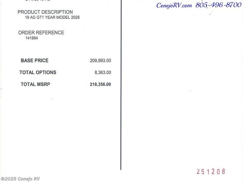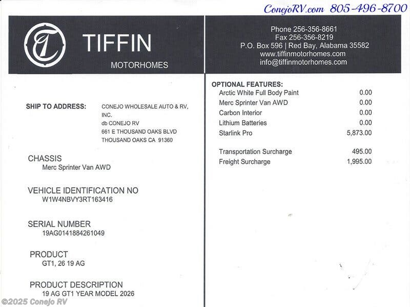 2026 Tiffin GT1 AWD Mercedes Sprinter Turbo Diesel Luxury Touring Van ***MSRP is 218,356 Our Price Only 169,990*** Built on a Fully Featured Mercedes Benz Sprinter Chassis, 2500 4-Cylinder Diesel High Output AWD, Upgraded 9G-TRONIC Transmission, Hydraulic 4 Wheel Antilock Braking, Adaptive Cruise Control, Active Brake Assist, Active Lane Keeping Assist, Light/Rain Sensor/Blind Spot Monitoring with Indicator Lights in Side Mirror, Collision Prevention Assist/High Beam Assist, 540 Amp-Hour Lithium Batteries, 3,000W Inverter/ Charger, Aqua Hot Hydronic Heating, 15,000 BTU Energy Efficient Variable Speed Gree A/C, Optional Factory Installed Starlink® Pro, Rear Power Lounge With Power Ottomans that Converts to Queen Size Bed, Bedroom Flatscreen TV, Overhead Cabinets, Fully Enclosed Bathroom with Showerhead, Mirror, Sink & Toilet, Beautiful Kitchen With Solid Surface Counter Tops, Matching Counter Top Pop Up Extension, Built In Induction Stove Top, Stainless Steel Sink w/Faucet, Refrigerator with Freezer, Convection Microwave, Fold-Down Exterior Table, Rear Power Shades, Lagun Dinning Table, MBUX® Touchscreen Multimedia Infotainment Center w/Navigation, Wi-Fi Hotspot, Intelligent Voice Control and Rear Camera, Heated Custom Upholstery Leather Seats with Electronic Controls Slide/Swivel/Recline, Dual Airbags, Girard® Powered Patio Awning with Integrated LED Lighting, Exterior Water Fill Valve,SeeLeveL™ Tank Monitor, Privacy Shades for Front and Cab Door Windows, Tinted Windows, Fog Lights, Brand New & Just Arrived! ***MSRP is $218,356 Our Price Only $169,990*** We have some fantastic financing and take trades also! It is our #1 goal that your experience with our company is an enjoyable one with our staff of industry professionals, Conejo Wholesale Auto & RV, Exclusive Ventura County Dealer For Winnebago Navion, Revel, Solis, Ekko, and Travato, All Storyteller Products, Outside Van Syncline and Approach, Tiffin GH1, All Roadtrek Products, We Also Carry Some Quality Pre-Owned Motorhomes which come with Our 45 Day/1000 Mile In-House Warranty at No Charge, Conejo RV, 661 E. Thousand Oaks Blvd, Thousand Oaks, CA 91360, 805-496-8700, Open 7 Days, 9am to 6pm, All Coaches Fully Inspected, Serviced and Detailed, Come Experience the No Pressure No Haggle Sales Approach at Conejo RV, We Also Buy Clean Late Model Coaches, 1 Year Free Camping Membership Included Ask For Details! (***plus tax & license fees***)