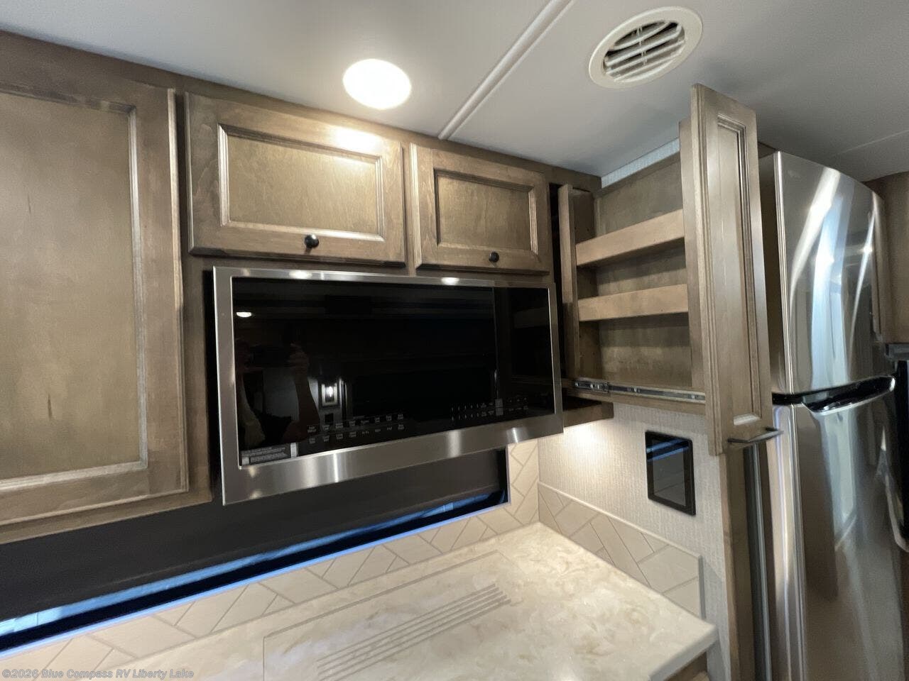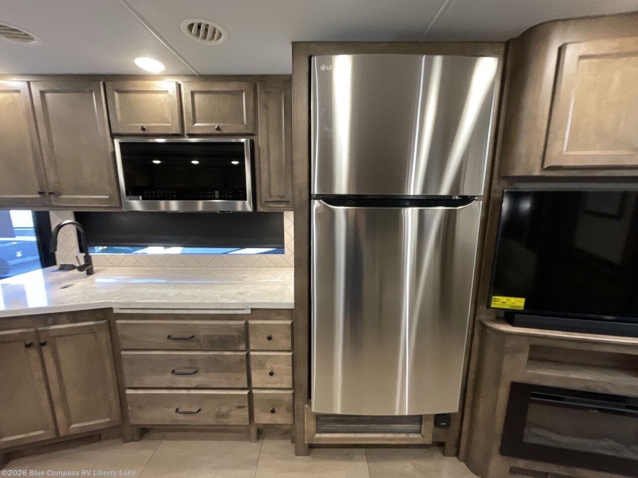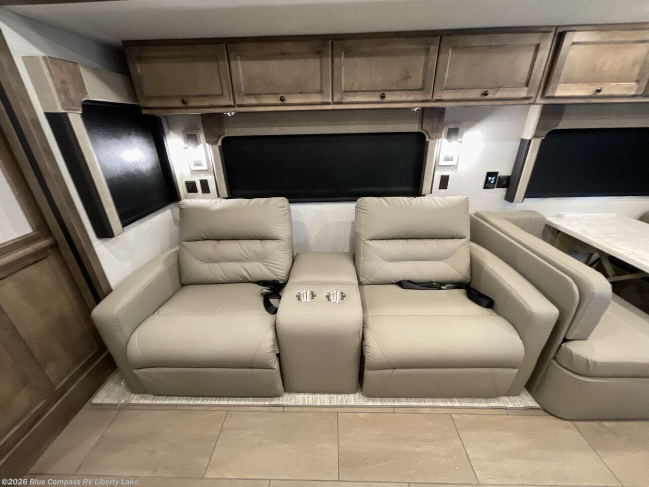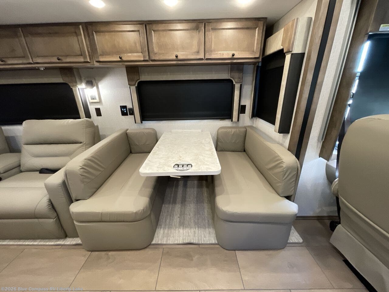 You will feel right at home in this motorhome! It features a rear private bedroom with a king bed slide that has an egress window behind it, a wardrobe with drawers, and an optional combo washer/dryer. Just outside the bedroom is the split-style bath where one person can freshen up in the shower while another uses the private toilet and sink. After you have prepared a delicious meal with the three burner liquid propane cooktop, you can enjoy it at the booth dinette-sleeper. The dinette can become your guests' sleeping space at night, along with the flip and fold sofa bed or the optional drop-down front bunk! You can also choose the optional theater seating if you don't need the additional sleeping space. This model also includes a living area TV with an optional fireplace below, a 20 cu. ft. stainless steel residential refrigerator with a top freezer, and many more interior comforts!