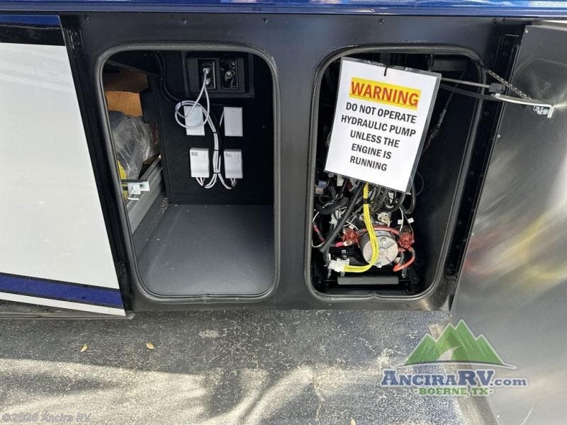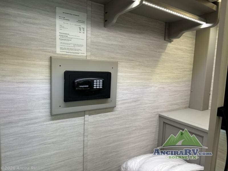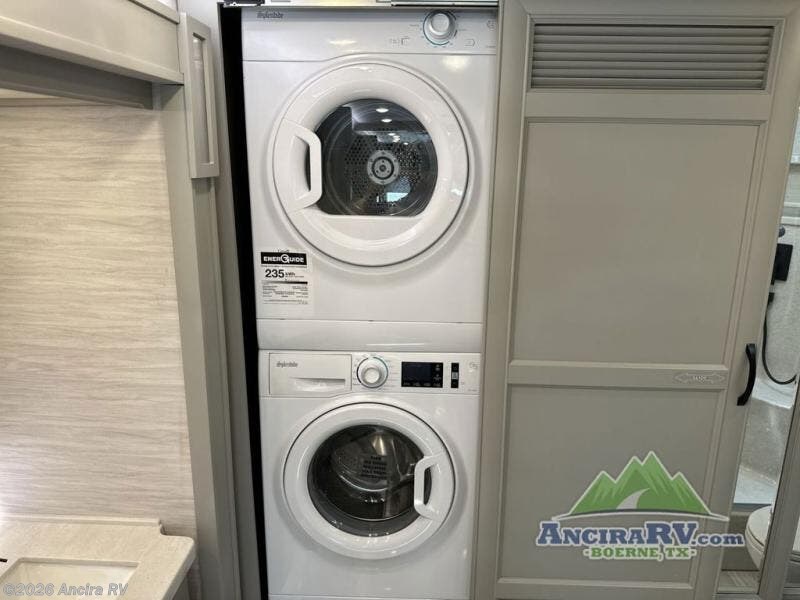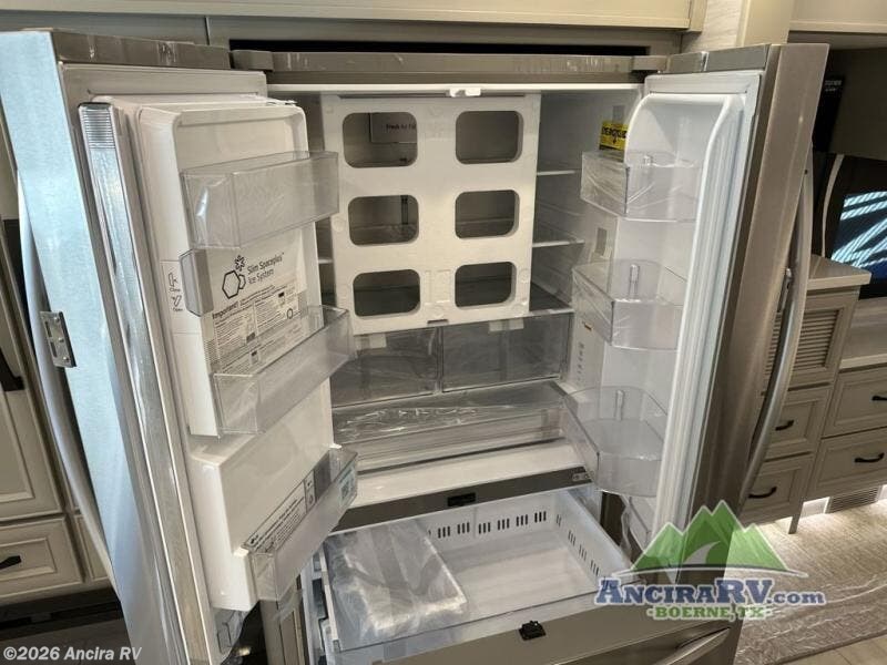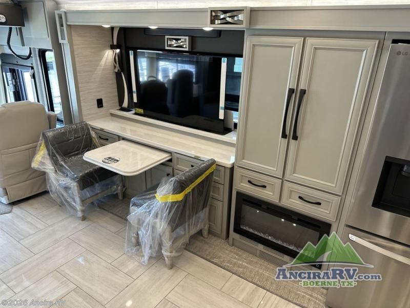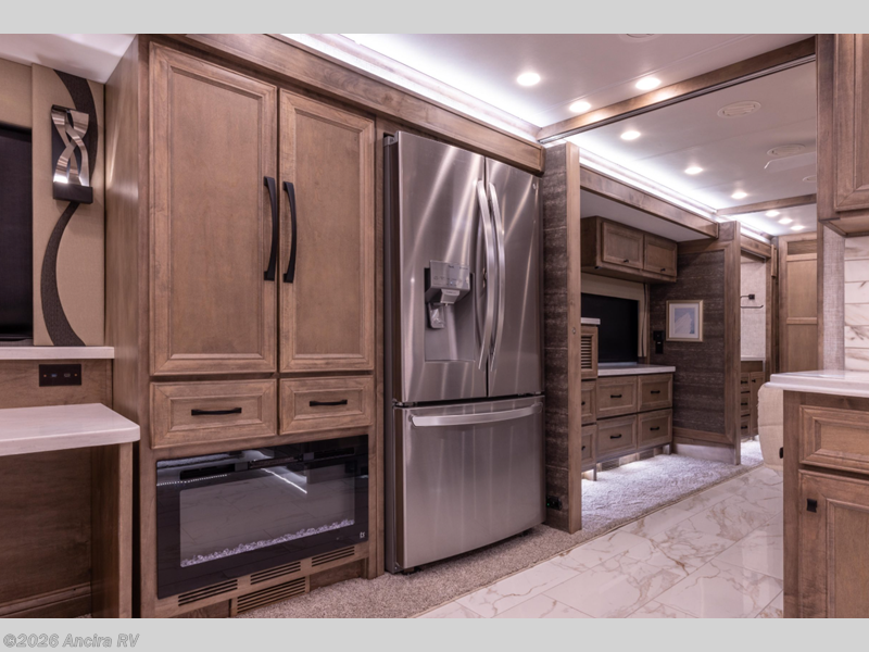 Travel the country with this comfortable motorhome! The full rear bathroom will have you feeling right at home with the dual sink vanity that has a tri-view mirror, a shower with a seat, and a closet with has an area prepped to add an optional stacked washer and dryer. Get a good night's rest on the 72" x 80" king bed slide with nightstands on either side across from stacked drawers and a mounted bedroom TV. You will have everything you need to prepare delicious home cooked meals including a smart convection microwave with an air fryer, storage drawers for ingredients, and you can even add an optional drawer-type dishwasher to make clean up easier. The air coil sofa bed offers another comfortable sleeping space for a guest or two, plus you can add an optional drop-down front bunk for even more sleeping space. This model also includes a dinette with chairs and an optional fireplace if you want to make your space even more cozy!