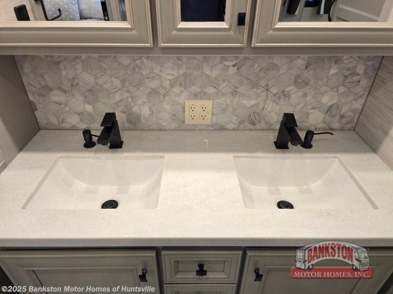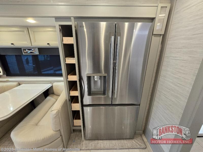 You will feel right at home in this coach with a master suite and king bed slide, mounted TV, laundry hamper, and stacked drawers. You all have quick access to the full rear bathroom. The bathroom not only has a dual sink vanity with a tri-view mirror for two to get ready at once, but also a shower with a seat and a large closet with an area next to it prepped to add an optional washer and dryer. The chef can prepare their best meals either indoors with the countertop extension and cooktop with convection microwave or outside if you add the optional outdoor grill. You can even watch the big game outside with the exterior TV with a sound bar!