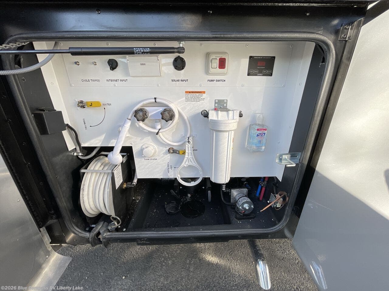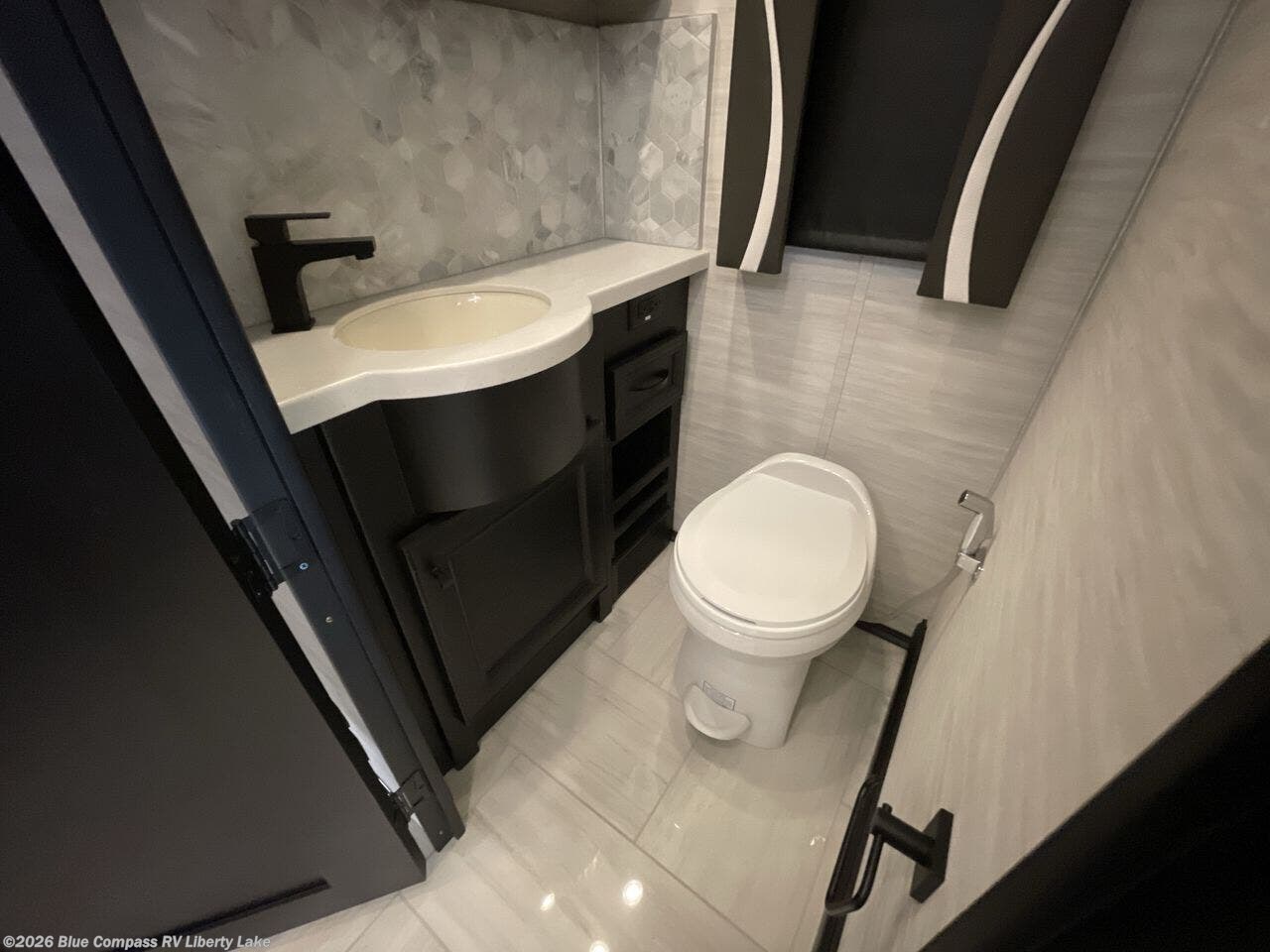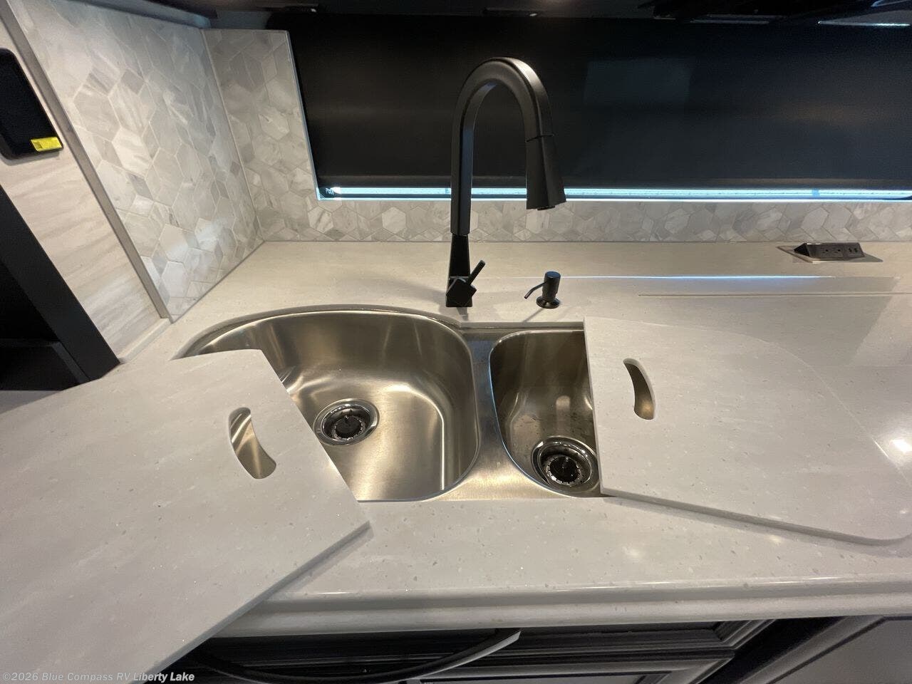 You will feel right at home in this coach with a master suite and king bed slide, mounted TV, laundry hamper, and stacked drawers. You all have quick access to the full rear bathroom. The bathroom not only has a dual sink vanity with a tri-view mirror for two to get ready at once, but also a shower with a seat and a large closet with an area next to it prepped to add an optional washer and dryer. The chef can prepare their best meals either indoors with the countertop extension and cooktop with convection microwave or outside if you add the optional outdoor grill. You can even watch the big game outside with the exterior TV with a sound bar!