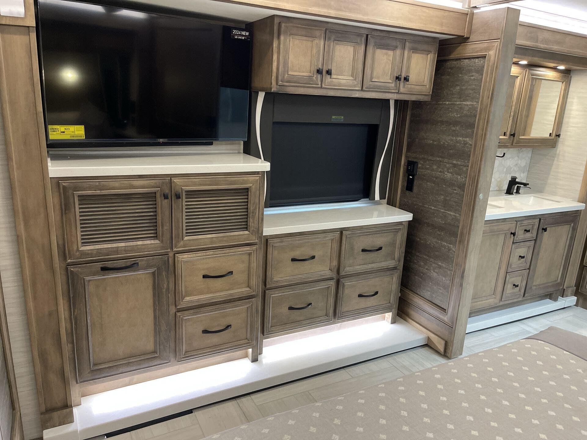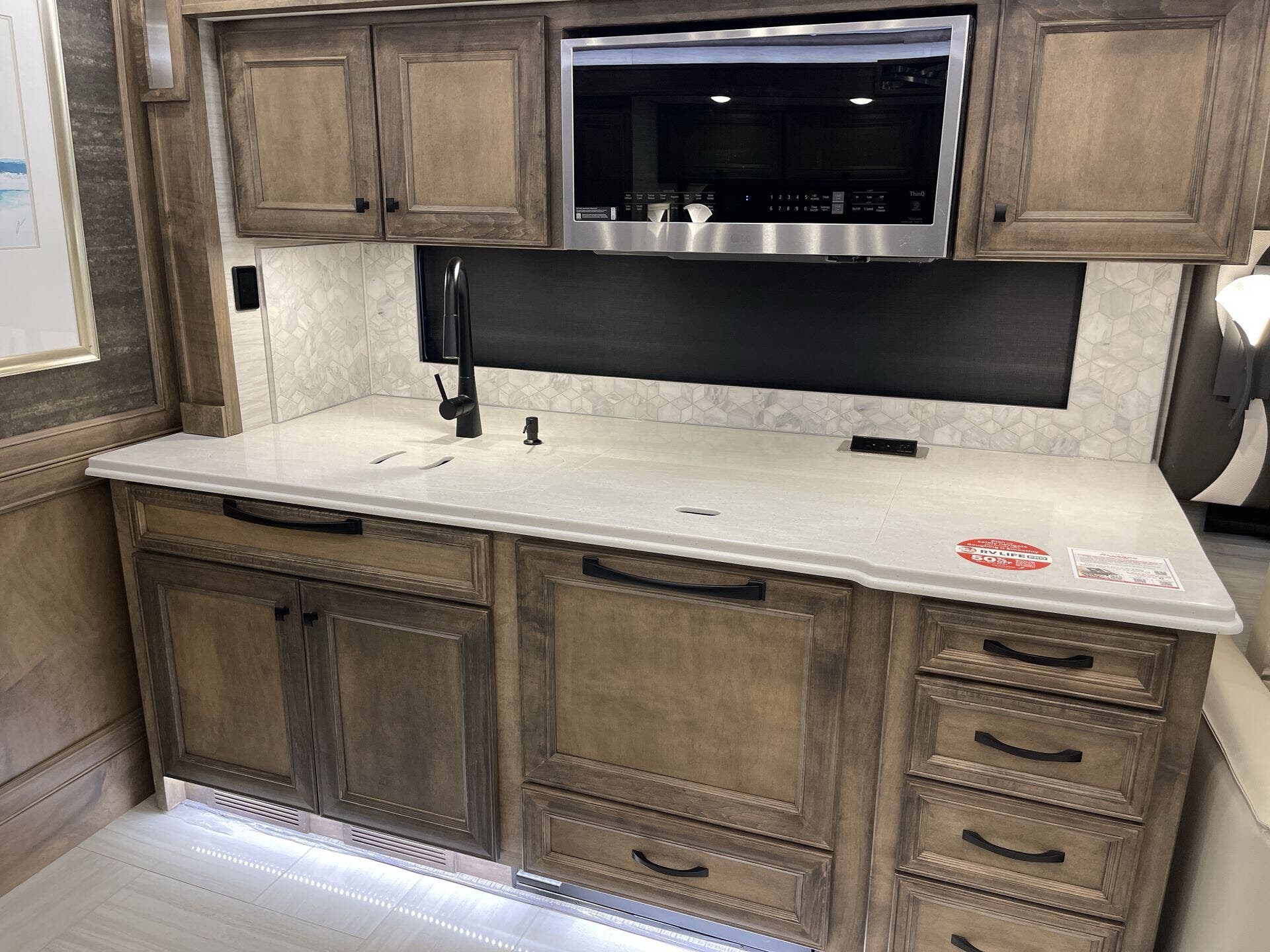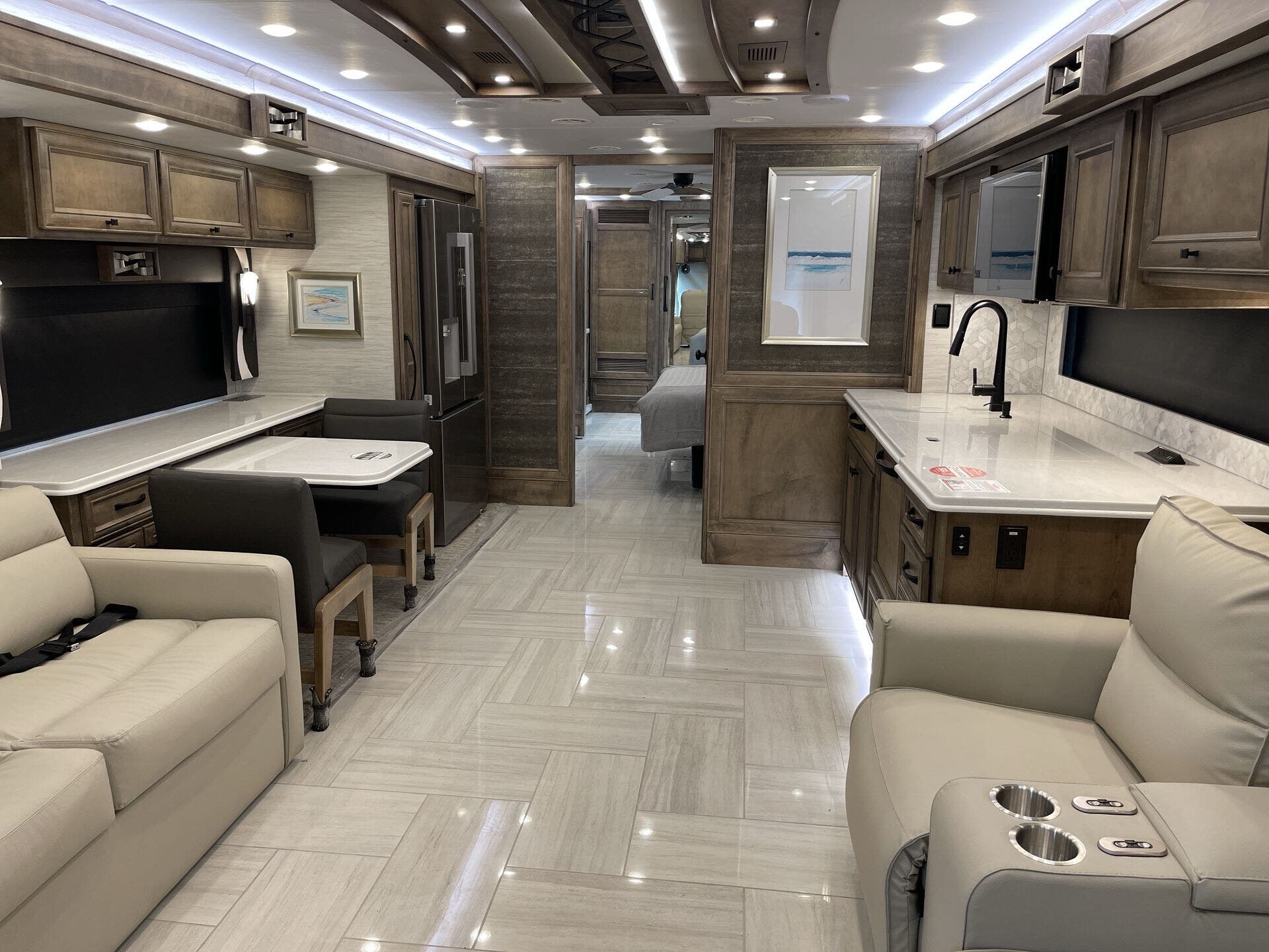 The Tiffin Phaeton boasts a versatile floorplan, including four slideouts for expanded living space. The 40IH model features a front entertainment area, a mid-kitchen, rear bath, and rear bedroom layout. This thoughtful design ensures that every inch is used efficiently, providing a luxurious environment for relaxation and entertainment.