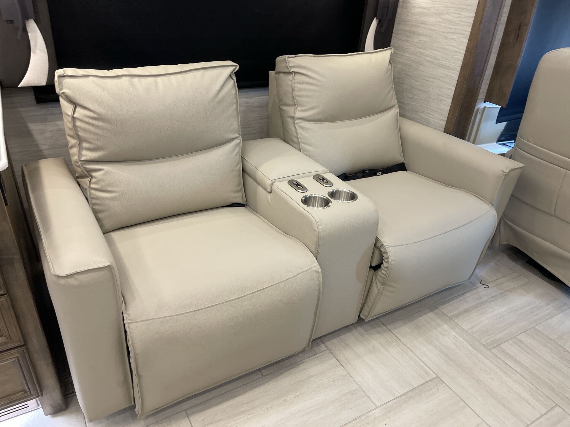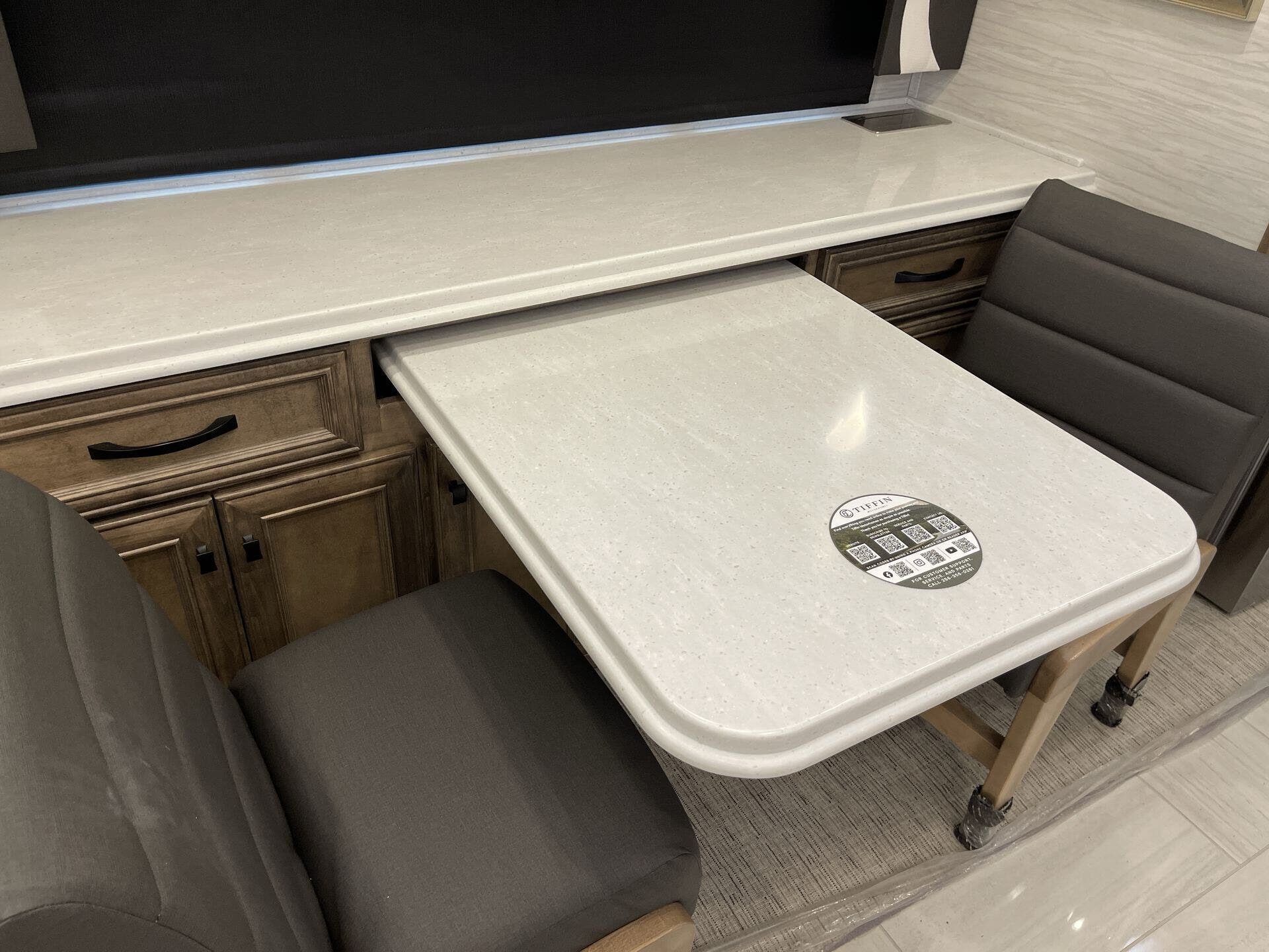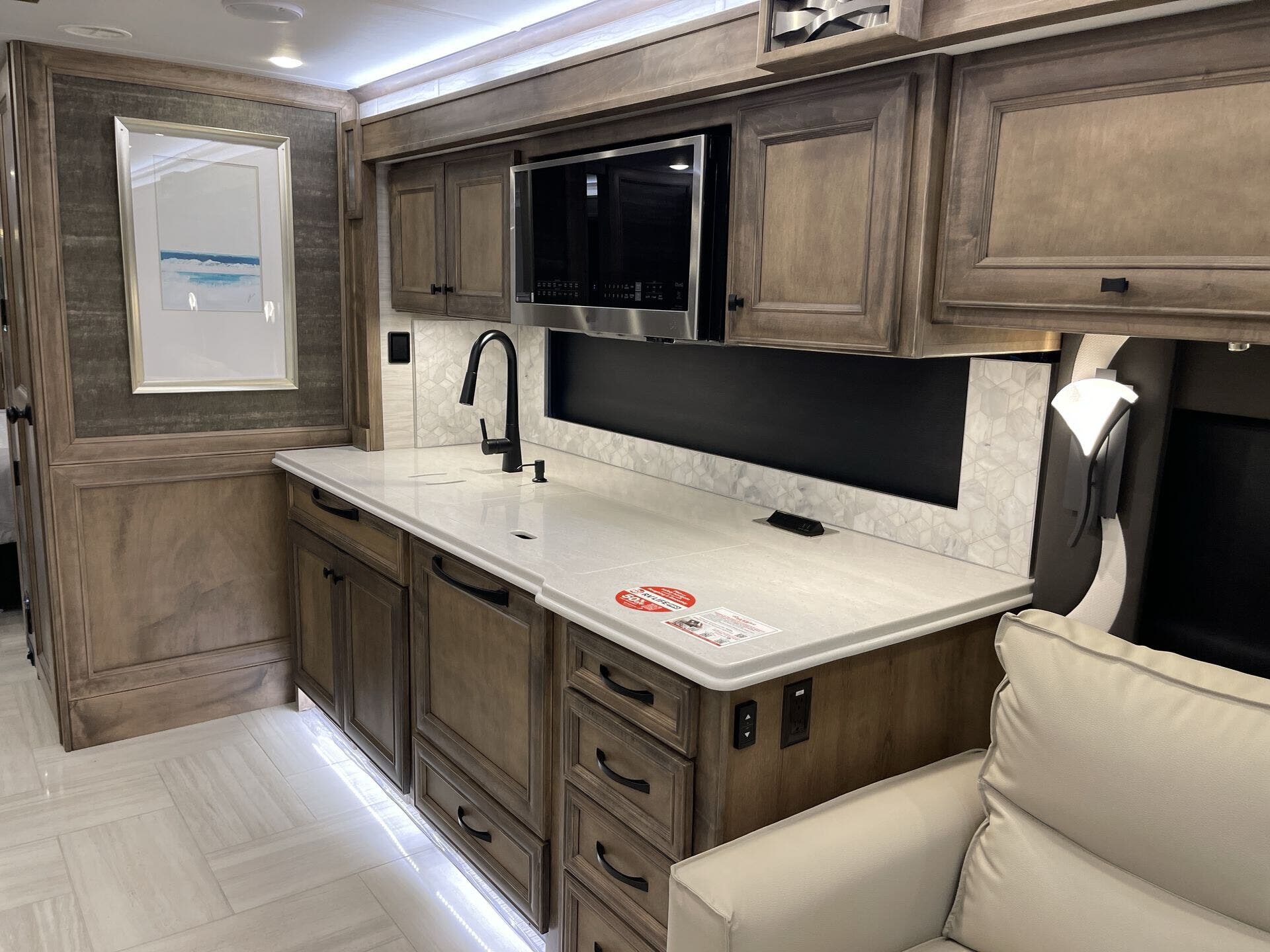 The Tiffin Phaeton boasts a versatile floorplan, including four slideouts for expanded living space. The 40IH model features a front entertainment area, a mid-kitchen, rear bath, and rear bedroom layout. This thoughtful design ensures that every inch is used efficiently, providing a luxurious environment for relaxation and entertainment.