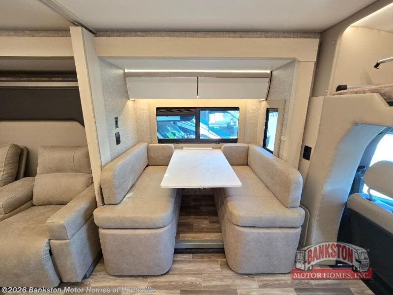 Escape to a world of comfort and adventure with this stunning Class C motorhome. Unwind in the luxurious rear bathroom, a peaceful oasis that's perfect for refreshing and rejuvenating. The king-sized Murphy bed is a romantic retreat, surrounded by a spacious wardrobe and ample storage. You can also catch up on your favorite shows or enjoy a movie night on the sleek overhead TV above the refrigerator. Whip up a storm and enjoy every bite in the gourmet kitchen featuring a sink, two-burner cooktop, and plenty of storage for your culinary creations. Additionally, the inviting booth dinette is perfect for gourmet meals, and the two captain chairs offer a comfortable spot to drive or take in the breathtaking views. Finally, for added sleeping space, the cozy bunk over the cab is perfect for kids or guests, ideal for families or groups who want to explore the great outdoors without sacrificing comfort.