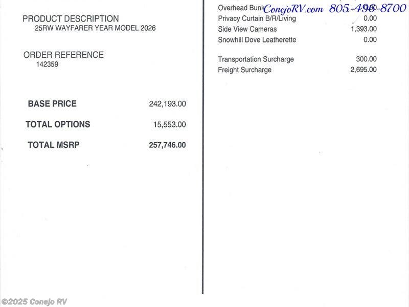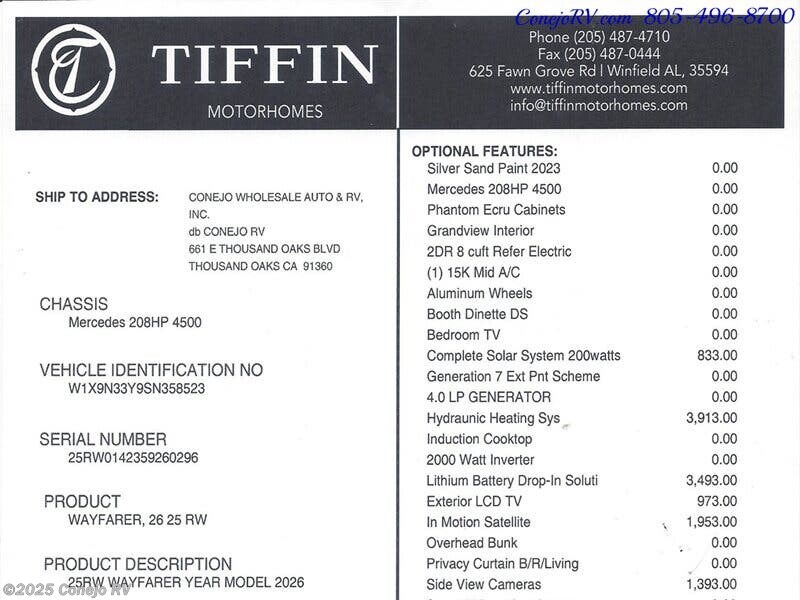 2026 Tiffin Wayfarer 25RW Murphy Bed Full Wall Slide-Out Booth Dinette Mercedes Turbo Diesel Full Body Paint ***MSRP is 257,746 Our Price Only 179,990*** Optional Complete Solar System With 200Watt Solar, Optional Exterior TV, Optional Lithium House Battery, Optional In Motion Satellite, Optional Side View Cameras, Optional Hydronic Heating System, *** Built on a Fully Featured Mercedes-Benz® Chassis 2.0L High-Output, Turbo-Diesel 4-Cylinder, 9-Speed Automatic Transmission with Overdrive, Active Brake Assist, Active Distance Assist Distronic®, Attention Assist, Traffic Sign Assist, Load Adaptive Electronic Stability Program, High Beam Assist, Active Lane Keeping Assist, Lippert Hydraulic Leveling, 4.0KW Generator, Driver Side Full Wall Slide with Convertible Couch That Coverts Into Queen Size Murphy Bed, Convertible Booth Dinette, Adjustable Flat screen TV, Rear Private Full Bath with Toilet and Full Shower, Nice Kitchen with Induction Cooktop, Large Basin Sink, Solid Surface Like Counter Tops with Matching Sink Cover, Convection Microwave Oven, LED Accent Lighting, Wood Plank-Like Linoleum Flooring, Shades Through Out Coach, Ultra-Leather Swivel/Recline Captain’s Chairs that Rotate to Function as Coach Seating with Adjustable Lumbar Support, Oversized 10” Touchscreen, Voice Recognition, USB Connections, Apple CarPlay and Android Auto, and SiriusXM Satellite Radio, Advanced GPS Navigation, Large Power Patio Awning with Integrated LED Lighting, Full Basement Storage, Outside Shower, Tow Package, Chrome Alloy Wheels, Brand New & Just Arrived, Other Models Available and More Arriving Soon, Custom Orders Available, ***MSRP is $257,746 Our Price Only 179,990*** We have some fantastic financing and take trades also! It is our #1 goal that your experience with our company is an enjoyable one with our staff of industry professionals, Conejo Wholesale Auto & RV, Exclusive Ventura County Dealer For Winnebago Navion, Revel, Solis, Ekko, and Travato, All Storyteller Products, Outside Van Syncline and Approach, Tiffin GH1, All Roadtrek Products, We Also Carry Some Quality Pre-Owned Motorhomes which come with Our 45 Day/1000 Mile In-House Warranty at No Charge, Conejo RV, 661 E. Thousand Oaks Blvd, Thousand Oaks, CA 91360, 805-496-8700, Open 7 Days, 9am to 6pm, All Coaches Fully Inspected, Serviced and Detailed, Come Experience the No Pressure No Haggle Sales Approach at Conejo RV, We Also Buy Clean Late Model Coaches, 1 Year Free Camping Membership Included Ask For Details! (***plus tax & license fees***)