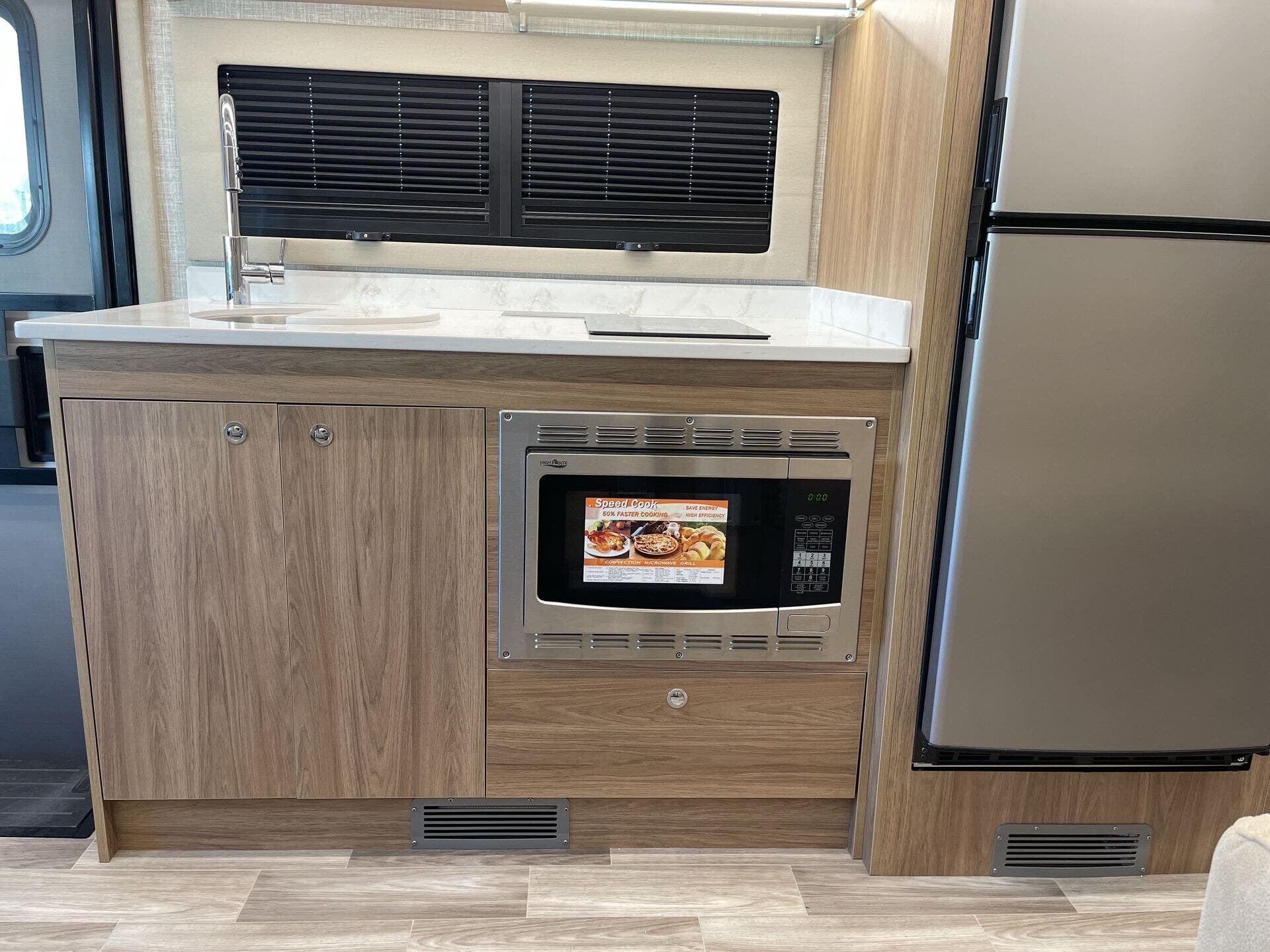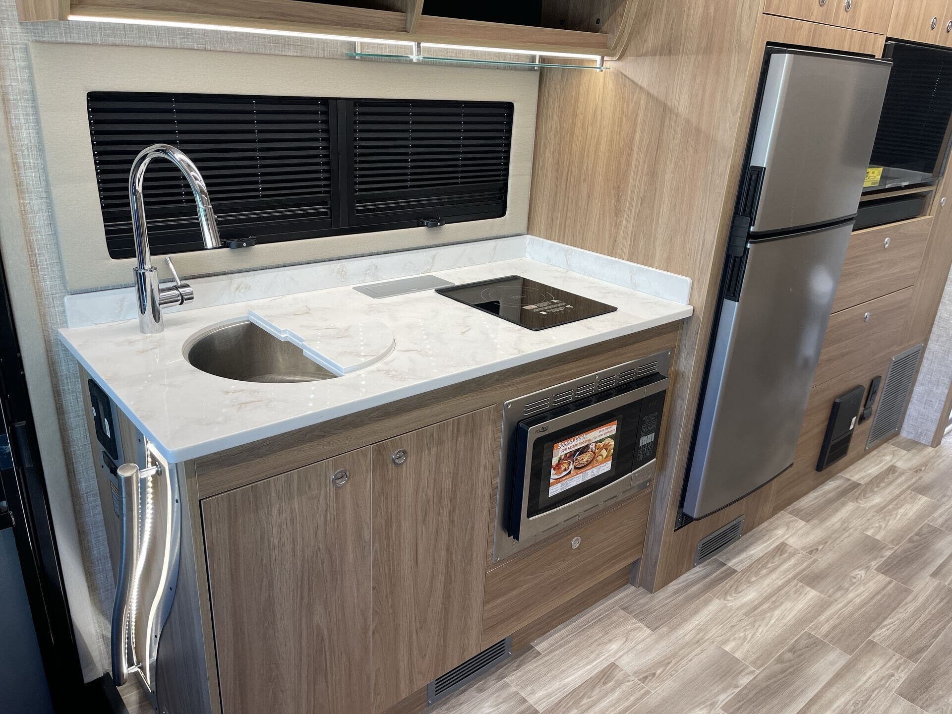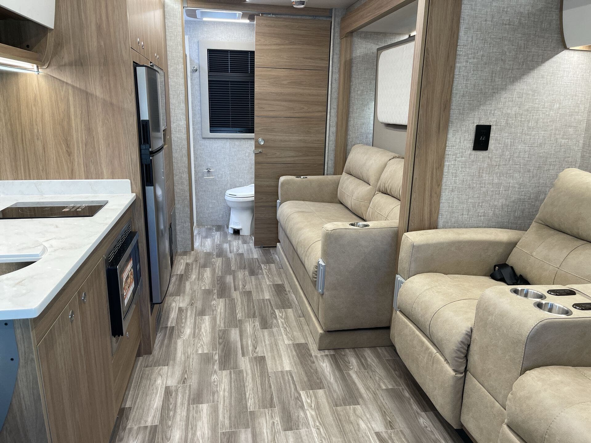Inside, the Wayfarer 25XRW boasts a thoughtfully designed floor plan that maximizes space and comfort. The rear bedroom features a queen-size Murphy bed, allowing for a spacious living area during the day and a comfortable sleeping space at night. Overhead cabinets, LED reading lights, and a wall-mounted TV add to the bedroom's functionality. The front of the coach includes a standard overhead bunk, providing additional sleeping accommodations, with an option to replace it with an overhead entertainment center. The living area offers theater seating and a removable pedestal table, creating a versatile space for dining and relaxation. The kitchen is equipped with a two-burner cooktop, convection microwave, solid surface countertops, and ample storage, ensuring a convenient cooking experience on the road.
