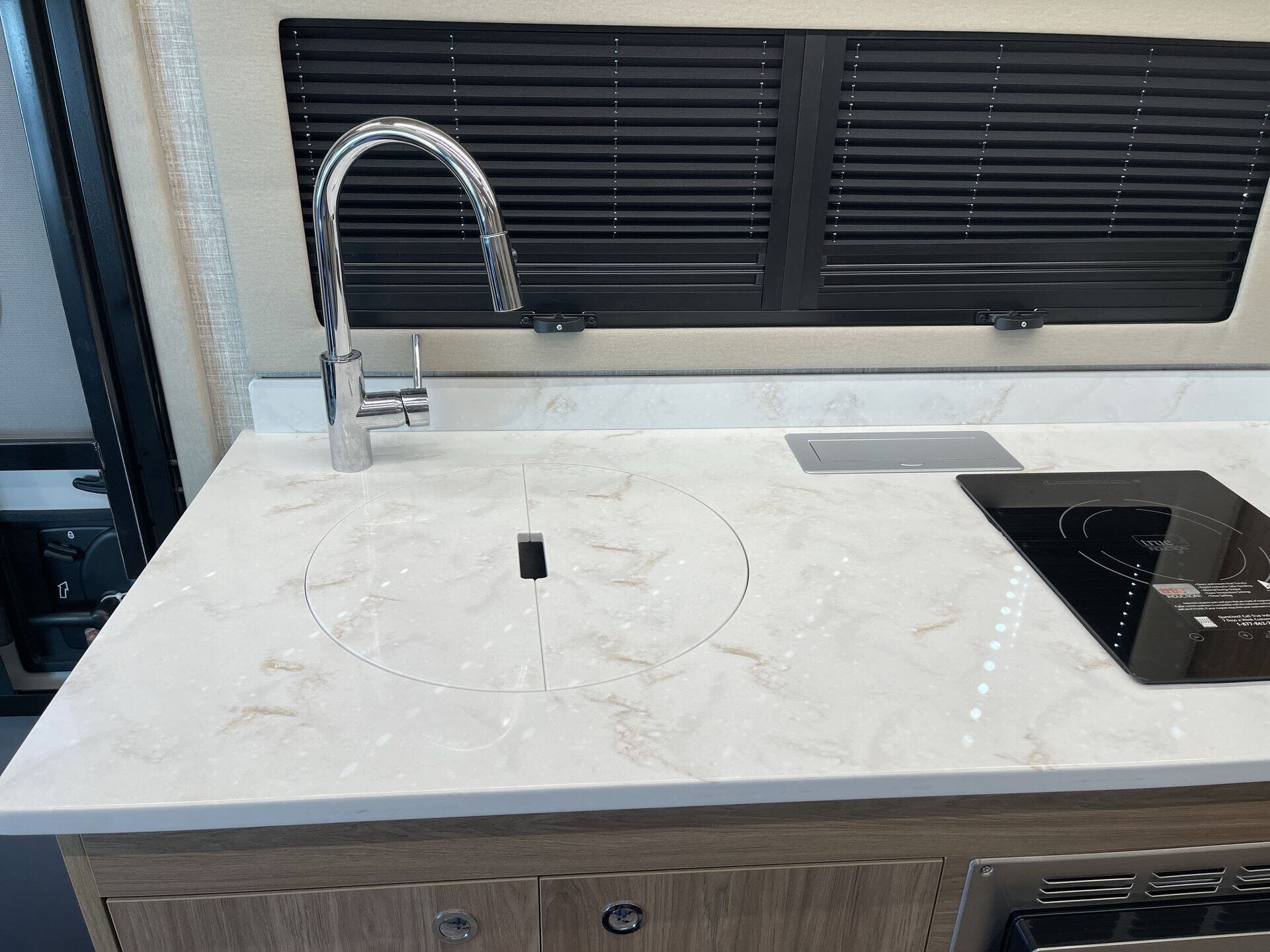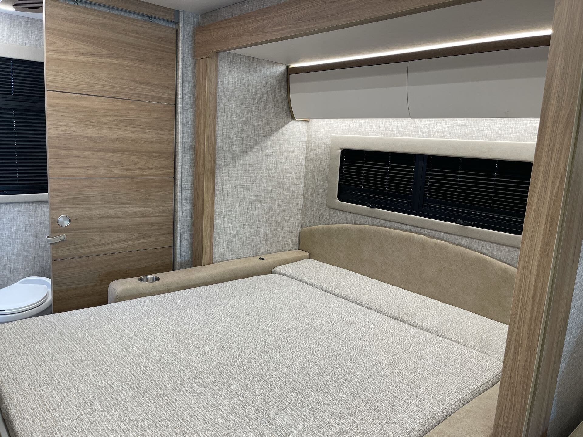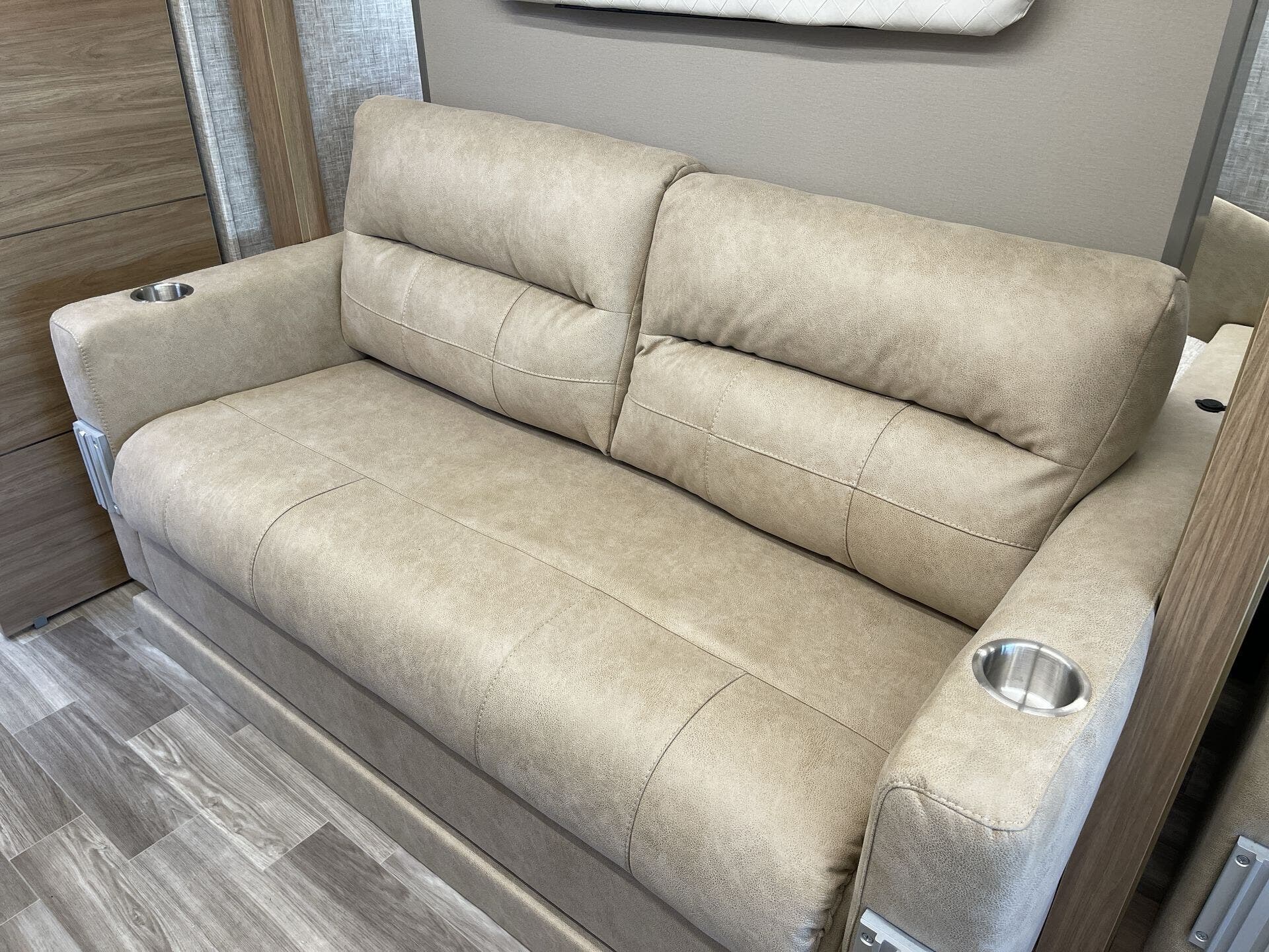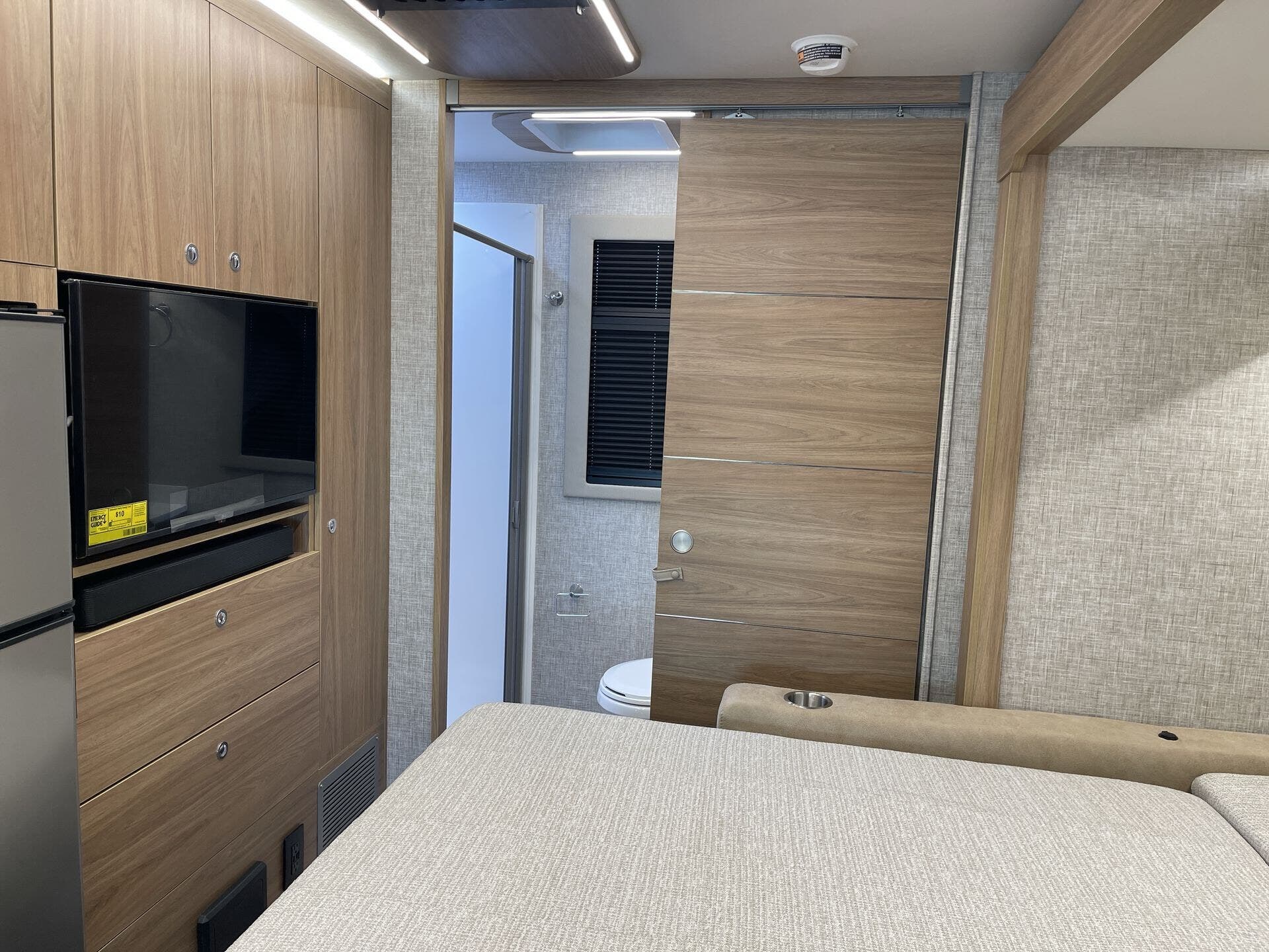 Inside, the Wayfarer 25XRW boasts a thoughtfully designed floor plan that maximizes space and comfort. The rear bedroom features a queen-size Murphy bed, allowing for a spacious living area during the day and a comfortable sleeping space at night. Overhead cabinets, LED reading lights, and a wall-mounted TV add to the bedroom's functionality. The front of the coach includes a standard overhead bunk, providing additional sleeping accommodations, with an option to replace it with an overhead entertainment center. The living area offers theater seating and a removable pedestal table, creating a versatile space for dining and relaxation. The kitchen is equipped with a two-burner cooktop, convection microwave, solid surface countertops, and ample storage, ensuring a convenient cooking experience on the road.
