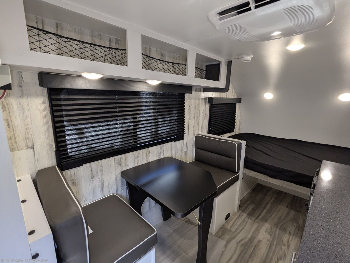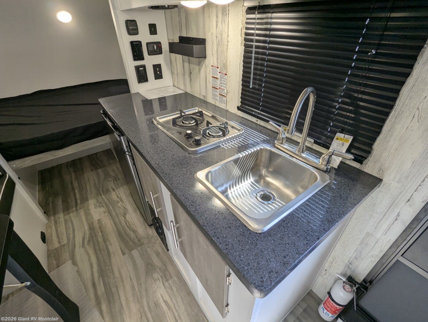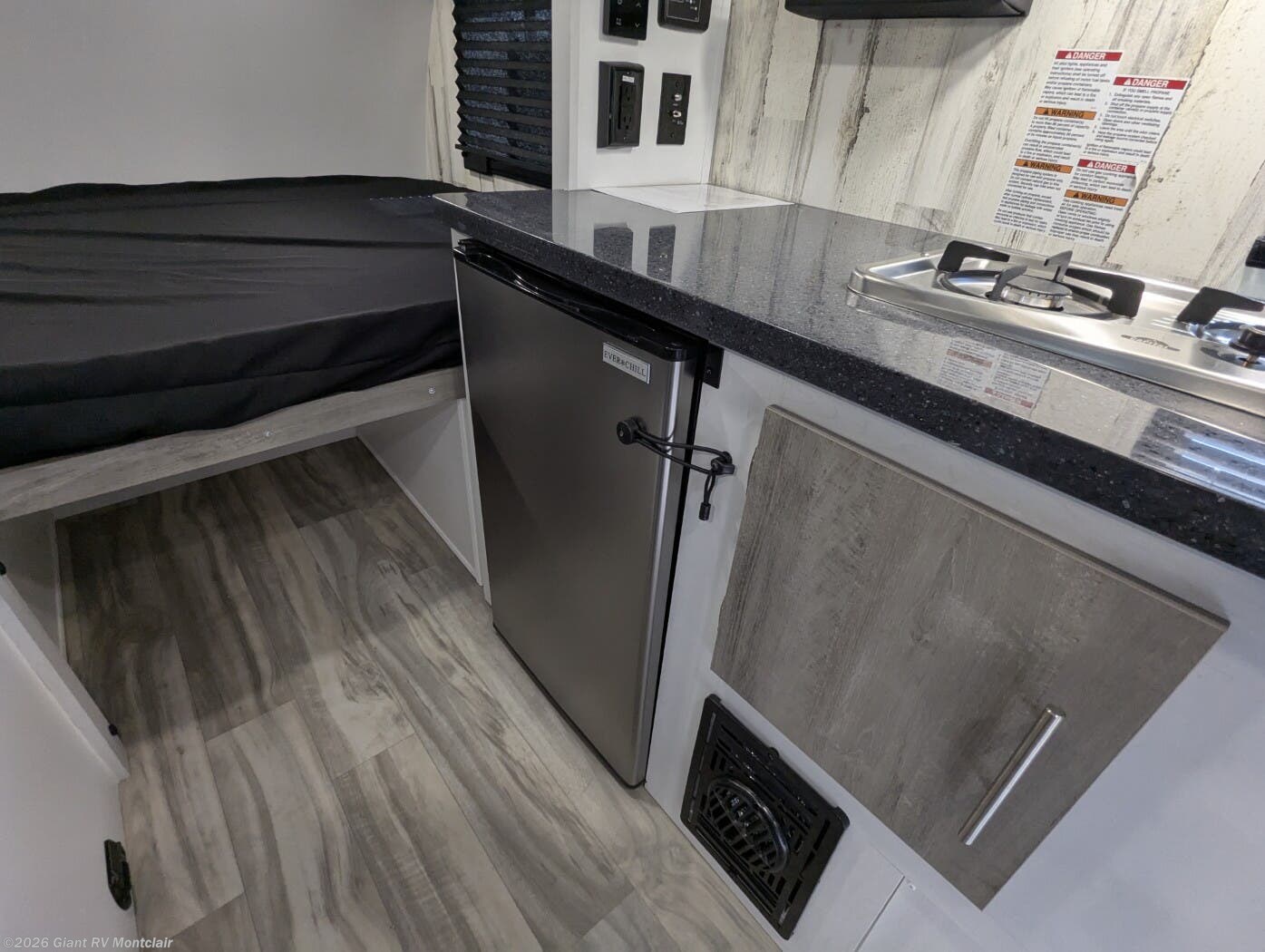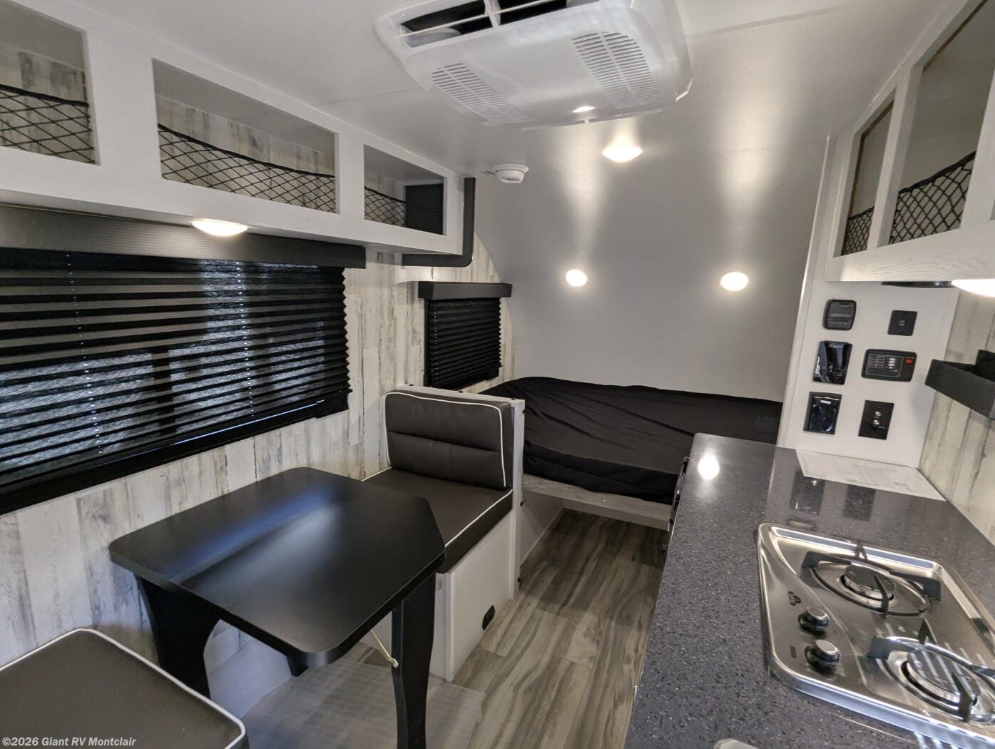 - Modern Amenities: Features air conditioning, a kitchen with a 3.3 cu ft refrigerator, two-burner cooktop, and a 200W solar panel for off-grid convenience.