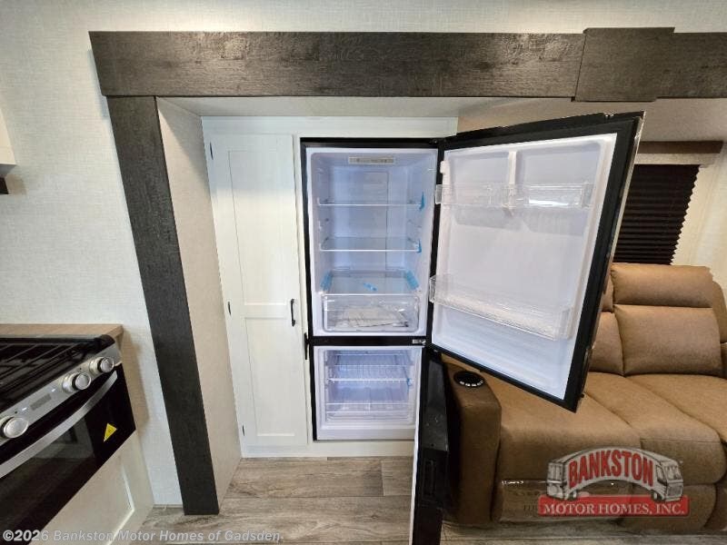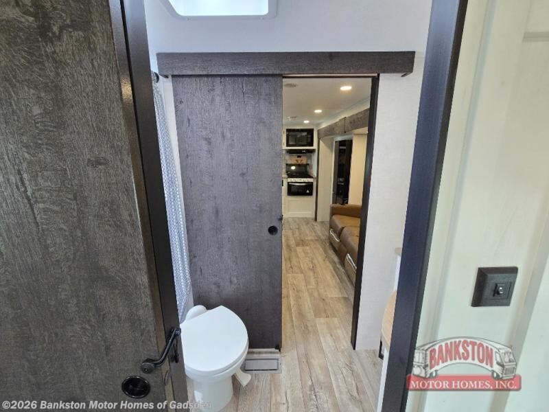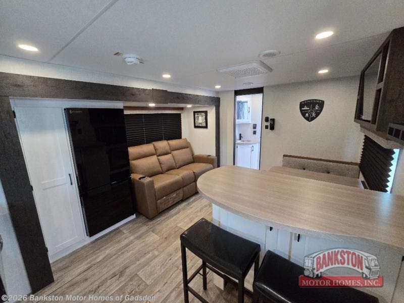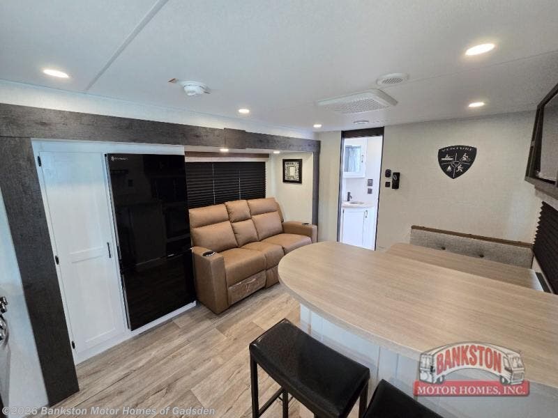 You'll love every minute spent in this dual entry travel trailer. The front master bedroom includes one of these doors, along with a Sleep Tight queen bed, dual wardrobes, and easy access into the walk-thru bath. Your crew can relax on the theater seating within the large slide out, play a game at the Sit N' Slide table with flipside reversible cushions, or dine at the bartop with stools. There is also a rear kitchen with ample counter space. Head outdoors to enjoy the 20' power awning in your camp chairs!