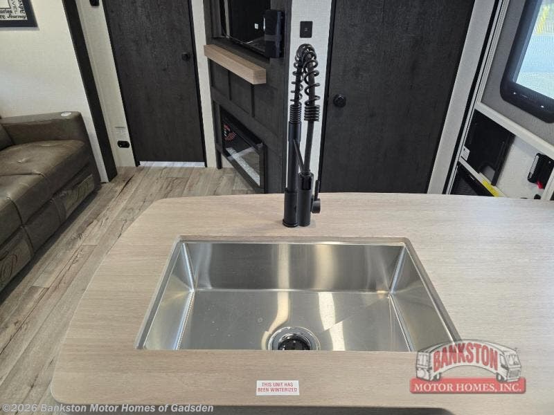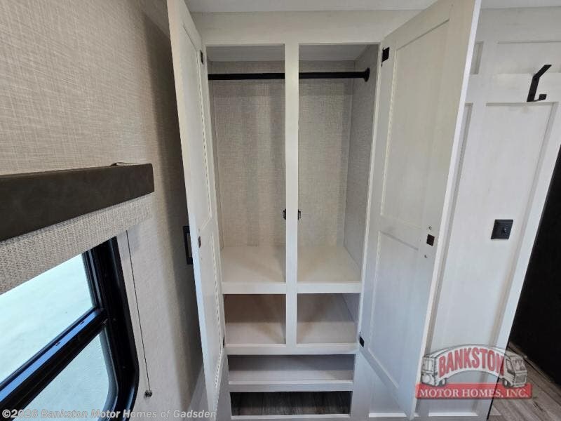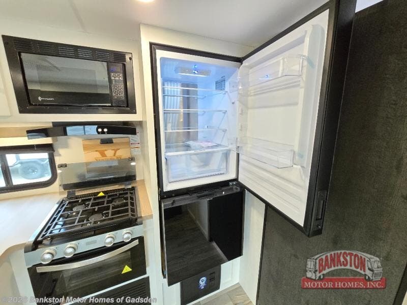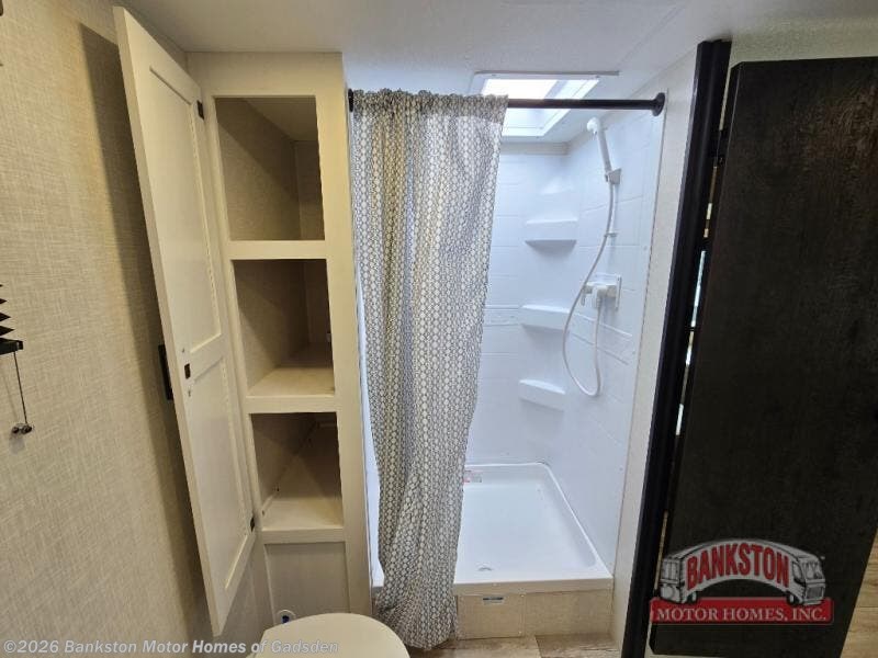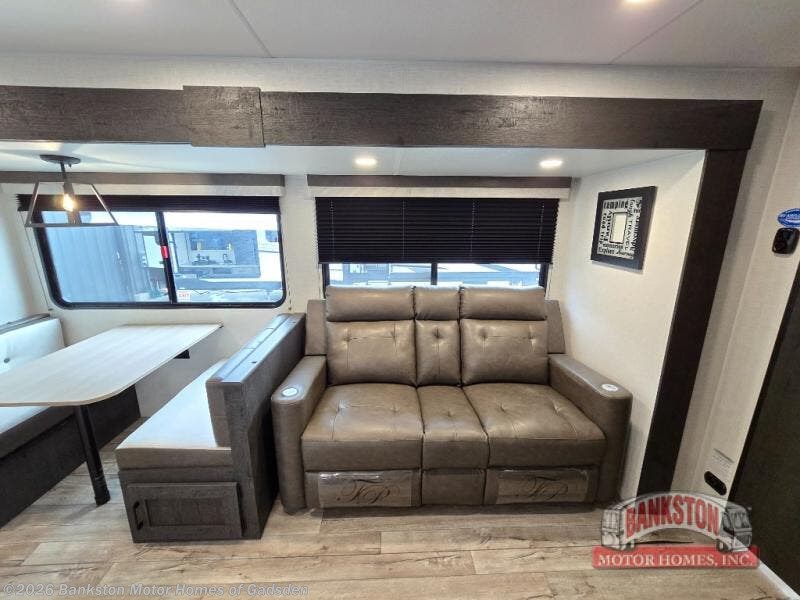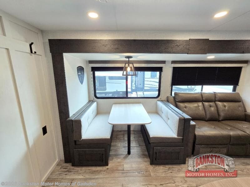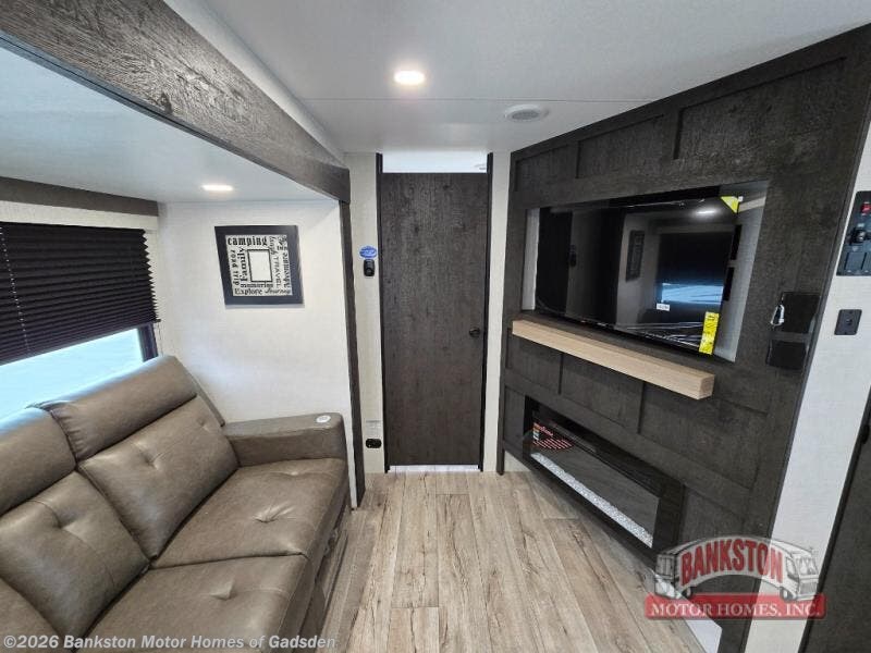 You will be enchanted by this travel trailer features! Starting with the rear bathroom which offers a convenient linen closet, keeping your essentials within reach. Moving forward to the kitchen area, the sit nā slide booth dinette is a fun and functional spot for meals or socializing, also the kitchen is well-equipped with a 10 cu refrigerator, three-burner cooktop, and pantry, making you feel right at home. For the entertainment and leisure, the sofa provides a comfortable spot to relax, and the fireplace adds a cozy touch to the interior plus, the 40ā TV is perfect for family movie nights or enjoying your favorite shows on the go. The front bedroom offers a spacious queen bed, overhead cabinet, and wardrobe. The exterior awning provides shade and protection from the elements, while the pass-through storage will provide ample space for your outdoor gear and equipment.